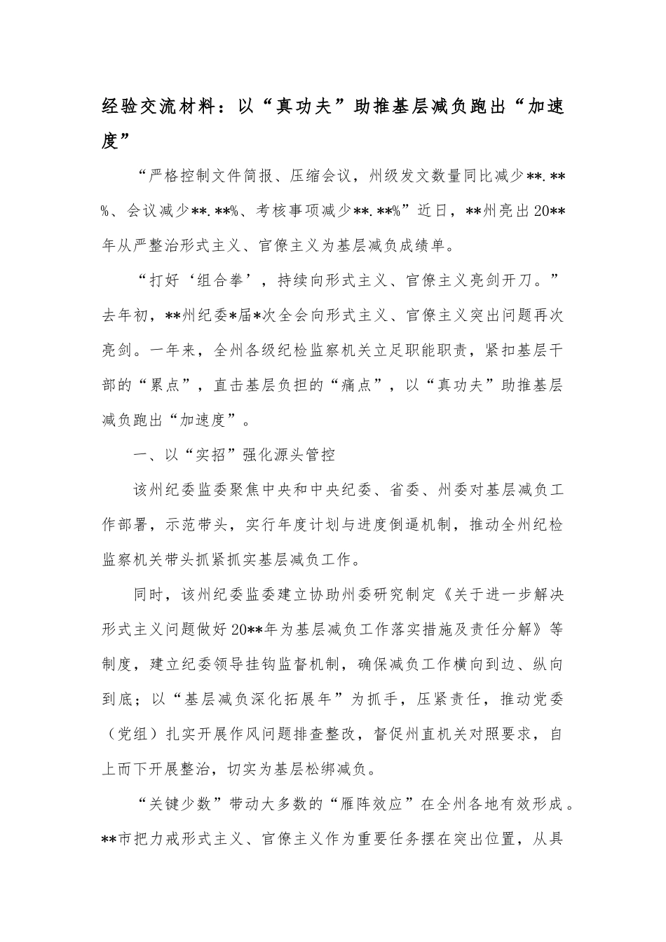 经验交流材料:以“真功夫”助推基层减负跑出“加速度”“严格控制文件简报、压缩会议,州级发文数量同比减少**.**%、会议减少**.**%、考核事项减少**.**%”近日,**州亮出20**年从严整治形式主义、官僚主义为基层减负成绩单。“打好‘组合拳’,持续向形式主义、官僚主义亮剑开刀。”去年初,**州纪委*届*次全会向形式主义、官僚主义突出问题再次亮剑。一年来,全州各级纪检监察机关立足职能职责,紧扣基层干部的“累点”,直击基层负担的“痛点”,以“真功夫”助推基层减负跑出“加速度”。一、以“实招”强化源头管控该州纪委监委聚焦中央和中央纪委、省委、州委对基层减负工作部署,示范带头,实行年度计划与进度倒逼机制,推动全州纪检监察机关带头抓紧抓实基层减负工作。同时,该州纪委监委建立协助州委研究制定《关于进一步解决形式主义问题做好20**年为基层减负工作落实措施及责任分解》等制度,建立纪委领导挂钩监督机制,确保减负工作横向到边、纵向到底;以“基层减负深化拓展年”为抓手,压紧责任,推动党委(党组)扎实开展作风问题排查整改,督促州直机关对照要求,自上而下开展整治,切实为基层松绑减负。“关键少数”带动大多数的“雁阵效应”在全州各地有效形成。**市把力戒形式主义、官僚主义作为重要任务摆在突出位置,从具体人和事抓起,重点围绕文山会海、检查散滥、为官不为、项目脱离实际等问题,采取一线监督、派驻监督、巡察监督、聘请党风廉政监督员、融媒体监督等方式,形成全市“一盘棋”。二、以“硬招”提升监督质效“20**年,全州纪检监察机关共查处形式主义、官僚主义问题**件处理**人,给予党纪政务处分**人,通报曝光典型问题**批**起**人次”过去一年,**州把查摆形式主义、官僚主义问题作为全面从严治党主体责任落实情况检查和巡视巡察监督的重要内容,精准有力施策,督促立行立改,紧盯不放、一抓到底。该州纪委监委要求各级纪检监察机关在查处领导干部严重违纪违法案件时,既要查清贪污腐败问题,又要审查形式主义、官僚主义问题。在此基础上,全州各级纪检监察机关发挥“*+*+*”监督执纪联动机制作用,构建“*+*+*”大监督工作格局,推进主体责任、专责监督同职能监督贯通融合。针对推进工作不力、“走过场”、“做虚功”、“假把式”等问题,该州纪委监委加强对整治工作的全程监督,造成不良后果的实行责任倒查,并有效利用纪律检查建议、监察建议督促相关单位完善制度、堵塞漏洞。三、以“真招”激励担当作为该州坚持“三个区分开来”,运用监督执纪“四种形态”精准规范追责问责,既防止问责不力,又防止问责泛化、简单化。20**年,全州共开展“四项谈话”****人,运用“四种形态”处理****人次,问责党组织**个干部***人。制定出台《**州容错纠错办法(试行)》,保护和激发基层干部的干事热情,并进一步树立改进作风、真抓实干的鲜明导向。一年来,全州纪检监察机关为*名干部容错纠错,为**名干部不实信访举报进行澄清反馈,为担当者担当、为负责者负责、为干事者撑腰,推动广大干部充满激情、富于创造、勇于担当、敢为先锋。整治形式主义、官僚主义,需要下长功夫、硬功夫。将持续发力,发扬钉钉子精神,一步一步走下去,一锤一锤敲到底,让基层减负见到实效。