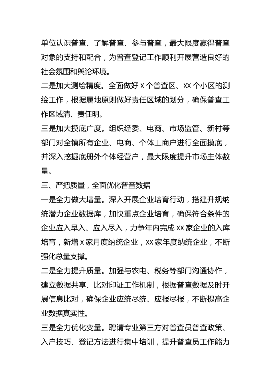 XX县第五次经济普查工作动员会上的表态发言尊敬的各位领导、同志们:这次普查是党的XX大胜利召开后,我国开展的首次大型国情国力普查,意义重大、影响深远。XX镇作为经济大镇,将坚决克服时间紧、任务重等各项问题,凝心聚力早谋划主动作为强落实,坚决打赢第五次全国经济普查攻坚战。一、高度重视,全面筑牢工作保障一是强化组织保障。在成立书记、镇长任双组长的五经普领导小组基础上,进一步制定我镇工作规划和进度安排,逐一细化任务、厘清责任、倒排工期,明确各任务、各环节的责任部门和责任人,确保各项工作有序推进。二是强化经费保障。设立五经普专项资金,根据工作情况实报实销,全力解决普查工作后顾之忧。三是强化人员保障。结合“三员”特点,集中抽调新村网格员担任引导员,选聘税务、市场监管等部门熟悉会计、财务人员担任指导员,抽调政治素质好、业务能力强、工作经验丰富的同志担任普查员,为普查数据精准全面提供人员保障。二、提早行动,全面落实工作筹备一是加大宣传力度。充分利用电子屏、宣传栏、公众号、微信群等宣传媒介开展形式多样的宣传动员,引导广大群众和单位认识普查、了解普查、参与普查,最大限度赢得普查对象的支持和配合,为普查登记工作顺利开展营造良好的社会氛围和舆论环境。二是加大测绘精度。全面做好X个普查区、XX个小区的测绘工作,根据属地原则做好责任区域的划分,确保普查工作区域清、责任明。三是加大摸底广度。组织经委、电商、市场监管、新村等部门对全镇所有企业、电商、个体工商户进行全面摸底,并深入挖掘底册外个体经营户,最大限度提升市场主体数量。三、严把质量,全面优化普查数据一是全力做大增量。深入开展企业培育行动,搭建升规纳统潜力企业数据库,加快重点企业培育,确保符合条件的企业应入早入、应入尽入,力争年内完成XX家企业的入库培育,新增X家月度纳统企业,XX家年度纳统企业,不断强化总量支撑。二是全力提升质量。加强与农电、税务等部门沟通协作,建立数据共享、比对印证工作机制,根据普查数据及时开展信息比对,确保企业应统尽统、应报尽报,不断提高企业数据真实性。三是全力优化变量。聘请专业第三方对普查员普查政策、入户技巧、登记方法进行集中培训,提升普查员工作能力提高普查效率和质量,在具体业务中指导企业和工商户向三产靠拢,最大限度提升三产占比。路虽远,行则必至;事虽难,做则必成。XX镇将不折不扣落实五经普领导小组各项工作要求,真抓实干、攻坚克难以绣花功夫把各项工作做扎实、做到位,为全县五经普工作顺利推进、圆满完成作出XX贡献。