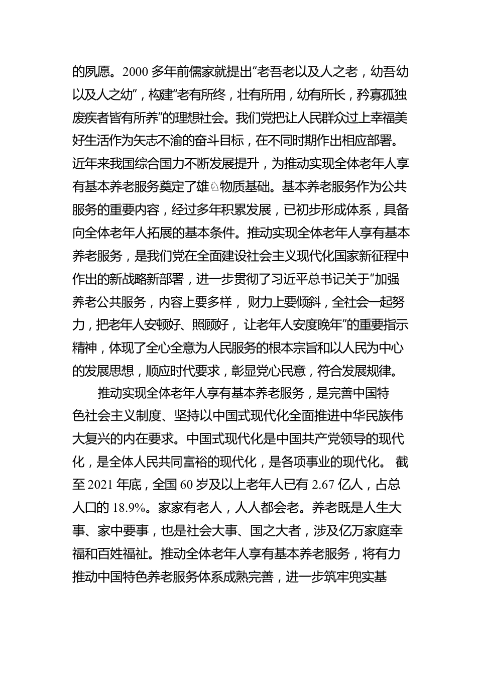 推动实现全体老年人享有基本养老服务李纪恒习近平总书记在党的二十大报告中明确提出实施积极应对人口老龄化国家战略,发展养老事业和养老产业,优化孤寡老人服务,推动实现全体老年人享有基本养老服务。这一重大部署,为我国养老服务发展明确了方向,提供了根本遵循,对于人口老龄化加剧形势下实现好、维护好、发展好最广大人民的根本利益,使人民群众获得感、幸福感、安全感更加充实、更有保障、更可持续具有重要意义。一、推动实现全体老年人享有基本养老服务是谱写全面建设社会主义现代化国家新篇章的重要内容基本养老服务是由国家直接提供或者通过一定方式支持相关主体向老年人提供的,旨在实现老有所养、老有所依必需的普惠性、基础性、兜底性服务,包括物质帮助、照护服务、关爱服务等内容。推动全体老年人享有基本养老服务,集中体现了以习近平同志为核心的党中央对我国老有所养制度顶层设计的重大基础性安排。推动实现全体老年人享有基本养老服务,是新时代践行党的初心使命、体现我国社会主义本质和制度优越性的重要方面。我们党自成立之日起,就把为中国人民谋幸福、为中华民族谋复兴作为自己的初心使命,让老百姓过上好日子是我们一切工作的出发点和落脚点。老有所养是全体中国人民的夙愿。2000多年前儒家就提出“老吾老以及人之老,幼吾幼以及人之幼”,构建“老有所终,壮有所用,幼有所长,矜寡孤独废疾者皆有所养”的理想社会。我们党把让人民群众过上幸福美好生活作为矢志不渝的奋斗目标,在不同时期作出相应部署。近年来我国综合国力不断发展提升,为推动实现全体老年人享有基本养老服务奠定了雄物质基础。基本养老服务作为公共♘服务的重要内容,经过多年积累发展,已初步形成体系,具备向全体老年人拓展的基本条件。推动实现全体老年人享有基本养老服务,是我们党在全面建设社会主义现代化国家新征程中作出的新战略新部署,进一步贯彻了习近平总书记关于“加强养老公共服务,内容上要多样,财力上要倾斜,全社会一起努力,把老年人安顿好、照顾好,让老年人安度晚年”的重要指示精神,体现了全心全意为人民服务的根本宗旨和以人民为中心的发展思想,顺应时代要求,彰显党心民意,符合发展规律。推动实现全体老年人享有基本养老服务,是完善中国特色社会主义制度、坚持以中国式现代化全面推进中华民族伟大复兴的内在要求。中国式现代化是中国共产党领导的现代化,是全体人民共同富裕的现代化,是各项事业的现代化。截至2021年底,全国60岁及以上老年人已有2.67亿人,占总人口的18.9%。家家有老人,人人都会老。养老既是人生大事、家中要事,也是社会大事、国之大者,涉及亿万家庭幸福和百姓福祉。推动全体老年人享有基本养老服务,将有力推动中国特色养老服务体系成熟完善,进一步筑牢兜实基本民生底线,巩固和完善我国建成的世界上规模最大的社会保障体系,完善中国特色社会主义制度。推动全体老年人享有基本养老服务,把老年人安顿好、照顾好,有助于家庭和睦、代际和顺、社会和谐,促进新时代社会共建共治共享,推进国家治理体系和治理能力现代化。推动全体老年人享有基本养老服务,充分回应全体人民共同富裕的呼声愿望,优化老年人收入分配结构,改善老年人养老服务支付能力,让全体老年人共享经济社会发展成果,是中国式现代化在养老服务领域的具体实现。推动实现全体老年人享有基本养老服务,是健全覆盖全生命周期的人口服务体系、促进人口长期均衡发展的必然要求。人口问题事关中华民族永续发展和伟大复兴。习近平总书记多次强调人口问题始终是我国面临的全局性、长期性、战略性问题,深刻指出近年来我国人口发展出现了一些显著变化,既面临人口众多的压力,又面临人口结构转变带来的挑战。推动全体老年人享有基本养老服务,将独生子女家庭、计划生育特殊家庭等各类老年人纳入基本养老服务统一保障范围,将进一步健全覆盖全生命周期的人口服务体系,积极应对人口结构转变带来的老年人照料风险挑战。推动全体老年人享有基本养老服务,做好老有所养的制度性安排,可以缓解社会普遍存在的养老焦虑,减轻年轻人“上有老、下有小”的家庭压力,稳定人们的养老...