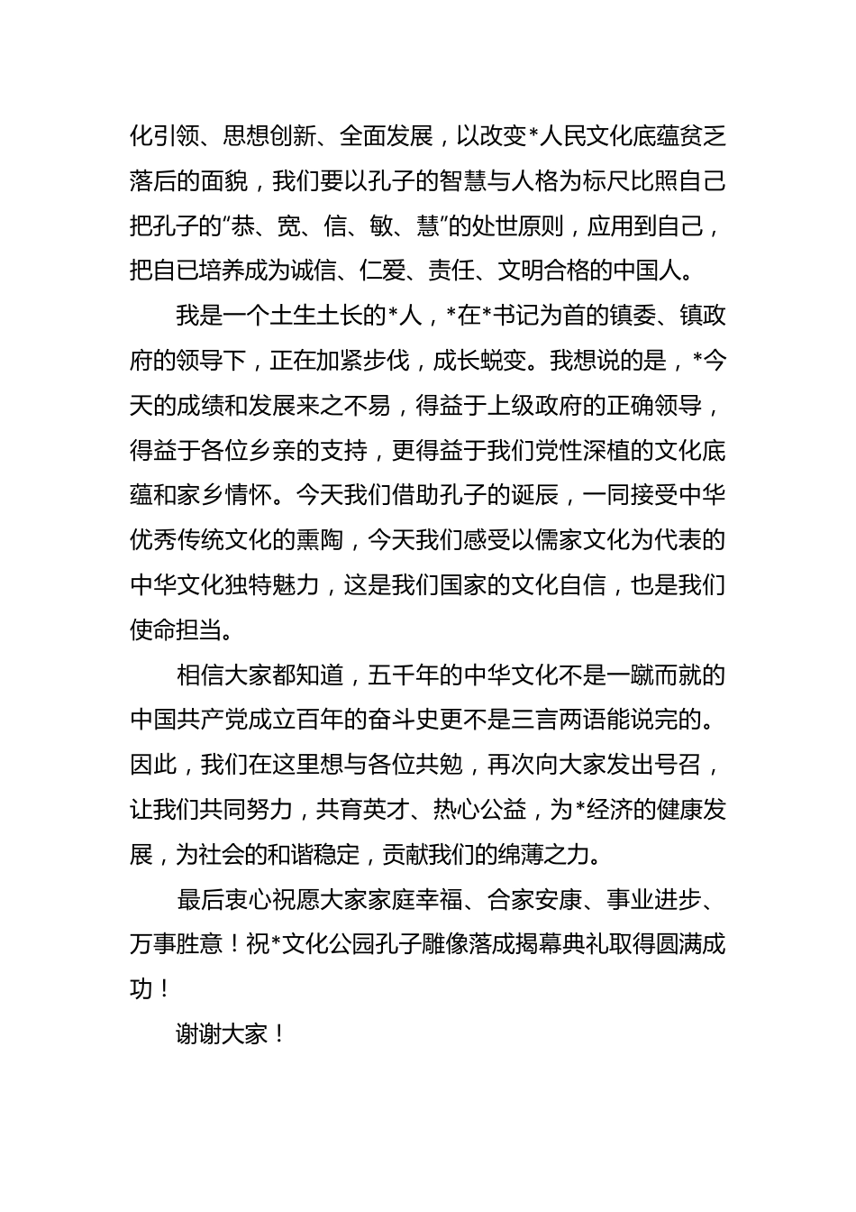 相关领导在文化公园孔子像落成揭幕典礼上的致辞尊敬的各位领导、各位嘉宾,亲爱的会员们、同志们:大家早上好!金秋时节,秋高气爽。在迎来中国著名的思想家、教育家孔子诞辰之际,我们相聚在这里,共同参与*文化公园孔子雕像落成揭幕典礼。首先让我代表*老爷理事会,向关心支持*公益事业和传统文化的传承与发展的党政领导、社会贤达表示崇高的敬意!并致以热烈的掌声!向出席本次会议的领导、嘉宾、朋友们表示诚挚的欢迎!二千五百年前,一位圣哲降生于东方,他奔波于中原大地,用儒家学说唤醒沉睡的人们,在中华文明史上书写了“仁义道德”四个不朽大字,此时此刻,天籁之音,在我们耳边回响,我们背诵孔子的话“知之为知之,不知之为不知,是知也”;“三人同行,必有我师焉”;“择善者而行之,其不善者而改之”。可以说孔子的思想对中国文明产生了深远而巨大的影响。他的思想精华早已融入我们民族的血脉,沉淀在我们的生命中。他的精神影响一代代中华儿女,影响千千万万仁人志士。今天我们在这里除了尊崇和信仰孔子,目的是为了更好地传承和弘扬国学,教育后人求知处世之道,积极开展以文化引领、思想创新、全面发展,以改变*人民文化底蕴贫乏落后的面貌,我们要以孔子的智慧与人格为标尺比照自己把孔子的“恭、宽、信、敏、慧”的处世原则,应用到自己,把自已培养成为诚信、仁爱、责任、文明合格的中国人。我是一个土生土长的*人,*在*书记为首的镇委、镇政府的领导下,正在加紧步伐,成长蜕变。我想说的是,*今天的成绩和发展来之不易,得益于上级政府的正确领导,得益于各位乡亲的支持,更得益于我们党性深植的文化底蕴和家乡情怀。今天我们借助孔子的诞辰,一同接受中华优秀传统文化的熏陶,今天我们感受以儒家文化为代表的中华文化独特魅力,这是我们国家的文化自信,也是我们使命担当。相信大家都知道,五千年的中华文化不是一蹴而就的中国共产党成立百年的奋斗史更不是三言两语能说完的。因此,我们在这里想与各位共勉,再次向大家发出号召,让我们共同努力,共育英才、热心公益,为*经济的健康发展,为社会的和谐稳定,贡献我们的绵薄之力。最后衷心祝愿大家家庭幸福、合家安康、事业进步、万事胜意!祝*文化公园孔子雕像落成揭幕典礼取得圆满成功!谢谢大家!