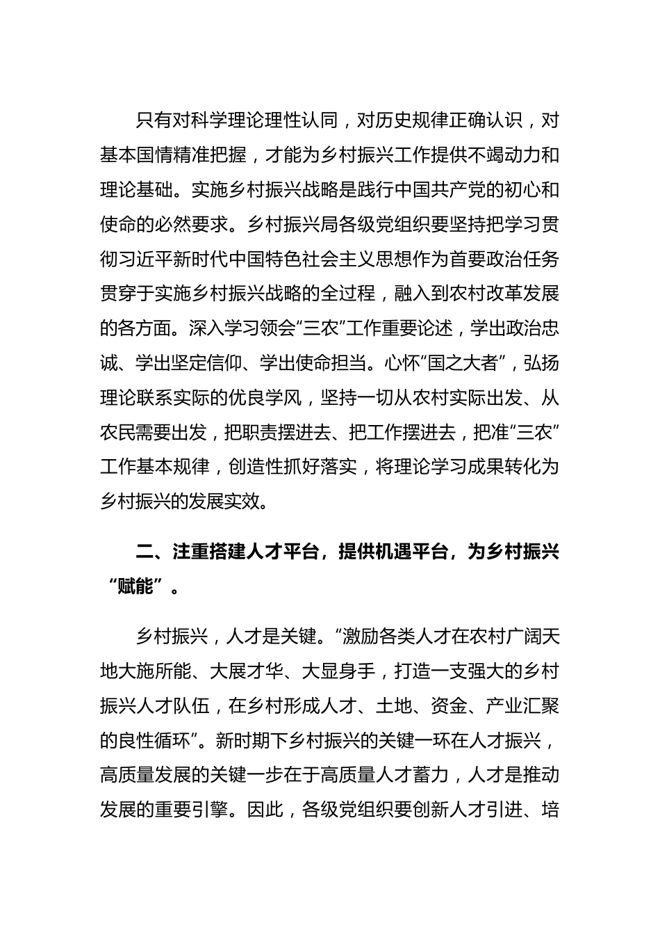 乡村振兴局局长参加2023年主题教育集中学习时的发言根据主题教育工作安排,局党组学习贯彻习近平新时代中国特色社会主义思想主题教育集中学习。会前,认真研读党的XX大报告和党章,认真学习《习近平著作选读》、《习近平新时代中国特色社会主义思想专题摘编》等学习材料,系统全面学习习近平总书记关于乡村振兴工作的重要指示批示,坚持读原著、学原文、悟原理,不断加深对党的创新理论的理解和把握。刚刚,各党组成员围绕着各自学习体会结合分管领域工作进行了很好的交流,也为全局上下实现主题教育高质量开局提供了样板。下面,我结合自身学习感悟,谈以下体会:“三农”稳,天下安。当前,“三农”工作重心历史性地转向全面推进乡村振兴。实施乡村振兴战略,是解决新时代我国社会主要矛盾、实现第二个百年奋斗目标、实现中华民族伟大复兴中国梦的必然要求。为此,乡村振兴局系统的各级党组织要结合主题教育这个有力契机和良好平台,进一步加强理论武装、搭建人才平台、坚定文化自信,久久为功,全面推进乡村全面振兴。一、不断强化理论武装,提升政治站位,为乡村振兴“强根”。只有对科学理论理性认同,对历史规律正确认识,对基本国情精准把握,才能为乡村振兴工作提供不竭动力和理论基础。实施乡村振兴战略是践行中国共产党的初心和使命的必然要求。乡村振兴局各级党组织要坚持把学习贯彻习近平新时代中国特色社会主义思想作为首要政治任务贯穿于实施乡村振兴战略的全过程,融入到农村改革发展的各方面。深入学习领会“三农”工作重要论述,学出政治忠诚、学出坚定信仰、学出使命担当。心怀“国之大者”,弘扬理论联系实际的优良学风,坚持一切从农村实际出发、从农民需要出发,把职责摆进去、把工作摆进去,把准“三农”工作基本规律,创造性抓好落实,将理论学习成果转化为乡村振兴的发展实效。二、注重搭建人才平台,提供机遇平台,为乡村振兴“赋能”。乡村振兴,人才是关键。“激励各类人才在农村广阔天地大施所能、大展才华、大显身手,打造一支强大的乡村振兴人才队伍,在乡村形成人才、土地、资金、产业汇聚的良性循环”。新时期下乡村振兴的关键一环在人才振兴,高质量发展的关键一步在于高质量人才蓄力,人才是推动发展的重要引擎。因此,各级党组织要创新人才引进、培养机制平台,突破制约引才、用才及成才的“瓶颈”。对紧缺人才采取“不拘一格”的“柔性引进”方式,持续加强对人才的关心和关注。优化多元人才培养结构,引进培养人才以服务当前经济发展所需为主,亦需“风物长宜放眼量”,持续优化营商及生活环境,以长远目光选育好人才“种苗”,注重“过程化”考察,实行“阶段化加码式”培养。三、始终保持文化自信,赓续红色基因,为乡村振兴“铸魂”。乡村振兴,既要塑形,也要铸魂,补齐乡村“精神短板”让精神文明润心聚气,为建设美丽宜人、业兴人和的社会主义新农村提供坚强思想保障。一方水土,一方文化。为乡村建设铸魂,必须推进乡村文化振兴,让乡村绽放精神文明之花,激发乡村建设内生动力。乡村振兴局各级党组织要加强文化阵地建设,以群众需求为导向,以群众满意为目标,以群众参与为抓手,建设文化礼堂、文化大院、乡村阅览室、老年活动中心、基层文化站等公共文化设施为群众搭建学习场所和交流平台,让群众的“口袋”和“脑袋”同时富起来。扩大文化产品与服务供给,广泛开展中国特色社会主义和中国梦宣传教育活动,弘扬和践行社会主义核心价值观,用先进文化占领农村思想文化阵地。同志们,今年是全面贯彻落实党的XX大精神开局之年,在以习近平同志为核心的党中央的坚强领导下,我们要顺势而为,乘势而进,以积极向前的姿态,以全力以赴的态度,通过主题教育激发的精神动力转化为具体工作的实际行动,奋力推进乡村振兴工作更上新台阶。