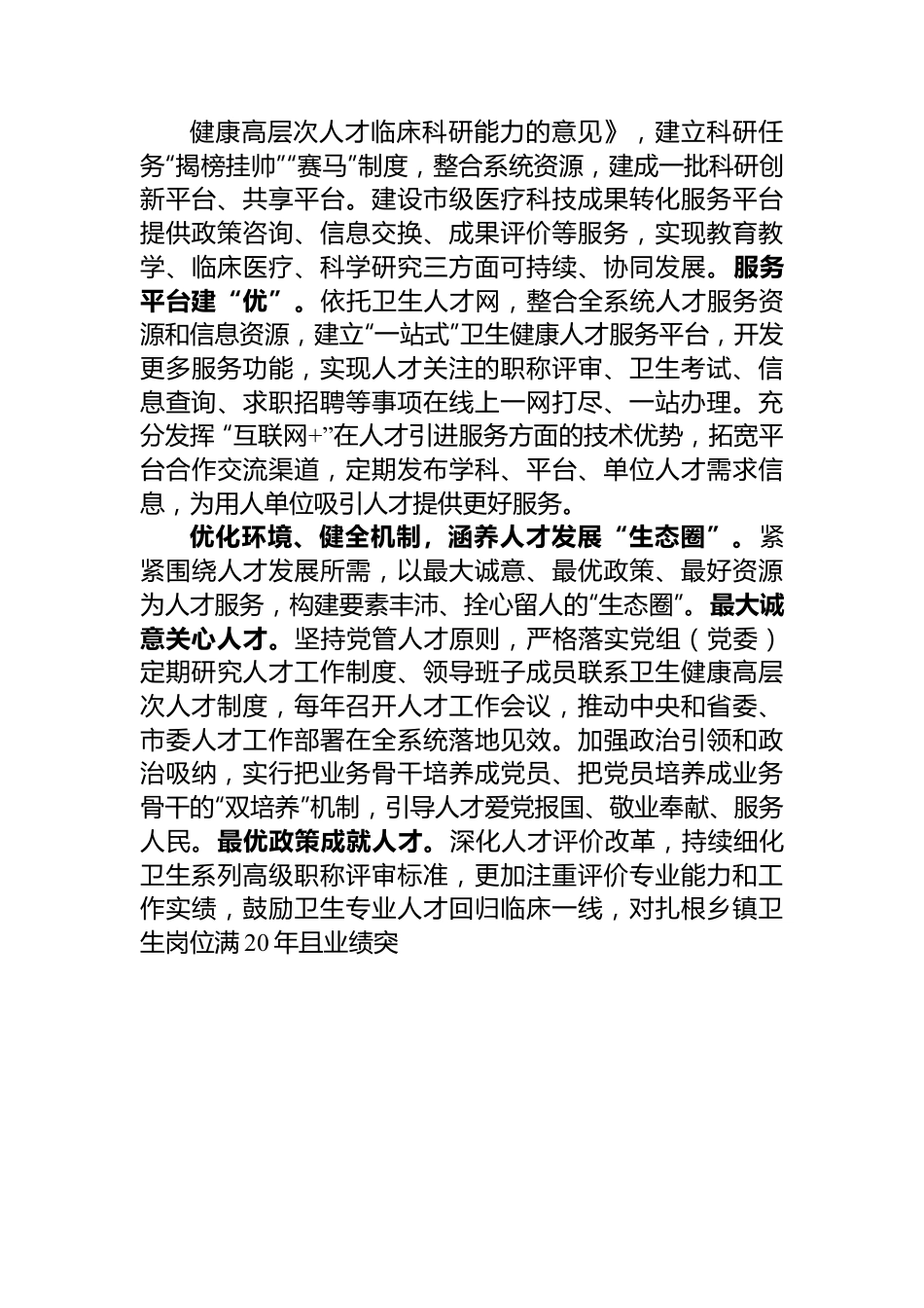 在全省卫健系统人才工作座谈会上的发言各位领导,同志们:全国、全市组织工作会议强调,“强化现代化建设人才支撑”“全方位培养、引进、用好人才”,为做好新时代卫生健康人才工作指明了前进方向、提供了重要遵循。全市卫生健康系统将深入贯彻习近平总书记关于人才工作的重要思想,坚决落实全国、全市组织工作会议精神,坚持面向人民生命健康的目标方向,以更高标准、更大力度、更实举措建设一流人才队伍、一流人才平台、一流人才生态,打造卫生健康人才聚集新高地,为卫生健康事业高质量发展蓄势赋能。根据会议安排,现将有关工作进展情况汇报如下:站位全局、科学谋划,修好人才队伍“蓄水池”。遵循人才成长规律和特点,立足实践培养人才,不拘一格引进人才,全力抓好人才“第一资源”。以高层次人才为头雁领航。深入实施卫生健康高层次人才专项计划,每年选育领军人才、学科带头人青年骨干人才。紧盯国家级人才计划项目选拔标准和要求,对标对表发掘、培养、引进一批拔尖人才,特别是对冲击院士人选实行“一人一策”,建立需求清单,加大支持保障力度。建立海外人才库,定期举办海外医学人才论坛,以才荐才、以才引才,加强海外高层次人才引进。以青年人才为源头活水。制定青年人才招引计划,强化政策支持,发挥专家圈子广、人脉熟的优势,千方百计把发展需要的青年人才招引进来。健全青年人才选拔培养机制,及早选苗、大胆使用,鼓励和吸纳青年人才积极参与医学科技创新重点工作,提高青年人才在各类人才工程、科研项目中的入选比例,开展优秀青年创新团队建设,全方位信任、帮助青年人才成长,支持青年人才挑大梁、唱主角,助力青年人才成长为中坚力量。以急需人才为基础支撑。加强基层卫生人才培养,出台《医师下基层服务管理办法》,继续开展农村订单定向免费本科医学生培养等项目,引导人才向基层一线流动,促进基层人才增量提质。加强公共卫生人才培养,实施公共卫生人才培养壮大行动,完善疾控机构与医疗机构人员柔性流动制度,培养引进一批疫情分析研判、流行病学调查、实验室检验检测等方面的专业人才。加强中医药人才培养,实施中医药特色人才培养工程加强中医药专家学术经验继承、传承工作室建设等师承教育,培训一批中医全科医生和中医馆骨干人才。筑巢引凤、赋能提质,建设人才成长“孵化器”。充分发挥平台作为吸引人才的“磁铁”、培养人才的“摇篮”、展示人才的“舞台”效能,积极推进临床、科研、服务等平台建设,让人才干事有保障、科研有条件、事业能发展。项目平台建“强”。借助国家区域医疗中心、国家医学研究中心、国家卫生健康委重点实验室和芙蓉实验室等重大项目平台,按照“大平台大团队大项目大成果”的思路,加快集聚一批能够推动学科能力提升、带动医学科技发展的创新团队,抢占发展制高点、把握发展主动权,加快形成人才高地重要支点和雁阵格局。研发平台建“精”。出台《关于进一步提升卫生健康高层次人才临床科研能力的意见》,建立科研任务“揭榜挂帅”“赛马”制度,整合系统资源,建成一批科研创新平台、共享平台。建设市级医疗科技成果转化服务平台提供政策咨询、信息交换、成果评价等服务,实现教育教学、临床医疗、科学研究三方面可持续、协同发展。服务平台建“优”。依托卫生人才网,整合全系统人才服务资源和信息资源,建立“一站式”卫生健康人才服务平台,开发更多服务功能,实现人才关注的职称评审、卫生考试、信息查询、求职招聘等事项在线上一网打尽、一站办理。充分发挥“互联网+”在人才引进服务方面的技术优势,拓宽平台合作交流渠道,定期发布学科、平台、单位人才需求信息,为用人单位吸引人才提供更好服务。优化环境、健全机制,涵养人才发展“生态圈”。紧紧围绕人才发展所需,以最大诚意、最优政策、最好资源为人才服务,构建要素丰沛、拴心留人的“生态圈”。最大诚意关心人才。坚持党管人才原则,严格落实党组(党委)定期研究人才工作制度、领导班子成员联系卫生健康高层次人才制度,每年召开人才工作会议,推动中央和省委、市委人才工作部署在全系统落地见效。加强政治引领和政治吸纳,实行把业务骨干培养成党员...