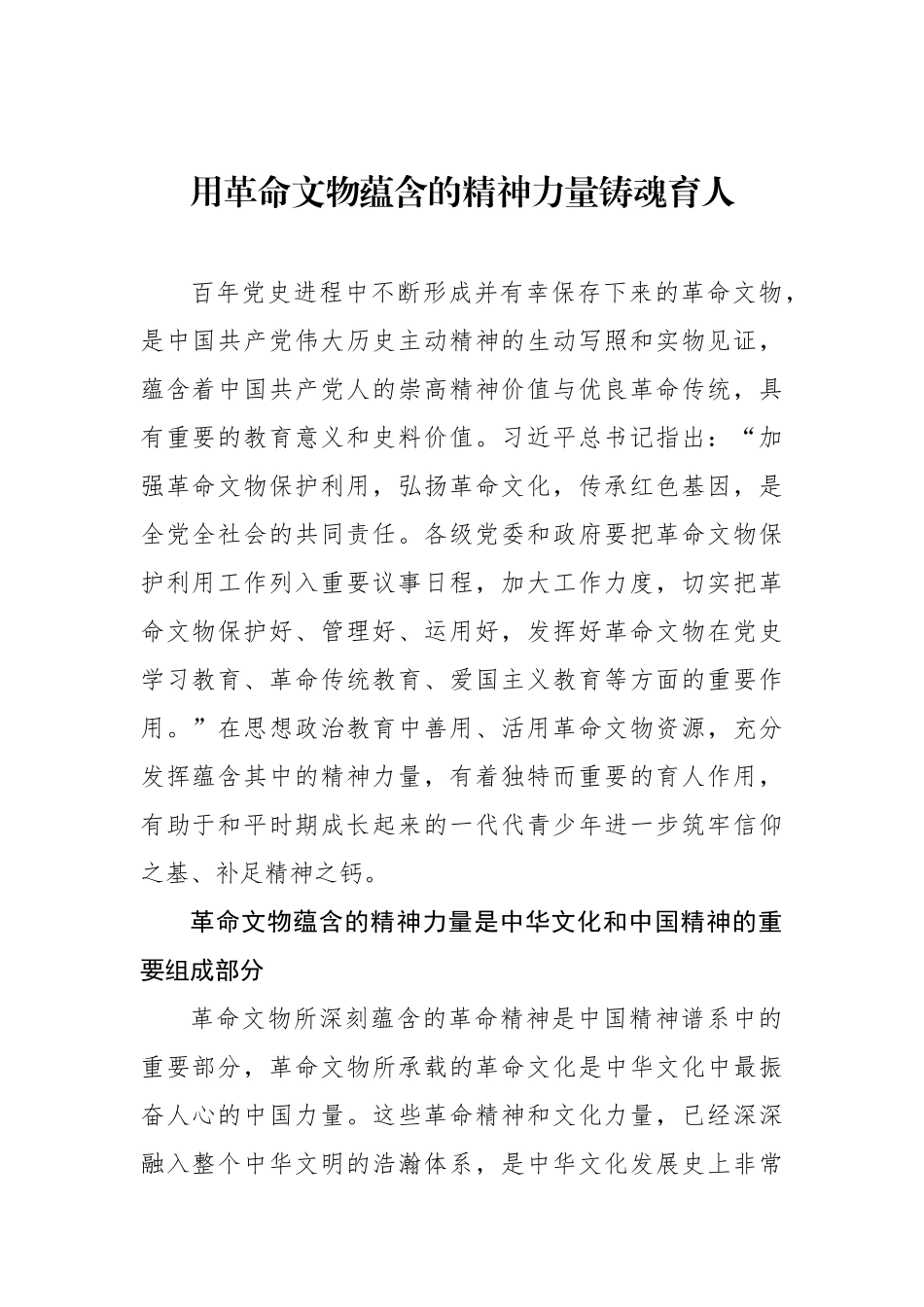 用革命文物蕴含的精神力量铸魂育人百年党史进程中不断形成并有幸保存下来的革命文物,是中国共产党伟大历史主动精神的生动写照和实物见证,蕴含着中国共产党人的崇高精神价值与优良革命传统,具有重要的教育意义和史料价值。习近平总书记指出:“加强革命文物保护利用,弘扬革命文化,传承红色基因,是全党全社会的共同责任。各级党委和政府要把革命文物保护利用工作列入重要议事日程,加大工作力度,切实把革命文物保护好、管理好、运用好,发挥好革命文物在党史学习教育、革命传统教育、爱国主义教育等方面的重要作用。”在思想政治教育中善用、活用革命文物资源,充分发挥蕴含其中的精神力量,有着独特而重要的育人作用,有助于和平时期成长起来的一代代青少年进一步筑牢信仰之基、补足精神之钙。革命文物蕴含的精神力量是中华文化和中国精神的重要组成部分革命文物所深刻蕴含的革命精神是中国精神谱系中的重要部分,革命文物所承载的革命文化是中华文化中最振奋人心的中国力量。这些革命精神和文化力量,已经深深融入整个中华文明的浩瀚体系,是中华文化发展史上非常宝贵的精神财富,成为中华民族新的文明形态中的一个重要内容。习近平新时代中国特色社会主义思想集中体现了整个中华文化和中国精神的时代精华,也深刻体现着革命文物蕴含的精神力量,并成为其中一道鲜红亮丽的思想底色。习近平总书记历来高度重视包括革命文物在内的历史文化遗产保护。新时代以来,习近平总书记提出了一系列关于历史文化遗产和革命文物的重要论述,他指出:“文物承载灿烂文明,传承历史文化,维系民族精神,是老祖宗留给我们的宝贵遗产。”对文物工作,习近平总书记提出了“保护为主、抢救第一、合理利用、加强管理”的十六字工作方针。习近平总书记关于革命文物的重要论述,深刻阐明了革命文物工作的重大意义、目标任务和基本要求,体现了以习近平同志为核心的党中央对革命文物工作的高度重视,是做好新时代革命文物工作的根本遵循。用革命文物蕴含的精神力量铸魂育人,是创新学校思想政治教育方式,用历史文化资源构筑大思政育人格局的时代之需高等学校作为培育时代新人的主阵地,要从弘扬中华文化和中国精神的认识高度去看待革命文物资源在立德树人中的重要作用。要立足高校思想政治教育实际,充分挖掘和运用革命文物资源蕴含的精神力量铸魂育人,开创高校大思政工作新局面。怎样培养人,事关国家前途命运。习近平总书记在全国教育大会上提出要在坚定理想信念、厚植爱国主义情怀、加强品德修养、增长知识见识、培养奋斗精神、增强综合素质等方面下功夫培养社会主义建设者和接班人。在培育时代新人的工作中,首要解决的是培根铸魂的问题,即如何去坚定理想信念、厚植爱国情怀和加强品德修养的问题。要解决好培根铸魂的问题,提升立德树人的成效,要特别注重拓展思想政治教育内容,创新思想政治教育方式为了全面提升育人效果,“大思政课”的概念强调,要结合历史文化资源开展实践教学,要把课堂教学和实践教学有机结合起来,要高度重视思政课的实践性,把思政小课堂同社会大课堂结合起来。革命文物及其所蕴含的革命精神,是诠释中国共产党人“为中国人民谋幸福,为中华民族谋复兴”这一初心和使命的历史载体和鲜活教材,承载着中国共产党人在革命实践中体现出来的崇高理想信念、深厚的家国情怀、高远的价值追求、卓越的精神品质、艰苦奋斗的精神,具有独特的育人功能。用革命文物蕴含的精神力量铸魂育人,是创新学校思想政治教育、提升育人效果的一种重要而有效的方式。习近平总书记在考察湖南大学与师生交流时强调,要把课堂教学和实践教学有机结合起来,充分运用丰富的历史文化资源,紧密联系中国共产党和中国人民的奋斗历程,深刻领悟马克思主义中国化的内在道理,深刻领悟为什么历史和人民选择了中国共产党和社会主义,进一步坚定“四个自信”。进入新时代,进一步创新学校思想政治教育方式,用历史文化资源构筑大思政育人格局,日益成为一件重要而迫切的系统性工作。在具体的育人实践中,需要进一步挖掘好、结合好、运用好革命文物中所蕴含的思想政治教育元素,润物无声地将党史教育、革...