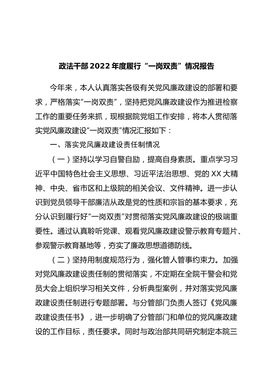 政法干部2022年度履行“一岗双责”情况报告今年来,本人认真落实各级有关党风廉政建设的部署和要求,严格落实“一岗双责”,坚持把党风廉政建设作为推进检察工作的重要任务来抓,现根据院党组工作安排,将本人贯彻落实党风廉政建设“一岗双责”情况汇报如下:一、落实党风廉政建设责任制情况(一)坚持以学习自警自励,提高自身素质。重点学习习近平中国特色社会主义思想、习近平法治思想、党的XX大精神、中央、省市区和上级院的相关会议、文件精神。进一步认识到党员领导干部廉洁从政是党的性质和宗旨的基本要求,充分认识到履行好“一岗双责”对贯彻落实党风廉政建设的极端重要性。通过认真聆听党课、观看党风廉政建设警示教育专题片、参观警示教育基地等,夯实了廉政思想道德防线。(二)坚持用制度规范行为,强化管人管事约束力。加强对党风廉政建设责任制的贯彻落实,不定期在全院干警会和党员大会上组织学习相关文件,分析典型案例,并对落实党风廉政建设责任制进行专题部署。与分管部门负责人签订《党风廉政建设责任书》,进一步明确了分管部门和单位的党风廉政建设的工作目标,责任要求。同时与政治部共同研究制定本院三类人员考评标准,将廉洁自律情况纳入考核标准,强化用制度管人管事的约束力。(三)坚持严于律己不懈怠,率先垂范公平正义。以《D章》要求约束自己,以《廉政准则》、《处分条例》、《监督条例》规范自己,坚持做到自重、自省、自警、自励,从小事做起,严格落实领导干部重大事项报告制度,按时如实填报“三个规定”重大事项。以身作则,严格按照规定和制度办事,始终按照工作权限和工作程序履行职责,不讲无原则的话,不办无原则的事,坚持公平正义,不徇私情。自觉搞好家风家教建设,管好身边的人和事,珍惜手中的权力,凡是要求别人做到的,自己率先做到,顾全大局,令行禁止。二、业务工作履职情况(一)团结班子成员,服务工作大局作为班子成员,始终把维护团结、带好队伍作为业务工作首要来抓。坚持做到公道正派、讲大局、讲党性,在大是大非问题面前立场坚定,观点鲜明。(二)带好队伍,抓好分管部门具体工作1.“精准发力”做好民事检察监督强化精准监督理念,在民事监督案件的线索发现、调查核实、跟进监督等方面下功夫,深入推进对生效裁判、审判程序违法、执行活动等领域的监督。受理各类民事案件XX件,其中办理生效裁判结果监督案件X件、审判程序违法案件XX件、执行监督类案件X件。共发出检察建议XX件,其中执行检察建议XX件,再审检察建议XX件,审判程序违法XX件,法院回复并采纳XX件。另,办理支持起诉案件XX件,发出类案监督检察建议XX件,完成市院交办案件XX件,向市院移送虚假诉讼线索XX件。紧盯虚假诉讼不放松,充分运用信息化手段,全面、深入挖掘、用好大数据,防治虚假诉讼,维护司法权威。2.“着力攻坚”抓实行政检察监督重点是坚持个案监督与类案监督、专项监督相结合。强化行政诉讼和非诉执行监督,确保办案规模稳中有升。共受理各类行政案件XX件,行政非诉执行案件XX件,向行政机关发出依法行政检察建议XX件,所发检察建议均被采纳,立足检察职能化解行政争议XX件。另,完成市院交办生效裁判结果监督案件XX件、审判程序违法案件XX件。树牢“双赢多赢共赢”监督理念,加强与行政机关联动,加强对涉企行政执法行为、行政执法措施的监督。探索与区司法局建立行政争议实质性化解工作机制,助力行政诉讼矛盾的多元化解。加强与区人力资源和社会保障局沟通联系,了解目前我区存在的涉企劳动争议、工伤赔偿、农民工讨薪难等案件的办理情况,为化解工作做好前期准备。3.“稳中求新”优化公益诉讼工作落实落细公益诉讼法定职责,持续把生态环境和资源保护食品药品安全、国有财产保护、国有土地使用权出让“四个传统领域”作为办案重点,共计摸排线索XX件,立案XX件,其中生态环境领域XX件,资源保护领域XX件,国有资产保护领域XX件,其他XX件。提出行政公益诉讼诉前检察建议XX件,回复XX件,行政机关均已整改落实到位。受理刑事附带民事公益诉讼线索XX件,诉前审查XX件,起诉XX件,法院已判决XX件,申请司法确认XX件,已增殖放流XX余尾...