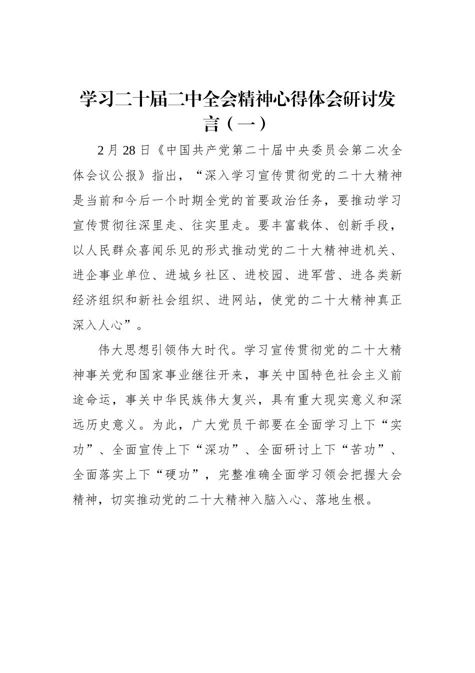 学习二十届二中全会精神心得体会研讨发言材料(6篇)目录1.学习二十届二中全会精神心得体会研讨发言(一)...22.学习二十届二中全会精神心得体会研讨发言(二).53.学习二十届二中全会精神心得体会研讨发言(三).84.学习二十届二中全会精神心得体会研讨发言(四).............................................................................115.学习二十届二中全会精神心得体会研讨发言(五).............................................................................146.学习二十届二中全会精神心得体会研讨发言(六).............................................................................17学习二十届二中全会精神心得体会研讨发言(一)2月28日《中国共产党第二十届中央委员会第二次全体会议公报》指出,“深入学习宣传贯彻党的二十大精神是当前和今后一个时期全党的首要政治任务,要推动学习宣传贯彻往深里走、往实里走。要丰富载体、创新手段,以人民群众喜闻乐见的形式推动党的二十大精神进机关、进企事业单位、进城乡社区、进校园、进军营、进各类新经济组织和新社会组织、进网站,使党的二十大精神真正深入人心”。伟大思想引领伟大时代。学习宣传贯彻党的二十大精神事关党和国家事业继往开来,事关中国特色社会主义前途命运,事关中华民族伟大复兴,具有重大现实意义和深远历史意义。为此,广大党员干部要在全面学习上下“实功”、全面宣传上下“深功”、全面研讨上下“苦功”、全面落实上下“硬功”,完整准确全面学习领会把握大会精神,切实推动党的二十大精神入脑入心、落地生根。在全面学习上下“实功”,让党的二十大精神落地见效、深根固柢。要充分发挥领导干部引领示范作用,坚持学在前、做在前,在先学上做表率、在真学上悟真情、在深学上下功夫。要将党的二十a大精神列入理论学习中心组学习、“三会一课”及主题党日学习计划,召开专题学习会议,认真学习党的二十大报告、党章和习近平总书记的系列讲话,引导党员干部不断提高政治判断力、政治领悟力、政治执行力。同时,要运用好《党的二十大报告学习辅导百问》《党的二十大文件汇编》《二十大党章修正案学习问答》等学习用书,分章节、分步骤进行逐字逐句学习,切实增强学习实效。在全面宣传上下“深功”,让党的二十大精神生根发芽,茁壮成长。聚焦主题主线,利用各种形式多层次、多渠道、多举措开展宣传活动,掀起学习贯彻党的二十大精神热潮。要充分利用微信公众平台、党支部微信工作交流群、乡村大喇叭等媒介,持续宣传推送关于党的二十大的解读文章和报告内容,引领党员群众深刻领会党的二十大报告中的新观点、新论断、新思想。要邀请党校讲师、“两优一先”代表、老支书、老党员、各级党代表以身边事身边理,将党的二十大精神从会议室搬到大街小巷、群众院落、田间课堂,通过你一问我一答、你一言我一语的方式,让党的二十大精神实在基层、热在心上。在全面研讨上下“苦功”,让党的二十大精神遍地开花、芬芳馥郁。各基层党组织要结合工作实际,通过专题研讨和撰写心得体会等方式加强学习,营造人人参与学习讨论的浓厚氛围。基层党组织要将党的二十大精神列入年度研讨计划,结合“三会一课”、主题党日,每季度至少研讨交流1次,推动党员干部补足精神之钙、筑牢信仰之基、把稳思想之舵。各级党组织书记要主动当好学习宣传贯彻党的二十大精神的“领头雁”,带领广大党员干部群众积极开展学习讨论、互动交流,形成“比学赶超”的良好氛围,切实推动党的二十大精神在基层遍地开花。在全面落实上下“硬功”,让党的二十大精神枝繁叶茂、盈车嘉穗。要坚持学用结合,在学以致用上下功夫,将学习贯彻党的二十大精神与当前各项农村重点工作紧密结合,确保党的二十大精神入脑入心、见行见效。要以“党建+”为抓手,全力抓好乡村振兴、项目建设、为民服务、疫情防控、产业发展、矛盾纠纷化解等各项工作,切实把学习热情转化为推动高质量发展的强大动能,以实际行动贯彻落实党的二十大精神。同时,还要与解决群众急难愁盼问题结合起来,积极组织党员干部深入圈舍大棚田间地头,认真倾听,并...