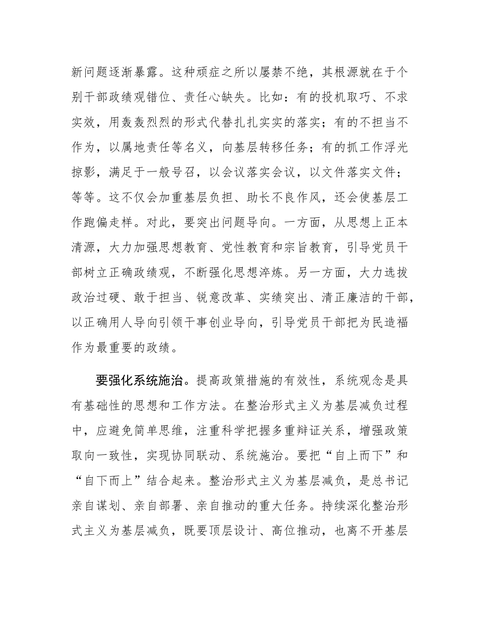 学习《整治形式主义为基层减负若干规定》心得体会发言党的二十届三中全会对持续深化拓展整治形式主义为基层减负作出部署,明确提出要健全为基层减负长效机制。今年8月,中共中央办公厅、国务院办公厅印发《整治形式主义为基层减负若干规定》,首次以党内法规形式制定为基层减负的制度规范,形成类似中央八项规定长期有效的铁规矩、硬杠杠,向全党全社会表明持之以恒一抓到底的鲜明态度。以同志为核心的党中央始终高度重视整治形式主义为基层减负,将其作为党的作风建设的重要内容、关心关爱基层的重要举措,建立中央层面整治形式主义为基层减负专项工作机制,采取一系列有力措施,取得了明显成效。但同时,我们也要清醒地看到,形式主义、官僚主义之弊非一日之寒,从根子上减轻基层负担也非一日之功,需要常抓不懈、久久为功,推动为基层减负不断向治本深化。要坚持深挖根源。形式主义是党的大敌、人民的大敌。基层是一切工作的落脚点,决不能让形式主义绑住基层干部的手脚。然而,当前一些形式主义问题依然突出,老问题隐形变异,新问题逐渐暴露。这种顽症之所以屡禁不绝,其根源就在于个别干部政绩观错位、责任心缺失。比如:有的投机取巧、不求实效,用轰轰烈烈的形式代替扎扎实实的落实;有的不担当不作为,以属地责任等名义,向基层转移任务;有的抓工作浮光掠影,满足于一般号召,以会议落实会议,以文件落实文件;等等。这不仅会加重基层负担、助长不良作风,还会使基层工作跑偏走样。对此,要突出问题导向。一方面,从思想上正本清源,大力加强思想教育、党性教育和宗旨教育,引导党员干部树立正确政绩观,不断强化思想淬炼。另一方面,大力选拔政治过硬、敢于担当、锐意改革、实绩突出、清正廉洁的干部,以正确用人导向引领干事创业导向,引导党员干部把为民造福作为最重要的政绩。要强化系统施治。提高政策措施的有效性,系统观念是具有基础性的思想和工作方法。在整治形式主义为基层减负过程中,应避免简单思维,注重科学把握多重辩证关系,增强政策取向一致性,实现协同联动、系统施治。要把“自上而下”和“自下而上”结合起来。整治形式主义为基层减负,是总书记亲自谋划、亲自部署、亲自推动的重大任务。持续深化整治形式主义为基层减负,既要顶层设计、高位推动,也离不开基层响应、主动作为。领导干部必须真正下沉基层,多聆听基层的声音,精准把握哪些问题是基层反映强烈的突出问题,从而有针对性地提出加强和改进措施,赢得基层支持,实现上下同向发力、同频共振。要把基层“强身”和机关“瘦身”结合起来。针对基层职责边界不清、权责不一致、责能不匹配等问题,各地应立足实际建立健全基层权责清单,加强清单动态管理,推动资源、服务、管理向基层下沉,促进权责一致、责能一致,不断夯实基层基础。要健全长效机制。形式主义、官僚主义是顽瘴痼疾,就像“牛皮癣”,具有顽固性和反复性,且花样不断翻新。整治形式主义为基层减负,不是“一锤子买卖”,不能“一减了之”,更不可能一蹴而就、毕其功于一役,而是需要长期坚持和不断完善。随着整治工作不断向纵深推进,亟须破除一些深层次体制机制障碍。一方面,要不断总结近年来整治形式主义为基层减负工作中的经验做法,把经过实践检验、行之有效的经验做法固化下来上升为制度规范。另一方面,要着眼于破解难点堵点问题,秉持主动创新的思路,在系统分析、审慎论证的基础上提出新的硬举措,建立清晰明确的制度规范,推动整治工作在制度轨道上规范化运行。值得一提的是,在建章立制上要注重务实管用,不搞长篇大论。针对突出问题提出的措施要求,要简洁明了、具体实在,便于理解和执行。要加强监督问责。整治形式主义为基层减负工作,监督是保障落实的“利剑”,问责是强化震慑的“重锤”。各级纪检监察部门需主动扛起监督之责,擦亮监督“探头”,紧盯基层减负各项政策落地情况,采取定期检查与不定期抽查相结合的方式,深入机关、深入基层一线,对各类工作场景开展全方位“扫描”。对于那些仍顶风作案、大搞形式主义,给基层无端增添负担的部门与个人,绝不姑息迁就,要严格依规依纪依法启动问责程序。比如,...