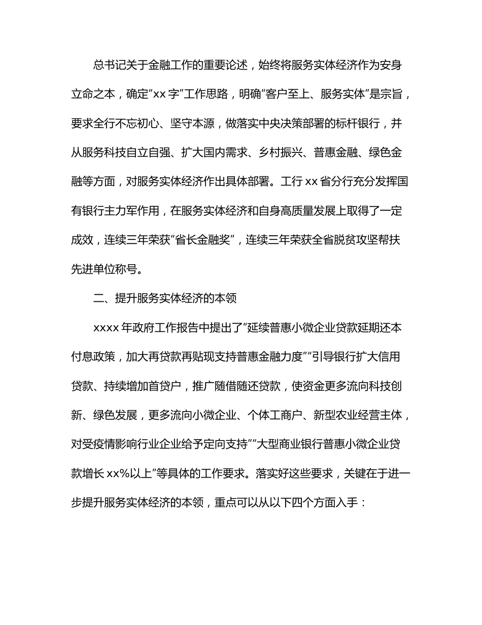 银行党委书记、行长在经济座谈会上的发言:坚守服务实体经济本分提升服务实体经济本领xxxx年政府工作报告中,通篇贯穿习近平新时代中国特色社会主义思想,旗帜鲜明、提振信心、催人奋进,特别是对于金融工作的要求精准务实,对做好金融工作具有切实的指导意义。中国工商银行xx省分行将从三个方面抓好贯彻落实。一、坚守服务实体经济的本分金融是国之重器。党中央始终高度重视金融工作。习近平总书记在xxxx年的金融工作会议上强调,“金融是实体经济的血脉,为实体经济服务是金融的天职,是金融的宗旨,也是防范金融风险的根本举措。”在xxxx年中共中央政治局第十三次集体学习时,习近平总书记再次强调,“金融要为实体经济服务,满足经济社会发展和人民群众需要。金融活,经济活;金融稳,经济稳。经济兴,金融兴;经济强,金融强。”xxxx年政府工作报告中明确提出,“金融机构要坚守服务实体经济的本分。”这都是做好金融工作的基本遵循和重要原则。中国工商银行始终坚持以习近平新时代中国特色社会主义思想为指引,坚定贯彻习近平总书记关于金融工作的重要论述,始终将服务实体经济作为安身立命之本,确定“xx字”工作思路,明确“客户至上、服务实体”是宗旨,要求全行不忘初心、坚守本源,做落实中央决策部署的标杆银行,并从服务科技自立自强、扩大国内需求、乡村振兴、普惠金融、绿色金融等方面,对服务实体经济作出具体部署。工行xx省分行充分发挥国有银行主力军作用,在服务实体经济和自身高质量发展上取得了一定成效,连续三年荣获“省长金融奖”,连续三年荣获全省脱贫攻坚帮扶先进单位称号。二、提升服务实体经济的本领xxxx年政府工作报告中提出了“延续普惠小微企业贷款延期还本付息政策,加大再贷款再贴现支持普惠金融力度”“引导银行扩大信用贷款、持续增加首贷户,推广随借随还贷款,使资金更多流向科技创新、绿色发展,更多流向小微企业、个体工商户、新型农业经营主体,对受疫情影响行业企业给予定向支持”“大型商业银行普惠小微企业贷款增长xx%以上”等具体的工作要求。落实好这些要求,关键在于进一步提升服务实体经济的本领,重点可以从以下四个方面入手:第一,提高政治站位,扑下身子做小微。工商银行党委高度重视普惠金融发展,坚持打造“融资、融智、融商”的一体化服务,并明显加大对普惠金融的考核力度。去年,工行xx省分行按照工总行部署,扎实开展“工银普惠行”活动,领导班子带队走访了xxx余家小微企业,对省内小微企业发展的基本面和客户需求有了直观认识。我们感到普惠金融大有可为,核心是坚持以人民为中心的思想,心中有客户,扑下身子寻找主业突出、前景较好、管理规范的小微企业,与他们共同成长。第二,提升创新能力,疏通金融服务堵点。xxxx年政府工作报告中提出,“加快信用信息共享步伐。”我们感到,未来做好小微企业金融服务的重点是将技术和数据两大要素紧密融合,通过技术打造小微金融服务平台,通过平台上各类数据交叉验证,提升金融服务的可得性、便捷性和安全性。去年,工行xx省分行基于税务和xx数据为xxx余户小微企业发放了信用贷款,更重要的是推动银行服务模式由原来的企业找银行,向银行根据数据找企业转变,真正让数据多跑路、客户少跑腿。下一步,工行xx省分行将继续在这方面的创新上进行探索。第三,丰富金融技术,加快供应链融资推广。xxxx年政府工作报告中提出,“创新供应链金融服务模式”。加快供应链融资探索具有十分重要的现实意义,中小微企业很多是国有大中型企业的配套企业,其为核心企业货物供应产生的应收账款,占其营运资金的xx%以上。从抽样调查来看,我省的中小企业应收账款占主营业务收入的xx.xx%。但在经营实践中,要确认中小企业的应收账款,特别是确认为大中型企业配套产生的应收账款较为困难。因此在xxxx年第十三届全国人大三次会议上,我建议从国家层面提出要求,在不渉国有大中型企业商业秘密的前提下,根据客户授权向银行业开放其上游配套企业应付账款数据。国务院颁布的《保障中小企业款项支付条例》已经明显改善了当前现状。xxxx年,工行xx省分行围绕供应链融资进行了一些探索,已经为xx家企业提...