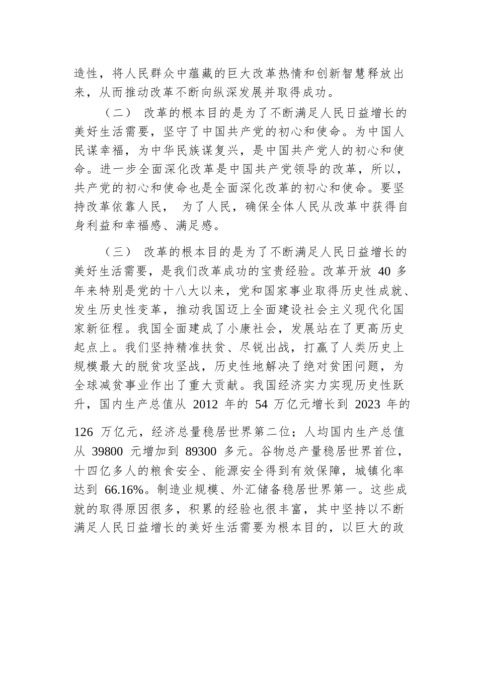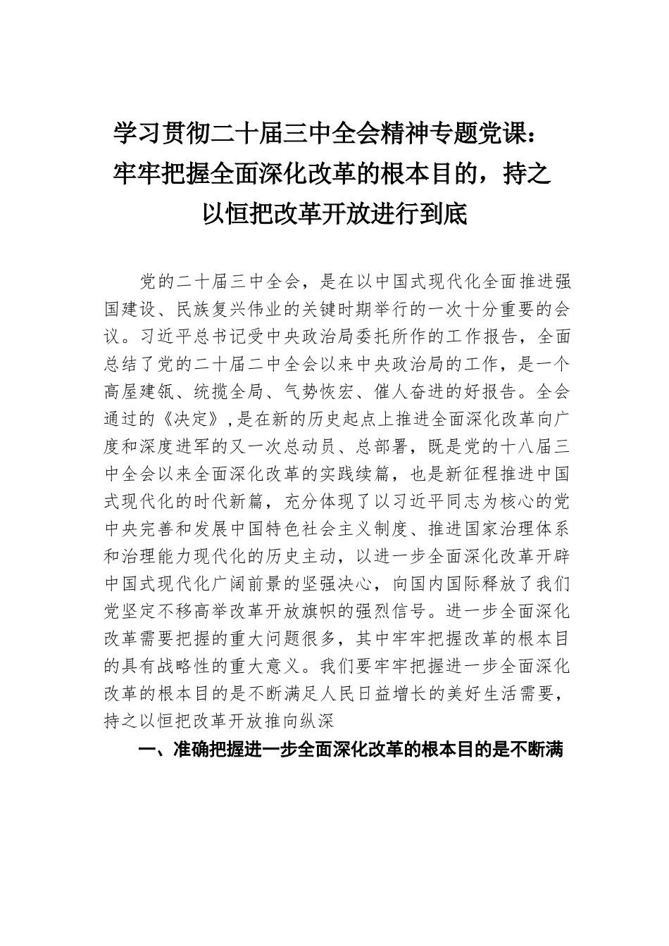 学习贯彻二十届三中全会精神专题党课:牢牢把握全面深化改革的根本目的,持之以恒把改革开放进行到底党的二十届三中全会,是在以中国式现代化全面推进强国建设、民族复兴伟业的关键时期举行的一次十分重要的会议。习近平总书记受中央政治局委托所作的工作报告,全面总结了党的二十届二中全会以来中央政治局的工作,是一个高屋建瓴、统揽全局、气势恢宏、催人奋进的好报告。全会通过的《决定》,是在新的历史起点上推进全面深化改革向广度和深度进军的又一次总动员、总部署,既是党的十八届三中全会以来全面深化改革的实践续篇,也是新征程推进中国式现代化的时代新篇,充分体现了以习近平同志为核心的党中央完善和发展中国特色社会主义制度、推进国家治理体系和治理能力现代化的历史主动,以进一步全面深化改革开辟中国式现代化广阔前景的坚强决心,向国内国际释放了我们党坚定不移高举改革开放旗帜的强烈信号。进一步全面深化改革需要把握的重大问题很多,其中牢牢把握改革的根本目的具有战略性的重大意义。我们要牢牢把握进一步全面深化改革的根本目的是不断满足人民日益增长的美好生活需要,持之以恒把改革开放推向纵深一、准确把握进一步全面深化改革的根本目的是不断满足人民日益增长的美好生活需要目的决定方向,方向决定道路,道路决定命运。进一步全面深化改革的根本目的,实际上就是全面深化改革的出发点和落脚点。根本目的把握准了,方向才不会偏,道路才不会邪;目的不明确,搞错了,搞偏了,就会差之毫厘谬以千里。我们所要进行的进一步全面深化改革,是新时代在中国共产党的领导下中国特色社会主义制度的自我完善和自我发展。习近平总书记所反复强调,改革的根本目的是为了不断满足人民日益增长的美好生活需要。我们要牢记习近平总书记的殷殷嘱托,紧扣推进中国式现代化主题,进一步全面深化改革。(一)改革的根本目的是为了不断满足人民日益增长的美好生活需要,体现了马克思主义唯物史观的重要原理。唯物史观的基本观点之一是,人民是历史的主人,是历史的创造者,群众是真正的英雄。改革是广大人民群众的实践活动。改革每一次突破和发展,都来自亿万人民的实践和智慧。只有从人民最迫切的要求出发所进行的改革才是符合社会发展规律的改革,才能真正体现社会主义制度自我完善的要求。只有尊重人民首创精神,及时总结群众创造的新鲜经验并将其上升到理论的高度,用以指导和推动改革,改革才能成功。因此,进一步全面深化改革要始终坚持以不断满足人民日益增长的美好生活需要为根本目的,想人民所想,急人民所急,坚持人民主体地位,虚心向人民学习,倾听人民呼声,汲取人民智慧,最大限度地发挥人民群众的积极性、主动性、创造性,将人民群众中蕴藏的巨大改革热情和创新智慧释放出来,从而推动改革不断向纵深发展并取得成功。(二)改革的根本目的是为了不断满足人民日益增长的美好生活需要,坚守了中国共产党的初心和使命。为中国人民谋幸福,为中华民族谋复兴,是中国共产党人的初心和使命。进一步全面深化改革是中国共产党领导的改革,所以,共产党的初心和使命也是全面深化改革的初心和使命。要坚持改革依靠人民,为了人民,确保全体人民从改革中获得自身利益和幸福感、满足感。(三)改革的根本目的是为了不断满足人民日益增长的美好生活需要,是我们改革成功的宝贵经验。改革开放40多年来特别是党的十八大以来,党和国家事业取得历史性成就、发生历史性变革,推动我国迈上全面建设社会主义现代化国家新征程。我国全面建成了小康社会,发展站在了更高历史起点上。我们坚持精准扶贫、尽锐出战,打赢了人类历史上规模最大的脱贫攻坚战,历史性地解决了绝对贫困问题,为全球减贫事业作出了重大贡献。我国经济实力实现历史性跃升,国内生产总值从2012年的54万亿元增长到2023年的126万亿元,经济总量稳居世界第二位;人均国内生产总值从39800元增加到89300多元。谷物总产量稳居世界首位,十四亿多人的粮食安全、能源安全得到有效保障,城镇化率达到66.16%。制造业规模、外汇储备稳居世界第一。这些成就的取得原因很多,积累的经验也很丰富,其中坚持以不断满足人民日...