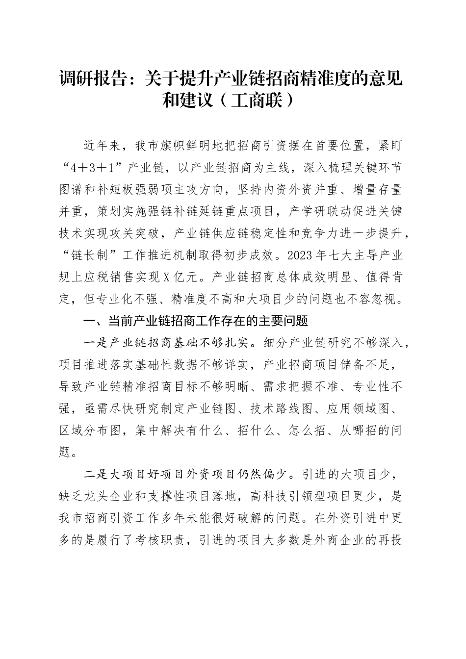调研报告:关于提升产业链招商精准度的意见和建议(工商联)近年来,我市旗帜鲜明地把招商引资摆在首要位置,紧盯“4+3+1”产业链,以产业链招商为主线,深入梳理关键环节图谱和补短板强弱项主攻方向,坚持内资外资并重、增量存量并重,策划实施强链补链延链重点项目,产学研联动促进关键技术实现攻关突破,产业链供应链稳定性和竞争力进一步提升,“链长制”工作推进机制取得初步成效。2023年七大主导产业规上应税销售实现X亿元。产业链招商总体成效明显、值得肯定,但专业化不强、精准度不高和大项目少的问题也不容忽视。一、当前产业链招商工作存在的主要问题一是产业链招商基础不够扎实。细分产业链研究不够深入,项目推进落实基础性数据不够详实,产业招商项目储备不足,导致产业链精准招商目标不够明晰、需求把握不准、专业性不强,亟需尽快研究制定产业链图、技术路线图、应用领域图、区域分布图,集中解决有什么、招什么、怎么招、从哪招的问题。二是大项目好项目外资项目仍然偏少。引进的大项目少,缺乏龙头企业和支撑性项目落地,高科技引领型项目更少,是我市招商引资工作多年未能很好破解的问题。在外资引进中更多的是履行了考核职责,引进的项目大多数是外商企业的再投资项目,投资规模、生产规模都不大,对产业集聚的提升带动力不足。三是项目承接条件仍有一定差距。土地供应不足是制约项目落地的关键因素,目前我市土地指标紧缺,尤其缺少成片土地,无法承载大项目。项目用地报批审批环节多、周期较长,导致项目落地滞后。园区基础设施建设和公共服务平台投入不足,过渡性厂房欠缺,无法快速落地一些质态成熟的项目。产业基金支撑不足,融资渠道不畅和成本较高,制约着一大批科技含量高、带动强性的项目引进及落地。四是专业化招商能力不足。目前都是以政府招商为主,专业招商人才少,有招商经验、懂经济懂运营、善磋商谈判、懂法律法规、晓外语商务礼仪的多面手人才少,项目推进过程中不会抓项目、不会谈的问题依然存在。招商人员多来自体制内,招商行为还是靠行政化手段驱动,激励机制还未有效建立,招商人员工作积极性不高,工作活力不足。二、加强产业链招商工作的几点建议为进一步提升产业链招商工作的专业性、精准度和成功率我们建议从以下四个方面深入下功夫、寻求新突破,进而以点带面、抓纲带目,推动招商引资工作实现新突破、新作为。1.强谋当下,明确目标,理清产业链招商思路。认真梳理各产业链发展现状,全面掌握产业链重点企业、重点平台、关键共性技术和制约瓶颈等情况,加强上级政策、发展趋势的研判分析,统筹推进项目建设、企业发展、技术创新等工作。在此基础上,紧扣主导产业、紧抓龙头企业、紧盯薄弱环节加速强链,支持本地龙头企业、链主企业增资扩产,开展产业链招商、以商引商,壮大眼镜视光学、汽车零部件、五金工具和大家居等优势主导产业;加速补链,聚焦新医药及医疗器械、高端装备制造和新材料等初具基础的产业链短板、薄弱和缺失环节,紧盯产业链颈部、腰部企业强化招引;加速延链,抢抓数字经济、人工智能、集成电路等战略性新兴产业,延展产业链条,加快形成新质生产力。2.挂图作战,重点突破,明确产业链招商方向。聚焦我市“4+3+1”重点产业发展方向,分析关键领域短板与劣势,解构各产业链上游(原料与零部件)、中游(制造核心设备和产品)、下游(加工原材料和零部件,制造成品和从事生产、服务的行业)关联图谱,分产业绘制招商地图,构建重点链条企业的上下游企业库,锁定潜在目标企业或重点招商项目,按图索骥,挂图作战,力促招商引资工作从“地毯式招商”向“地图式招商”转变。同时,在招大引强上求突破,瞄准京津冀、长三角、珠三角等重点地区,发挥驻点招商办的作用,紧密对接与我市产业相关的重点企业和“隐形冠军”企业,招引一批创新能力强、投资规模大、产业层次高、带动潜力足的大项目好项目,努力实现“引进一个、带来一批、辐射一片、聚集一群”。3.完善机制,充实力量,提升专业化招商能力。一是优化招商工作体制机制,压实招商工作责任。细化明确2024年产业链招商重点任务、工作清单、完成时限和责任...