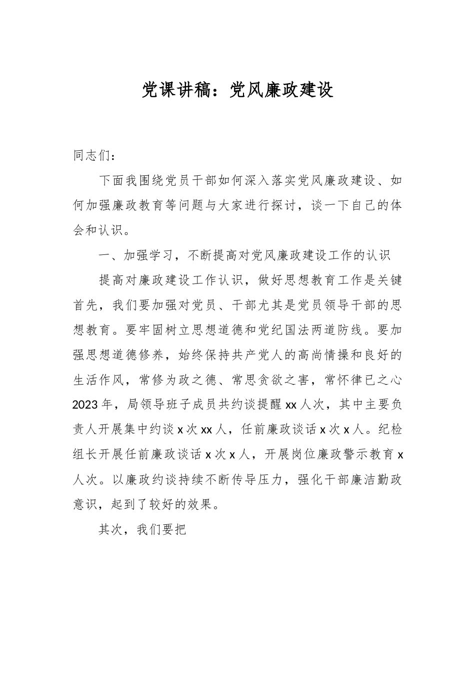 党课讲稿:党风廉政建设同志们:下面我围绕党员干部如何深入落实党风廉政建设、如何加强廉政教育等问题与大家进行探讨,谈一下自己的体会和认识。一、加强学习,不断提高对党风廉政建设工作的认识提高对廉政建设工作认识,做好思想教育工作是关键首先,我们要加强对党员、干部尤其是党员领导干部的思想教育。要牢固树立思想道德和党纪国法两道防线。要加强思想道德修养,始终保持共产党人的高尚情操和良好的生活作风,常修为政之德、常思贪欲之害,常怀律已之心2023年,局领导班子成员共约谈提醒xx人次,其中主要负责人开展集中约谈x次xx人,任前廉政谈话x次x人。纪检组长开展任前廉政谈话x次x人,开展岗位廉政警示教育x人次。以廉政约谈持续不断传导压力,强化干部廉洁勤政意识,起到了较好的效果。其次,我们要把廉政学习和惩防体系学习作为党风廉政工作的重点来抓,严格遵守和执行各项制度,强化遵纪守法观念,严于律已勤政廉洁。要认真学习新修订的《中国共产党廉洁自律准则》《关于新形势下党内政治生活的若干准则》《中国共产党纪律处分条例》《中国共产党问责条例》《中国共产党党内监督条例》(简称为“两准则、三条例”),增强我们党员干部的廉洁自律意识,筑牢预防腐败的思想防线需要指出的是,我们很多党员干部都抱怨平时开展业务工作忙,学习时间和机会有限,学习效果不佳。其实,不一定要找集中时间,要做个有心人,善于利用零散的时间进行学习,尤其是纪委系统主办的《纪检监察》、《党风廉政》等书籍以及一些有一定影响的警示案例,都是我们学习的极好素材。希望大家通过警示案例的学习,对照自己的工作和生活进行反省,切实做到防微杜渐,清政廉政。在这里,我想特别强调的是,随着中央八项规定和《xx管理条例》等条例、文件的颁布实施,以及局工作化的深入推进,政策法规的要求越来越高,我们一定要熟悉相关政策规定,知道什么是红线,才能做到既做好服务保障工作又不违反有关规定。二、强化责任,严格落实党风廉政建设责任制我作为局的主要负责人,每年都会与各科室负责人签订党风廉政建设责任书,对各自承担的党风廉政责任进行明确,2023年度的责任书也下发到各科室,待会各科室主要负责人要向我递交签订的党风廉政建设责任书。在这里需要明确的是党风廉政建设的责任关键是通过抓具体工作来落实,不能仅仅停留在责任书上。责任分工再明确、具体规定再详细,在落实的环节出现了问题,我们签订的党风廉政建设责任书也就成了一纸空文,没有任何意义,所以请各科室负责人认真阅读学习责任书的内容,按照责任书的要求必须抓好落实。一是要把责任压实。拧紧“责任弦”,时刻把主体责任放在心上、扛在肩上、抓在手上。牵住“牛鼻子”,健全完善分工负责、统筹联动、层层递进的责任体系。分管领导要对照各自的责任范围、责任内容深入细致地安排工作,善于有机地结合日常各项管理工作,突出重点,统筹兼顾,落实党风廉政建设的各项要求,要善于将廉政工作贯穿于日常的业务工作中,切实抓好党风廉政责任制的落实。纪检组要充分发挥监督执纪问责的职能,加大监督执纪问责的力度,以对党的事业负责、对干部关心爱护的态度落实好、运用好“四种形态”,确实做到把纪律挺在前面。二是局班子成员、各科室负责人也要落实好“一岗双责”,增强主体意识,认真落实党风廉政建设责任制。要加强管理,把党风廉政建设、党风政风建设、机关效能建设的各项要求贯穿到科室管理的各个环节之中,结合自身业务工作特点抓廉政工作。要着力解决科室内存在的一些行政不作为、庸政懒政等现象,提高科室工作的自觉性和主动性。三是在落实主体责任和监督责任中,特别要警惕可能存在的廉政风险点。去年,我局为减少廉政风险,做了大量工作,有效防范廉政风险。但我认为个别工作做得还不够细致,仍存在一定廉政风险。三、加强党内监督,严明六大纪律在二十届中央纪委二次全会上的重要讲话,A总书记对党风廉政建设提出了新的要求,为深入推进党的自我革命健全全面从严治党体系,坚定不移推动党风廉政建设和反腐败斗争向纵深发展提供了根本遵循。x届市纪委x次全会中,xx同志也作了报告,要求深入落实x...