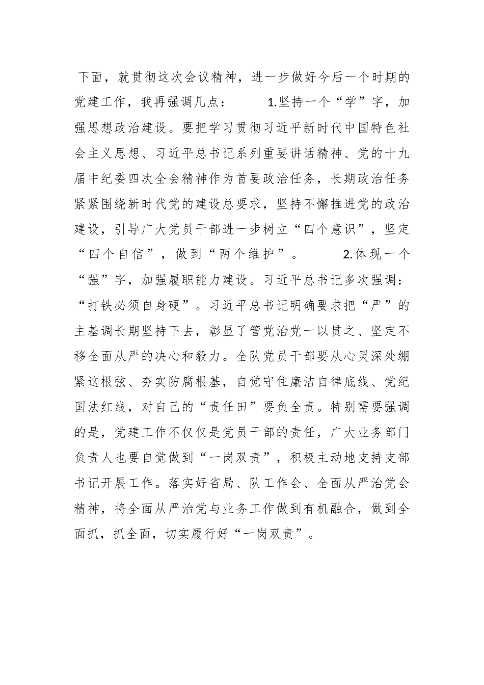 有关党委书记在全面从严治党工作会议上的讲话(5篇)【篇1】党委书记在全面从严治党工作会议上的讲话2020年全面从严治党工作会议总结讲话时间:XXX2020年全面从严治党工作会议总结讲话冬去春来,万象更新。新的一年,我队2020年全面从严治党工作会议胜利召开了,今天会议的主要议题是:总结上年度我队党建工作,安排部署今年的工作任务,全面推进我队党建工作再上新台阶,为早日实现三队各项事业高质量发展提供坚强的政治保障。刚才,党委书记XXXX同志作了题为《实干担当,笃定前行,为我队转型发展高质量提供坚强保障》的党委工作报告。中层干部递交了党风廉政建设责任书、承诺书。会议内容丰富,主题鲜明,工作部署全面,既总结了工作成绩,也指出了存在问题,并对新一年的工作作了全面的安排。纪委、工会和团委的工作报告都已经发放给各位了,就不在会上念了,各单位会后要认真组织学习。下面,就贯彻这次会议精神,进一步做好今后一个时期的党建工作,我再强调几点:1.坚持一个“学”字,加强思想政治建设。要把学习贯彻习近平新时代中国特色社会主义思想、习近平总书记系列重要讲话精神、党的十九届中纪委四次全会精神作为首要政治任务,长期政治任务紧紧围绕新时代党的建设总要求,坚持不懈推进党的政治建设,引导广大党员干部进一步树立“四个意识”,坚定“四个自信”,做到“两个维护”。2.体现一个“强”字,加强履职能力建设。习近平总书记多次强调:“打铁必须自身硬”。习近平总书记明确要求把“严”的主基调长期坚持下去,彰显了管党治党一以贯之、坚定不移全面从严的决心和毅力。全队党员干部要从心灵深处绷紧这根弦、夯实防腐根基,自觉守住廉洁自律底线、党纪国法红线,对自己的“责任田”要负全责。特别需要强调的是,党建工作不仅仅是党员干部的责任,广大业务部门负责人也要自觉做到“一岗双责”,积极主动地支持支部书记开展工作。落实好省局、队工作会、全面从严治党会精神,将全面从严治党与业务工作做到有机融合,做到全面抓,抓全面,切实履行好“一岗双责”。3.彰显一个“实”字,夯实基层基础。今年局党委提出“344”党建工作法思路。要深入实施“三个计划”,大力营造学的氛围。以建设学习型党支部为目标,落实党员学习要以提升组织力为重点,突出政治功能,抓实基础建设,提升党员队伍先进性,推进全面从严治党向基层延伸。要以加强和规范党内政治生活为重点,全力推进支部工作标准化规范化,建设坚强“堡垒”,发挥灯塔作用,带领广大党员干干净净、踏踏实实地干好工作。4.贯彻一个“严”字,加强干部队伍监督。充分发挥群众监督的作用不定期地组织开展检查活动。严管等于厚爱,在监督内容上,紧盯重点人员、重点权力岗位、重要权力运行环节,紧盯五一、中秋、国庆、春节等重要节点,突出做好党风廉政建设主体责任落实、贯彻上级决策部署、落实“三重一大”事项报告制度等情况的监督。5.落实一个“勤”字,加强意识形态建设。全队干部职工要进一步夯实意识形态工作阵地,坚持传播党的声音,确保舆论积极向上、充满正能量;“勤”部署、“勤”宣传、“勤”教育,加强本部门的宣传报道工作,讲好三队故事,传播好三队声音,把三队宣传出去,这都需要大家的共同努力。希望各位领导要紧把宣传报道关,今年年底,将把宣传报道的数量与年终考核挂钩,请各位高度重视。同志们,今天的会议议程己全部进行完毕,大会开得非常成功。会上对全年的党建工作进行了详细的部署,会后,各支部、各部门、各实体要认真组织学习,抓好贯彻落实,全面提升我队党建工作水平为推动我队各项事业高质量发展作出新的贡献!【篇2】党委书记在全面从严治党工作会议上的讲话局机关单位全面从严治党工作会议上的讲话过去的一年,是极不平凡的一年,在深化各类改革这样的大环境下,我们坚持以习近平新时代中国特色社会主义思想为指导,紧紧围绕坚持和加强党的全面领导,以党的建设为统领,深入贯彻落实全国、全省、全市党建工作要求把全面从严治党引向深入,为高质量推进新时代工作现代化贡献出力量。全面从严治党永远在路上,习近平总书记站在新时代党和国家事业发展全局的高度,在十...