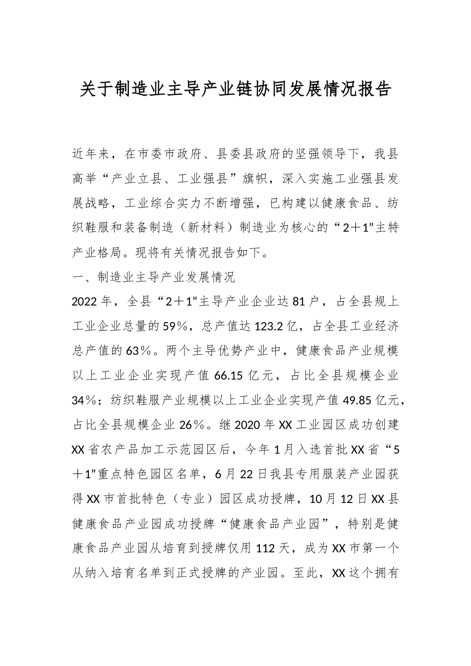 关于制造业主导产业链协同发展情况报告近年来,在市委市政府、县委县政府的坚强领导下,我县高举“产业立县、工业强县”旗帜,深入实施工业强县发展战略,工业综合实力不断增强,已构建以健康食品、纺织鞋服和装备制造(新材料)制造业为核心的“2+1”主特产业格局。现将有关情况报告如下。一、制造业主导产业发展情况2022年,全县“2+1”主导产业企业达81户,占全县规上工业企业总量的59%,总产值达123.2亿,占全县工业经济总产值的63%。两个主导优势产业中,健康食品产业规模以上工业企业实现产值66.15亿元,占比全县规模企业34%;纺织鞋服产业规模以上工业企业实现产值49.85亿元,占比全县规模企业26%。继2020年XX工业园区成功创建XX省农产品加工示范园区后,今年1月入选首批XX省“5+1”重点特色园区名单,6月22日我县专用服装产业园获得XX市首批特色(专业)园区成功授牌,10月12日XX县健康食品产业园成功授牌“健康食品产业园”,特别是健康食品产业园从培育到授牌仅用112天,成为XX市第一个从纳入培育名单到正式授牌的产业园。至此,XX这个拥有百万人口的农业大县也成为XX唯一拥有两个市级特色(专业)园区的县。二、制造业主导产业链协同发展情况(一)健康食品产业链日趋成熟基于农业优势,将资源优势转化为推动农业产业“接二连三”的发展盛势,在XX县健康食品产业园区打造集育种、养殖、屠宰、精深加工、冷链物流等农产品加工全产业链着力打造以领旗食品、铁骑力士(绿溪)优食谷等重大项目为依托的百亿级健康食品产业集群。2022年,规模以上食品工业企业达39家,实现产值66.15亿元。(二)纺织鞋服产业链日益完善立足全县既有传统产业优势,构建以佳联佳禧、鸿星尔克等骨干企业为支撑的百亿级鞋服纺织产业集群。形成了纺纱(缫丝)-纺布(织绸)-印染-成衣的纺织鞋服产业链。截止目前,已有鞋服纺织企业50余家,其中规上企业12户。以佳联佳禧建成产业链连接起上下游企业20余家,上游以宜乐纺织、亚鑫纺织为代表,有效填补我县缺少高档纺织面料的缺口,下游以亿和君美、鸿星尔克、翰彬霖鞋业等进一步对纺织鞋服产业进行补链强链。三、主要成效及做法(一)致力搭建产业链发展平台。注重帮助主导优势产业中的企业创新平台建设工作,积极搭建产学研发展平台,申报省级市级技术中心。截止目前,健康食品类企业已申请到省级企业技术中心数2个、市级企业技术中心数2个、集群内省级专精特新企业5家、省级高新技术企业2家。推动建成XXXX工业园区健康食品产业园,是XX健康食品产业绿色化、规模化、集约化、效益化发展的突出代表,集蔬菜种植、生产加工、物流配送、营养食品研发、食品安全溯源体系建设、学生食育教育为一体的多功能综合性工厂。加快建设高端纺织产业功能区,延链补链,精准招商,让引进的鞋服纺织企业尽快落地投产,在用工、用地、厂房等方面全力提供保障,根据需求提供人才专项引进资金等,助力纺织鞋服企业安心发展。(二)强化产业链要素集聚。严格落实《抓项目促投资20条硬措施》,出台《XX县发展有机产业奖励扶持办法》、《关于建设高端纺织产业功能区的实施意见》等文件,加大对主导产业发展的资金支持力度,主动作为对上争取健康主导优势产业发展项目和资金。积极组织企业申报市级产业金融提升项目、担保贷款融资补助、省级制造业强省试点项目等。加大对主导优势产业中的工业企业融资创业创新、对外合作方面的服务力度,助力多户企业顺利开展企业“引进来”“走出去”活动,扩大对外交流,截止今年10月,已组织辖区内大型企业参加工业行业展览会13次。(三)促进产业链开放合作。一是强化招商引资。重点围绕主导优势产业中多个细分领域招商引资,帮助企业发展提高产品科技含量,提升智能制造水平。近年新引进全国规模最大、工业化智能化水平最高的中央厨房-宏梓瑞中央厨房为健康食品产业绿色化、规模化、集约化、效益化发展打下坚实基础。二是专注产品研发升级,拓展研伸产业链,帮助企业发展提高产品科技含量,提升智能制造水平。帮助已建成投产的铁康食品进行产品创新,提升核心竞争力目前铁康食品品类涵盖肉制品、蛋制品、魔芋制品三大系列...