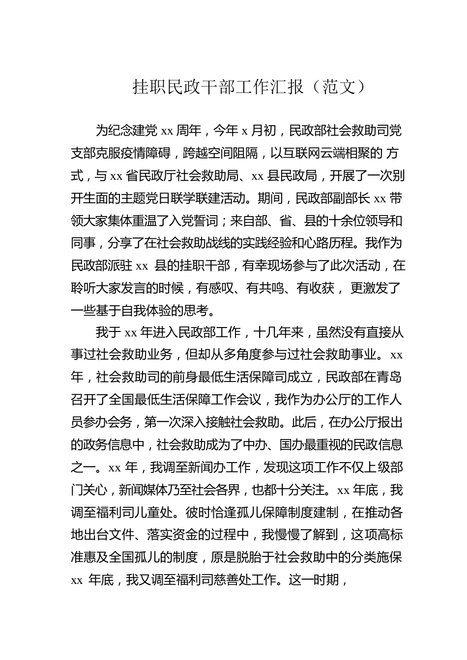 挂职干部工作汇报汇编(4篇)目录1...............................挂职民政干部工作汇报(范文)22..................................挂职街道办事处干部工作汇报63.....................................挂职镇党委副书记工作汇报94...............................挂职锻炼干部思想工作情况汇报16挂职民政干部工作汇报(范文)为纪念建党xx周年,今年x月初,民政部社会救助司党支部克服疫情障碍,跨越空间阻隔,以互联网云端相聚的方式,与xx省民政厅社会救助局、xx县民政局,开展了一次别开生面的主题党日联学联建活动。期间,民政部副部长xx带领大家集体重温了入党誓词;来自部、省、县的十余位领导和同事,分享了在社会救助战线的实践经验和心路历程。我作为民政部派驻xx县的挂职干部,有幸现场参与了此次活动,在聆听大家发言的时候,有感叹、有共鸣、有收获,更激发了一些基于自我体验的思考。我于xx年进入民政部工作,十几年来,虽然没有直接从事过社会救助业务,但却从多角度参与过社会救助事业。xx年,社会救助司的前身最低生活保障司成立,民政部在青岛召开了全国最低生活保障工作会议,我作为办公厅的工作人员参办会务,第一次深入接触社会救助。此后,在办公厅报出的政务信息中,社会救助成为了中办、国办最重视的民政信息之一。xx年,我调至新闻办工作,发现这项工作不仅上级部门关心,新闻媒体乃至社会各界,也都十分关注。xx年底,我调至福利司儿童处。彼时恰逢孤儿保障制度建制,在推动各地出台文件、落实资金的过程中,我慢慢了解到,这项高标准惠及全国孤儿的制度,原是脱胎于社会救助中的分类施保xx年底,我又调至福利司慈善处工作。这一时期,无论是起草《慈善法》这样重大的立法行为,还是组织慈展会等具体的慈善活动,其核心任务,就是引导社会力量配合政府工作,共同做好对困难群体的帮扶和救助。xx年初,受组织委派,我到革命老区、国家级贫困县xx省xx县挂职县委副书记、副县长,分管民政、扶贫、国土等工作。一年多来,在与县里民政局的同志一道走村入户、深入摸底的时候,一道联审核查、比对数据的时候,一道落实政策、发款发物的时候,一道接信接访、答疑解惑的时候,我对社会救助的各项工作都有了不同程度的参与,对这项制度重大意义的感受也更加深刻。一是深刻感受到,社会救助是最直接体现党的初心和使命的一项制度。习近平总书记多次强调:“中国共产党的初心和使命,就是为中国人民谋幸福、为中华民族谋复兴。”人民,是由一个一个具体的人集合而成。每一个具体的人,都会遇到具体的风险、具体的困难。而那些禀赋较弱、无法承受风险和困难的个人,均可从社会救助制度中获得有力支持,从而获得享受幸福生活的机会和能力。以xx县为例,作为一个偏远的山区县,全县人口xx万,目前享受农村低保的约x.x万人,城市低保约x.x万人,特困供养约x.x万人。这x.x万人遭遇的困难可谓林林总总、形形色色,但无论其成因和表象如何,社会救助制度都统一地、扎实地保障了他们的基本生活不发生问题,并推动他们得以进一步享受教育、医疗、就业等方面的政策,确保在奔小康的路上一个都不掉队。二是深刻感受到,社会救助是现阶段脱贫攻坚战中具有关键性作用的一项制度。当前,脱贫攻坚战已进入全力冲刺阶段,对于xxx多个已摘帽的贫困县来说,大决战基本告胜,歼灭战如火如荼。而歼灭战中各地最仰仗的政策工具,就是由社会救助构筑的兜底保障。以xx县为例,xx年顺利摘掉了国家级贫困县的帽子,至xx年底全县建档立卡贫困群众为xxx户xxx人,其中未脱贫的还有xxx户xxx人。这xxx人中,除极少数是因为大病、车祸等原因致贫或返贫的外,绝大部分是由于缺乏劳动能力、无法通过产业发展来致富脱贫的,只能通过城乡低保或者特困供养来兜底。因此,社会救助政策的落实情况,对于已摘帽的地方能否冲刺成功、能否兑现歼灭全敌,具有十分关键、甚至决定性的意义。三是深刻感受到,社会救助是服务于“两个一百年”奋斗目标的具有基础性作用的一项制度。党的十九届四中全会明确指出,要“巩固脱贫攻坚成果,建立解决相对贫困的长效机制”。目前,是迎接我们党百岁华诞的前夜,也是宣...