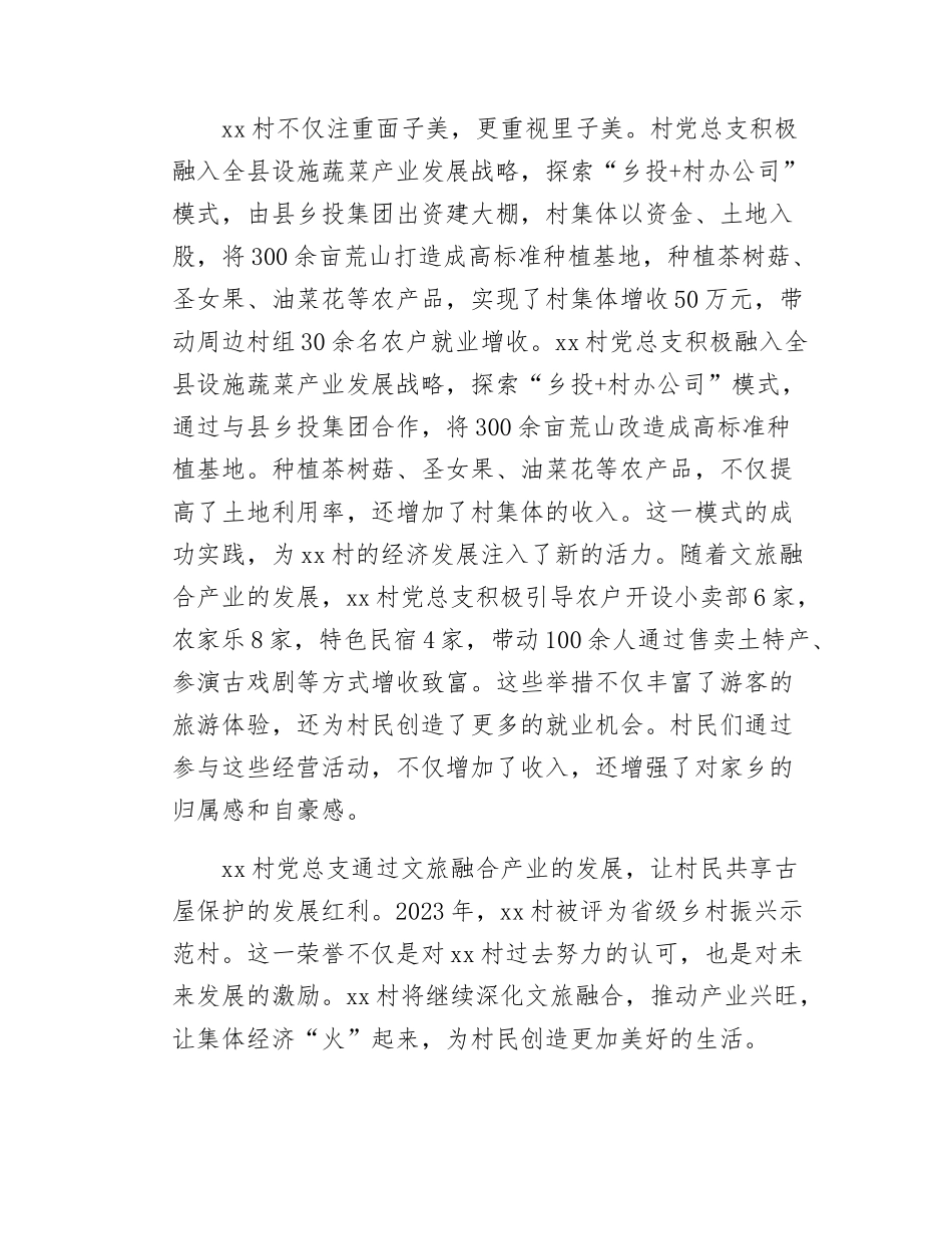 Xx县xx村党建引领宜居美村行动经验做法近年来,xx村党总支坚持党建引领,积极推动古村保护、文旅兴村与产业发展,走出一条古村振兴之路,成为一座颇具古风韵的美村。党群联护让古风乡韵“淳”起来走进古村,青砖黛瓦、石板幽巷、雾霭烟岚,近千年的烟火故事在这里流传。现在的xx村,古建筑错落有致,高墙深院、青砖黛瓦相互掩映,干净整洁的游步道行人如织......村党总支深挖特色资源,设置党建引领传统村落保护与活化利用工作室,发动28名老干部、老党员包保古屋,参与日常巡查维护、环境管护,发现问题隐患及时通过微信小程序上报,实现动态管护。补全古村古建“身份证”,对全村123余栋明清古建筑进行修缮保护、修旧如旧、确权颁证、统一流转。xx村获得“中国历史文化名村”“中国传统村落”“中国传统村落保护示范点”等荣誉。文旅融合让传统文化“活”起来xx村党总支坚持景村共治,突出“书乡”文化特色,大力挖掘传统文化,推动自然景观与人文景观交相辉映。通过一系列举措,xx村不仅实现了环境的美化,还带动了文化旅游业的发展,成为全县传统村落中唯一的国家4A级旅游景区,年均吸引游客9万余人次。xx村党总支坚持党员示范带头作用,带领全体村民积极参与到环境整治和文化建设中。通过拆除危旧房、猪牛栏、旱厕等165栋,xx村彻底改变了过去脏乱差的面貌。在此基础上,村党总支建立了卫生管理、垃圾分类、门前三包等制度,开展景区经营秩序专项整治,提升了古村的整体形象。这些措施不仅改善了村民的生活环境,也为游客提供了更加整洁、舒适的旅游体验。在整治的基础上,xx村党总支整理地方民俗文化,大力发展文创基地。引入雕版印刷、陶瓷、美术、古董修复等文化创意产业,打造了多个特色民宿,为游客提供了多样化的住宿选择。每年组织大型“穿越剧”汇演、非遗表演等10余场活动,吸引了大量游客前来观赏体验。这些活动不仅展示了xx村丰富的文化内涵,还为村民创造了更多的就业机会。xx村党总支着力加强文化保护传承队伍建设,挑选了一批熟悉xx文化历史的老党员担任文化辅导员,宣传xx村的农、商、儒文化体系及传统古建筑知识。通过这些文化辅导员的努力,xx村的文化遗产得到了更好的保护和传承,让更多人了解和喜爱xx村的独特魅力。目前,xx村已成为全县传统村落中唯一的国家4A级旅游景区,年均吸引游客9万余人次。这一成绩的背后,离不开xx村党总支的不懈努力和全体村民的共同努力。产业兴旺让集体经济“火”起来xx村不仅注重面子美,更重视里子美。村党总支积极融入全县设施蔬菜产业发展战略,探索“乡投+村办公司”模式,由县乡投集团出资建大棚,村集体以资金、土地入股,将300余亩荒山打造成高标准种植基地,种植茶树菇、圣女果、油菜花等农产品,实现了村集体增收50万元,带动周边村组30余名农户就业增收。xx村党总支积极融入全县设施蔬菜产业发展战略,探索“乡投+村办公司”模式,通过与县乡投集团合作,将300余亩荒山改造成高标准种植基地。种植茶树菇、圣女果、油菜花等农产品,不仅提高了土地利用率,还增加了村集体的收入。这一模式的成功实践,为xx村的经济发展注入了新的活力。随着文旅融合产业的发展,xx村党总支积极引导农户开设小卖部6家,农家乐8家,特色民宿4家,带动100余人通过售卖土特产、参演古戏剧等方式增收致富。这些举措不仅丰富了游客的旅游体验,还为村民创造了更多的就业机会。村民们通过参与这些经营活动,不仅增加了收入,还增强了对家乡的归属感和自豪感。xx村党总支通过文旅融合产业的发展,让村民共享古屋保护的发展红利。2023年,xx村被评为省级乡村振兴示范村。这一荣誉不仅是对xx村过去努力的认可,也是对未来发展的激励。xx村将继续深化文旅融合,推动产业兴旺,让集体经济“火”起来,为村民创造更加美好的生活。免责声明:文稿来源网络整理,版权归原作者所有。若侵犯了您的合法权益,请作者持权属证明与本站联系,我们将及时更正、删除!谢谢!文稿首发平台:www.gongwentang.com(公文堂)