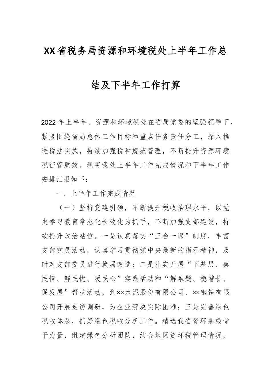 XX省税务局资源和环境税处上半年工作总结及下半年工作打算2022年上半年,资源和环境税处在省局党委的坚强领导下,紧紧围绕省局总体工作目标和重点任务责任分工,深入推进税法实施,持续加强税种规范管理,不断提升资源环境税征管质效。现将我处上半年工作完成情况和下半年工作安排汇报如下:一、上半年工作完成情况(一)坚持党建引领,不断提升税收治理水平。以党史学习教育常态化长效化为抓手,不断加强支部建设,持续提升政治站位。一是认真落实“三会一课”制度,丰富支部党员活动,认真学习贯彻党中央最新的指示精神,及时对支部委员进行换届改选;二是扎实开展“下基层、察民情、解民忧、暖民心”实践活动和“解难题、稳增长、促发展”帮扶活动,到××水泥股份有限公司、××钢铁有限公司开展走访调研,为企业解决实际困难;三是完善绿色税收体系,抓好绿色税收分析工作。精选我省资环条线骨干力量,组建绿色分析团队,结合地区资环税管理情况,密切跟踪我省重大战略发展,制定分析计划与方案。上半年指导完成《绿色税收助力××磷化工行业转型升级》和《双碳目标下绿色税收助力电力行业转型发展的思考》两篇绿色分析报告,为上级部门和领导了解绿色税收效用提供了有力抓手,更好地服务地方经济社会发展和生态文明建设大局。(二)守好主责主业,稳步提升资环税收入质量规模在当前经济下行,疫情反复,政策减税的严峻形势下,着力围绕中央“稳经济大盘稳增长”重要决策部署,按月开展税收优惠和收入情况分析,抓好收入监管,欠税监管和风险监管,2022年1-5月份,资源环境税五个税种完成收入××亿元,比去年同期增收××亿元,同比增长××%。一是召开全省资源和环保税专项工作推进会,传达税务总局和省局精神,部署今年各项重点工作,为有序完成资环税各项任务打下了良好的基础。二是加强欠税管理分析。通过对欠税金额较大的税种、区(县)局、企业进行调查分析,摸清资环税欠税户数、欠税金额、欠税原因等相关情况,提高欠税数据质量,做到情况明、底数清、数据准。三是建立耕地占用税台账管理制度,制发《关于进一步规范耕地占用税征收管理的通知》,针对耕地占用税增长幅度较大的情况,深入调查分析我省耕地占用税收入情况,完成《2019年-2022年5月全省耕地占用税收入分析报告》,获得了局领导好评。(三)强化责任担当,有效落实税收优惠政策。一是始终坚持王军局长“四力”要求,在“六税两费”优惠政策上做新文章,通过完善协作机制,突出数据赋能,创新实施“申报即享”和“无申请退税”追溯享受方式,让优惠直达快享。1-5月,全省累计办理增值税小规模纳税人、小型微利企业和个体工商户“六税两费”减免资源税、耕地占用税××户次,金额××万元,有力帮助了我省市场主体纾困解难。二是积极发挥资环税正向激励作用,引导企业落实节能环保,绿色发展战略,助力打赢污染防治攻坚战1-6月累计为符合条件的排污浓度值低于国家和地方规定标准的企业减免环保税××万元;为开采的共伴生矿的纳税人免征资源税××万元;为节约能源、使用新能源汽车的纳税人减免车船税××万元。(四)围绕问题整改,着力提升税种管理质效。一是积极做好总局巡视问题整改。针对巡视反馈我省未制发建筑施工扬尘环保税适用税额及环保税复核反馈不及时问题多次与省生态环境厅沟通协调,积极推动部门履行职责,加强环保税复核反馈工作,制发了《××省生态环境厅关于发布××省应税污染物施工扬尘排污特征值系数及计算方法的公告》,按期完成××笔环保税复核整改任务和8628笔有增值税信息无环保税信息核查任务,追征施工扬尘环保税税款××万元。二是主动跟进审计事项。对审计署××办下发的××条船舶车船税信息进行核实,目前对××条船舶追征车船税××万元。三是认真做好省局巡察整改审核评估工作。对××市、××市资源税和环境保护税巡察整改情况进行审核评估,发现××市两家企业资源税存在适用政策依据不足问题,及时向省局巡察办提出建议,同时指导基层单位完善政策依据,不断促进税种征管规范。(五)增强系统谋划,积极探索资环税管理新模式。一是积极开展资源税“一目一策”精准监...