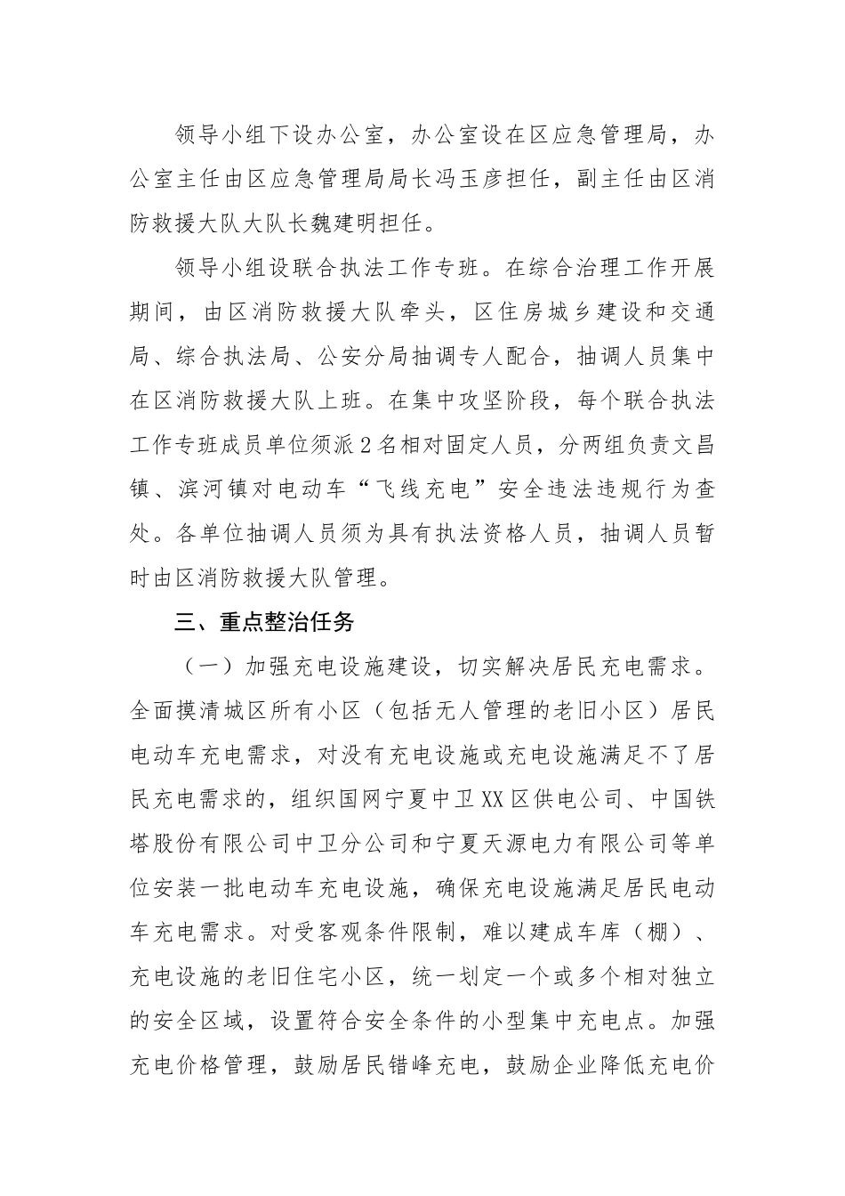 城区电动车“飞线充电”消防安全综合治理工作方案为加强全区电动车安全管理,从源头上消除“飞线充电”火灾隐患,预防和遏制因电动车“飞线充电”造成的火灾事故发生,确保广大人民群众生命财产安全,经区人民政府研究,决定开展城区电动车“飞线充电”消防安全综合治理工作。结合XX区实际,制定如下工作方案。一、工作目标坚持以群众实际需求为导向,通过配套设施建设和集中整治,在XX区城区建设一批电动车集中停放场所及充电设施。广泛开展消防宣传教育,加强违法违规和不文明的电动车充电行为整治,坚决杜绝电动车“飞线充电”现象,实现电动车充电规范、停放有序,确保不发生“飞线充电”火灾事故,保护广大人民群众生命财产安全。二、组织机构成立XX区城区电动车“飞线充电”消防安全综合治理领导小组,全面协调解决电动车“飞线充电”消防安全综合治理相关事宜。组长:王再龙区政府党组成员、三级调研员成员:区委组织部、宣传部、统战部、政法委分管负责人,区政府各部门、直属事业单位主要负责人,区公安分局分管负责人,区消防救援大队主要负责人,各乡镇人民政府主要负责人。领导小组下设办公室,办公室设在区应急管理局,办公室主任由区应急管理局局长冯玉彦担任,副主任由区消防救援大队大队长魏建明担任。领导小组设联合执法工作专班。在综合治理工作开展期间,由区消防救援大队牵头,区住房城乡建设和交通局、综合执法局、公安分局抽调专人配合,抽调人员集中在区消防救援大队上班。在集中攻坚阶段,每个联合执法工作专班成员单位须派2名相对固定人员,分两组负责文昌镇、滨河镇对电动车“飞线充电”安全违法违规行为查处。各单位抽调人员须为具有执法资格人员,抽调人员暂时由区消防救援大队管理。三、重点整治任务(一)加强充电设施建设,切实解决居民充电需求。全面摸清城区所有小区(包括无人管理的老旧小区)居民电动车充电需求,对没有充电设施或充电设施满足不了居民充电需求的,组织国网宁夏中卫XX区供电公司、中国铁塔股份有限公司中卫分公司和宁夏天源电力有限公司等单位安装一批电动车充电设施,确保充电设施满足居民电动车充电需求。对受客观条件限制,难以建成车库(棚)、充电设施的老旧住宅小区,统一划定一个或多个相对独立的安全区域,设置符合安全条件的小型集中充电点。加强充电价格管理,鼓励居民错峰充电,鼓励企业降低充电价格,降低居民充电成本。区人民政府对充电设施建设给予适当补助。责任单位:区住房城乡建设和交通局配合单位:区发展和改革局、区财政局、文昌镇、滨河镇(二)加大劝导力度,坚决杜绝“飞线充电”行为。健全和落实网格化管理制度,发动社区、物业公司、网格员、小区长、楼栋长、单元长,开展住宅小区、楼院公共区域电动车停放、充电消防安全检查,引导居民到规定的地点进行充电。及时劝阻和制止“飞线充电”行为,组织清理在共用过道、楼梯间、安全出口等公共区域违规停放、充电车辆,保障疏散通道、安全出口、消防车通道畅通,及时消除火灾隐患。劝阻和制止无效的,做好检查记录,留存好音频、视频、图像等资料,及时向消防救援、综合执法、公安部门报告。建立网格员入户签到制度,加强对各行政事业单位网格员的管理,督促定期入户开展宣传劝导工作。责任单位:文昌镇、滨河镇配合单位:区委组织部、区委宣传部、区住房城乡建设和交通局、区应急管理局、区综合执法局、区公安分局、区消防救援大队(三)加强联合执法,严厉打击违规充电行为。区消防救援大队、综合执法局、公安分局要明确专人负责,联合执法,对以下行为依法依规严肃处理:违反规定进行电动车充电,经督促整改拒不整改的;占用、堵塞、封闭疏散通道、安全出口或者有其他妨碍安全疏散行为的;辱骂、阻挠、殴打相关工作人员工作的;阻碍、扰乱执法人员依法执行公务等行为的。对因电动车充电引发火灾的,依法追究事故相关单位和人员的责任,并依法倒查生产、销售、改装等单位和人员的责任。责任单位:区消防救援大队配合单位:区住房城乡建设和交通局、区综合执法局、区公安分局(四)建立长效机制,切实巩固专项整治成果。各责任部门(单位)要按照“党...