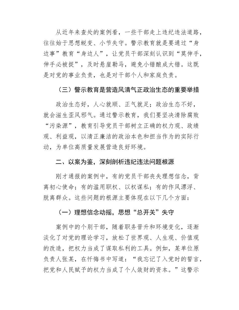 在警示教育大会上的讲话同志们:今天,我们召开警示教育大会,主要任务是深入贯彻落实党的二十大精神和习近平总书记关于全面从严治党的重要论述,通过剖析典型案例、以案为鉴、以案促改,进一步筑牢党员干部拒腐防变的思想防线,推动全面从严治党向纵深发展。刚才,我们集中观看了警示教育片,通报了近期查处的典型案例。这些案例触目惊心、发人深省,既是对我们的深刻警示,更是对全体党员干部的严肃提醒。下面,我结合工作实际,讲三点意见:一、提高政治站位,深刻认识警示教育的重要性(一)警示教育是推进全面从严治党的必然要求党的二十大报告指出,“全面从严治党永远在路上,党的自我革命永远在路上”。当前,反腐败斗争形势依然严峻复杂,一些领域腐败问题易发多发,个别党员干部理想信念滑坡、纪律意识淡薄,甚至突破底线、触碰红线。警示教育是全面从严治党的重要抓手,通过反面典型案例,让党员干部受警醒、明底线、知敬畏,从而自觉做到心有所畏、言有所戒、行有所止。(二)警示教育是保护干部、挽救同志的有效手段从近年来查处的案例看,一些干部走上违纪违法道路,往往始于思想蜕变、小节失守。警示教育就是要通过“身边事”教育“身边人”,让党员干部深刻认识到“莫伸手,伸手必被捉”,及时悬崖勒马,避免小错酿成大错。这既是对党的事业负责,也是对干部个人和家庭负责。(三)警示教育是营造风清气正政治生态的重要举措政治生态好,人心就顺、正气就足;政治生态不好,就会滋生歪风邪气。通过警示教育,我们要坚决清除腐败“污染源”,教育引导党员干部树立正确的权力观、政绩观、利益观,以清正廉洁的政治本色和担当作为的实际行动,为单位高质量发展营造良好环境。二、以案为鉴,深刻剖析违纪违法问题根源刚才通报的案例中,有的党员干部丧失理想信念,背离初心使命;有的滥用职权、以权谋私;有的作风漂浮、脱离群众。这些问题的根源主要体现在以下几个方面:(一)理想信念动摇,思想“总开关”失守案例中的个别干部,随着职务晋升和环境变化,逐渐淡化了对党的理论学习,放松了世界观、人生观、价值观的改造,把权力当成了谋取私利的工具。例如,某单位原负责人张某,在忏悔书中写道:“我忘记了入党时的誓言,把党和人民赋予的权力当成了个人敛财的资本。”这警示我们,理想信念滑坡是最危险的滑坡,必须时刻拧紧思想“总开关”。(二)纪律意识淡薄,制度执行“宽松软”部分案例暴露出制度执行不到位、监督缺位的问题。例如,某项目负责人王某在工程招标中违规操作,背后是单位内部监管流于形式、“三重一大”决策制度形同虚设。这说明,制度的生命力在于执行,必须强化制度刚性约束,扎紧织密“不能腐”的笼子。(三)侥幸心理作祟,自我要求“不严格”一些干部认为“只要不被发现,就不会出事”,甚至抱有“小错不断、大错不犯”的错误心态。例如,某财务人员李某挪用公款用于赌博,初期只是“借用”小额资金,最终越陷越深。这告诉我们,任何违纪违法行为都是从“第一次”开始的,必须时刻保持清醒头脑,坚决杜绝侥幸心理。(四)家风建设缺失,亲情关系“变了味”从案例看,个别干部不仅自身腐败,还纵容家属利用职务影响力谋取私利。例如,某领导干部赵某默许妻子在其管辖领域承揽工程,最终夫妻双双被查处。这警示我们,家风正则党风正,必须注重家庭、家教、家风建设,筑牢拒腐防变的家庭防线。三、以案促改,推动全面从严治党向纵深发展针对警示教育中暴露的问题,我们要坚持“不敢腐、不能腐、不想腐”一体推进,以“全周期管理”理念深化反腐败斗争,重点抓好以下几项工作:(一)强化理论武装,筑牢“不想腐”的思想根基1.深化主题教育:结合学习贯彻习近平新时代中国特色社会主义思想主题教育,组织党员干部系统学习党的创新理论,重点研读《习近平谈治国理政》第四卷、《中国共产党纪律处分条例》等,切实增强政治判断力、政治领悟力、政治执行力。2.创新教育形式:通过专题党课、廉政谈话、参观廉政教育基地、开展“家庭助廉”活动等方式,将警示教育融入日常、抓在经常,让党员干部真正入脑入心。(二)完善制度机制,扎紧“不能腐”的...