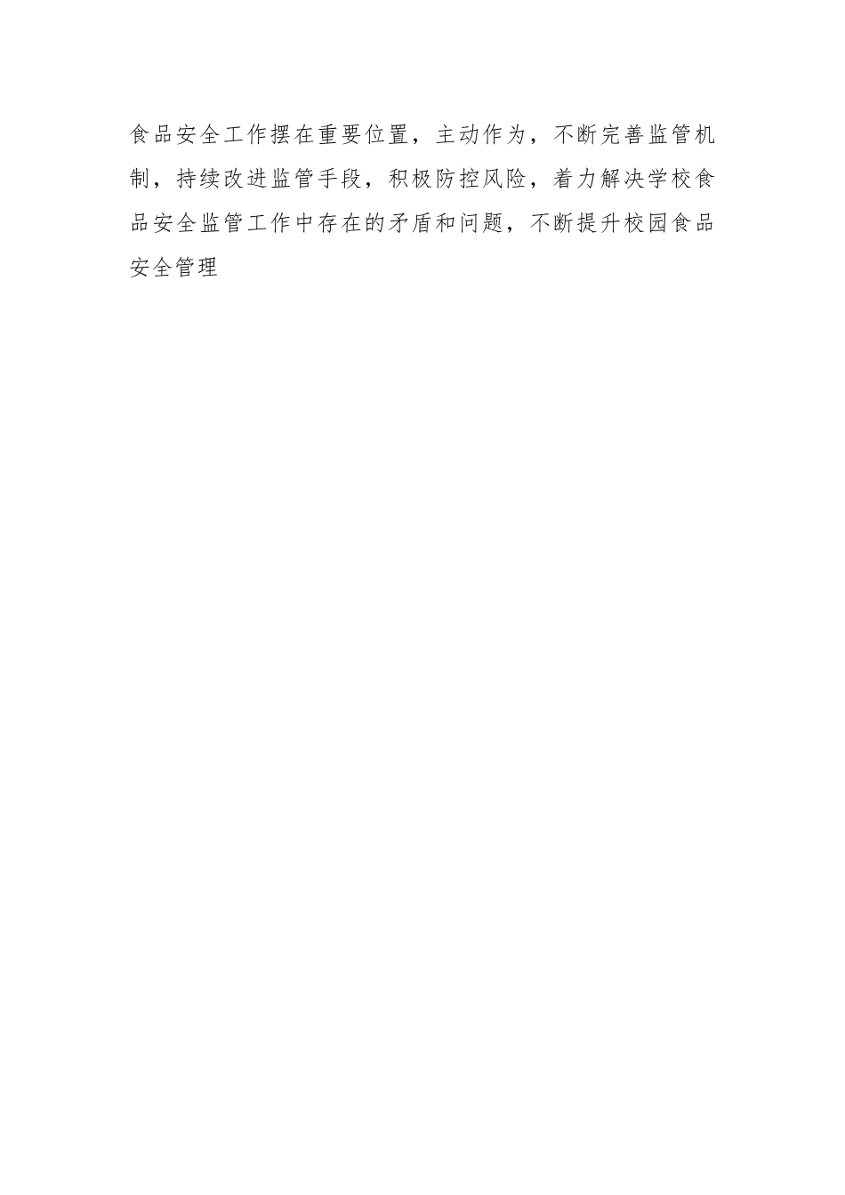 关于校园食品安全工作调研情况报告为全面了解和掌握我县校园(幼儿园)食品安全工作情况,统筹提升校园食品安全水平,根据县人大常委会2023年监督工作计划,4月上旬,县人大常委会组成调研组,深入*县高级中学、*幼儿园等学校采取实地查看、查阅资料、座谈讨论、听取汇报等形式,对全县校园(幼儿园)食品安全工作情况进行了专题调研,现将调研情况报告如下:一、基本情况截止2023年,全县共有各级各类学校*所,其中幼儿园*所(公办幼儿园*所,普惠性民办幼儿园*所)、寄宿制学校*所、走读学校*所。在校幼儿及高中小学学生**名,其中在园幼儿*名、小学生**名、初中生*名、高中生*名。现有高中小学教师*名、幼儿园教师*名。共开设学校食堂*个,其中中小学*个、幼儿园*个,从业人员*名。中小学和幼儿园“负责人陪餐率”均达100%,2022年以来全县校园内未发生食品安全事故。二、主要做法及成效县政府全面贯彻落实党的教育方针政策,始终把校园食品安全工作摆在重要位置,主动作为,不断完善监管机制,持续改进监管手段,积极防控风险,着力解决学校食品安全监管工作中存在的矛盾和问题,不断提升校园食品安全管理水平和安全事故防控能力,确保了我县校园食品安全总体可控。(一)加强组织领导,完善监管机制。县政府及教育行政主管部门深刻领会习近平总书记对食品安全工作提出的“四个最严”重大要求,认真贯彻落实《中华人民*国食品安全法》等相关法律规定,不断推进学校食堂及周边食品安全管理工作。确立学校食品安全监管工作在全县食品安全工作中的重要位置,以县教育行政主管部门牵头,各学校通过分级成立食品安全工作领导小组,全面实行食品安全校长责任制,明确校长为第一责任人,对学校食品安全负总责,把食品安全纳入校(园)长目标责任考核中,县政府、教育局、学校、年级、班级层层签订食品安全责任书,与学校重点工作同安排、同部署、同考核,促进各学校食品安全管理工作向规范化、标准化方向迈进,切实维护了学生的食品安全权益和身体健康。(二)健全完善制度,提高保障水平。建立健全《从业人员食品安全卫生管理制度》《食品安全突发事情应急预案》《学校食堂管理规定》等一系列规章制度,以制度促安全,促进各方责任落实,全方位构建各负其责、齐抓共管的工作局面。建立食堂从业人员健康登记、食品留样食品安全责任追究制度,严格规范用人、加工、存储、采购等环节工作,学校人员健康登记和食品留样均实现全覆盖;从原料采购、储存、加工、制作、人员招聘管理等各个环节、各个流程对学校食堂食品安全工作做出明确具体规定,严格实行食品原材料购买登记、验收制度,坚决杜绝不合格食品流入校园,做到全程“来源可查,过程可控”,全面实施“阳光厨房”项目,中小学幼儿园“明厨亮灶”实现全覆盖。(三)强化宣传教育,提升安全意识。一是充分利用宣传教育主阵地,多角度、全方位开展食品安全教育活动通过主题班会、宣传橱窗、黑板报、手抄报等形式进行宣传,进一步提高广大师生食品安全防范意识。二是深入开展“五个一”活动,即召开一次以食品安全教导为主题的国旗下讲话、一次食品安全教导主题班会、一次食品安全讲座、一次应急疏散演练、一次安全专项大检查,彻底排查食品安全隐患,确保安全教育活动有人抓、不脱节。三是加强校医、保育员和后勤工作人员业务知识培训,坚持培训上岗、持证上岗制度,提高从业人员食品安全意识,规范操作流程,增强责任感、使命感。四是坚持将食品安全教育纳入教学课程,通过各类专题讲座和宣传活动,提高学生的食品安全意识和自我防护能力;邀请专业人员对学校食品安全管理和从业人员进行职业道德、素质素养、食品安全知识和技能等培训,普及卫生健康知识,使学生对各方面卫生安全常识有了更系统的了解。(四)加强部门联动,防范风险隐患。完善学校食品安全监管网络,构建“综合协调+专业监管+基层综合执法”的食品安全监管体系,联合开展学校校园及周边食品安全专项治理,消除安全隐患。县教育、市监、卫健、公安等部门组成联合执法组,形成督查机制,定期或不定期对学校食品安全工作督查、抽查,确保学校食堂设施达标、卫生、整洁...