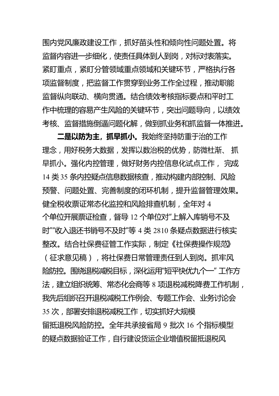 2022年度履行全面从严治党主体责任、落实“一岗双责”工作情况报告2022年以来,我始终坚持以习近平新时代中国特色社会主义思想为指导,认真学习贯彻党的二十大精神,坚决贯彻落实中央、省、市委关于全面从严治党的决策部署,切实扛起全面从严治党职责,坚持问题导向、加强研究谋划、狠抓整改落实、从严监督问责,以“两个永远在路上”的坚定和执着,推动党建工作上高度,廉政建设上层次,业务工作上水平现将有关情况报告如下:一、“一岗双责”履职情况一年来,我坚持把加强思想政治理论学习放在首位,认真领会党的二十大精神,在思想上、认识上、理论上、行动上与党中央始终保持高度一致。一是突出重点,强化责任。坚持以习近平新时代中国特色社会主义思想为指导,深入学习贯彻党的二十大精神,把党风廉政建设责任制贯穿在工作始终,严格落实党要管党全面从严治党要求。切实履行主体责任和“一岗双责”,坚持严字当头、严于修身、一严到底,以身作则带好队伍,做党风廉政建设责任制的践行者、执行者,当好引领者和示范者,切实把党风廉政建设同分管工作同部署、同落实、同检查、同推进。坚持从工作需求出发,我定期组织各科室负责人召开党风廉政建设专题工作会,及时研究、布置、检查分管范围内党风廉政建设工作,抓好苗头性和倾向性问题处置。将监督内容进一步细化,使责任具体到人到岗,对标对表落实。紧盯重点,紧盯分管领域重点领域和关键环节,严格执行各项监督制度,把监督工作贯穿到业务工作全过程,推动职能监督纵向联动、横向贯通。结合绩效考核指标要点和平时工作中梳理的容易产生风险的关键环节,突出问题导向,以绩效考核、监督措施倒逼问题化解,做到抓业务和抓监督一体推进。二是以防为主,抓早抓小。我始终坚持防重于治的工作理念,用好税务大数据,发挥以数治税的优势,防微杜渐、抓早抓小。强化内控管理,做好财务内控信息化试点工作,完成14类35条内控疑点信息数据核查,推动构建内部控制、风险预警、问题处置、完善制度的闭环机制,提升监督管理效果。健全税收票证常态化监控和风险排查机制,全年对4个单位开展票证检查,督导12个单位对“上解入库销号不及时”“收入退还书销号不及时”等4类2810条疑点数据进行核实整改。结合社保费征管工作实际,制定《社保费操作规范》(征求意见稿),将社保费日常管理责任到人到岗。抓牢风险防控。围绕退税减税目标,深化运用“短平快优九个一”工作方法,建立组织统筹、常态化会商等8项退税减税降费工作机制,我先后组织召开退税减税工作例会、专题工作会、业务讨论会35次,部署安排退税减税工作,切实抓好大规模留抵退税风险防控。全年共承接省局9批次16个指标模型的疑点数据验证工作,自行建设货运企业增值税留抵退税风险指标进行扫描,查补留抵退税xx万元。扎实抓好总局省局xxx户次风险任务,市局xx户次风险任务的应对,全市累计挽回留抵退税xxx万元,极大化解了风险,保护了干部,使政策红利有效精准直达企业主体。加强社保非税风险排查,梳理社保费单位缴费人17种风险情形和非税收入矿产资源类29个风险点,制定《社保非税专业化管理机构风险防控制度》,堵住征管漏洞。三是底线思维,守住红线。我坚定不移深化党风廉政建设和反腐败斗争,树牢底线思维,以时时放心不下的责任感,一体推动“三不”体制机制建设。守住政治底线。把抓好政治机关建设摆在首位,进一步严明政治纪律,坚定理想信念,定期组织分管科室党支部认真学习贯彻落实习近平新时代中国特色社会主义思想,严格落实“三会一课”、谈心谈话等制度,发挥支部纪检员作用,加强对党员遵规守纪情况常态监督。通过召开警示教育会、播放警示教育片、通报典型案例等,引导党员牢固树立“四个意识”,做到“两个维护”,在是非面前,旗帜鲜明讲原则,在问题面前,敢抓敢管动真格。守住组织收入底线。带领分管科室牢牢守住组织收入底线,坚持依法征收,坚决不收“过头税费”“寅吃卯粮”。2022年1-11月,全市税务系统累计组织各项收入入库xxx亿元,增长27.5%,增收xxx亿元。其中,组织税收xxx亿元,增长15.3%,增收xxx亿元,规模列全省第xx位,增幅列全省第x位。...