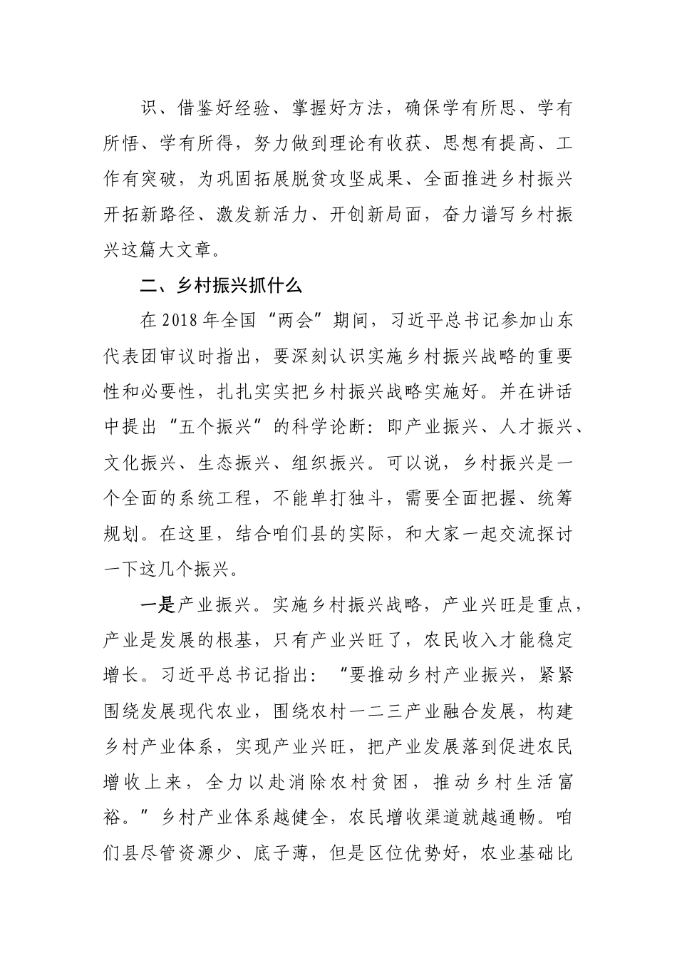 在xx县乡村振兴学校第一期培训会上的讲话同志们:本次培训是xx县乡村振兴工作领导小组办公室与xx县乡村振兴学校联合举办的一次培训,也是xx县乡村振兴学校成立以来开展的第一期培训。在此,我代表县委对同志们来乡村振兴学校参加培训表示热烈的欢迎,也对xx县乡村振兴学校的“正式开学”表示热烈的祝贺。下面,我结合此次培训讲三个方面内容。一、为什么开展这次培训乡村振兴是一项庞大的、系统的宏伟工程,要实现“产业兴旺、生态宜居、乡风文明、治理有效、生活富裕”五大要求,实现“农业强、农村美、农民富”的目标让广大农民过上新时代的乡村美好新生活,就必须要精准掌握乡村振兴的基本思路、目标任务以及政策举措,以培训为抓手,着力激活乡村振兴新动能。前几天我们召开了县委农村工作会议,我强调了今年“三农”工作的重点,明确了乡村振兴的思路、措施,开展这次培训班,是对会议精神的细化解读,对重点工作的具体安排,通过培训来让大家详细了解今年乡村振兴工作具体做什么、怎么做、做到什么程度、达到什么目的。大家要以本次培训为契机把乡村振兴的政策理论学深悟透,带着感情学、带着责任学、带着问题学,领会新知识、借鉴好经验、掌握好方法,确保学有所思、学有所悟、学有所得,努力做到理论有收获、思想有提高、工作有突破,为巩固拓展脱贫攻坚成果、全面推进乡村振兴开拓新路径、激发新活力、开创新局面,奋力谱写乡村振兴这篇大文章。二、乡村振兴抓什么在2018年全国“两会”期间,习近平总书记参加山东代表团审议时指出,要深刻认识实施乡村振兴战略的重要性和必要性,扎扎实实把乡村振兴战略实施好。并在讲话中提出“五个振兴”的科学论断:即产业振兴、人才振兴、文化振兴、生态振兴、组织振兴。可以说,乡村振兴是一个全面的系统工程,不能单打独斗,需要全面把握、统筹规划。在这里,结合咱们县的实际,和大家一起交流探讨一下这几个振兴。一是产业振兴。实施乡村振兴战略,产业兴旺是重点,产业是发展的根基,只有产业兴旺了,农民收入才能稳定增长。习近平总书记指出:“要推动乡村产业振兴,紧紧围绕发展现代农业,围绕农村一二三产业融合发展,构建乡村产业体系,实现产业兴旺,把产业发展落到促进农民增收上来,全力以赴消除农村贫困,推动乡村生活富裕。”乡村产业体系越健全,农民增收渠道就越通畅。咱们县尽管资源少、底子薄,但是区位优势好,农业基础比较强,我们要补短板、强优势,重点抓好特色产业发展,壮大集体经济,带动全县整体发展。首先,要放大我们传统农牧业优势。重点发展以冷凉蔬菜、燕麦、杂粮杂豆、散养鸡、蛋鸡等为主的农牧业特色产业。在十八台镇、大榆树乡规划冷凉蔬菜种植片区,大力发展凉冷蔬菜种植产业;在巴音锡勒、红召等乡镇,发展燕麦、杂粮杂豆等产业;要借助京蒙帮扶旅游带动,实现特色农产品走出去。要全力提升“金鸡产业”核心竞争力,促进蛋鸡养殖产业规模再提升,达到400万只。加快熏卤产业园区建设进度,持续放大“熏鸡之都”名片效应,全力推动“xx熏鸡”走向全国,力争年销售额突破5亿元。积极推进肉牛、肉羊、蛋鸡等养殖产业发展,利用海高牧业万头乳肉牛养殖项目实现我县乳业“破零”,实现“金鸡”“金牛”双轮驱动,不断推动养殖业规模化、集约化发展。其次,要积极发展休闲农业和旅游业。我们xx西邻自治区首府呼和浩特市,东接乌兰察布市府集宁区,呼张高铁、京藏高速、京新高速、110国道、呼兴运煤专线等20多条交通干线纵横过境,还有宝贝沟贺龙指挥部旧址、龙胜公园贺龙广场、辉腾锡勒草原景、红召九龙湾生态旅游区、林胡古塞旅游区、红石崖国家生态公园等旅游景点,有着发展壮大旅游业、服务业的天然优势建好明星沟、宿亥沟“小康示范村”,将民宿打造成为以健康养老、休闲度假为主的旅游新品牌。要合理布局、科学规划,鼓励引导农户发展集生态旅游、休闲观光、美食鉴赏、农事体验于一体的综合旅游项目,尽力增加就业,带动当地绿色农畜产品走出去,真正实现经济社会效益双提升,让更多的老百姓在家门口吃上“旅游饭”、吃饱“旅游饭”、吃好“旅游饭”,使旅游真正成为乡村振兴的重要突破口。第三,...