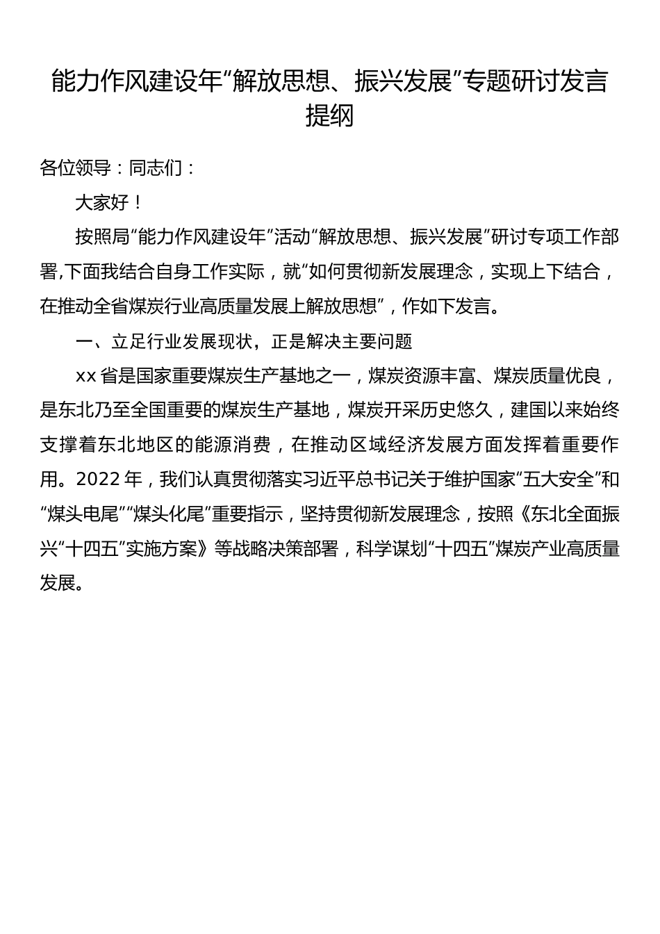 能力作风建设年“解放思想、振兴发展”专题研讨发言提纲各位领导:同志们:大家好!按照局“能力作风建设年”活动“解放思想、振兴发展”研讨专项工作部署,下面我结合自身工作实际,就“如何贯彻新发展理念,实现上下结合,在推动全省煤炭行业高质量发展上解放思想”,作如下发言。一、立足行业发展现状,正是解决主要问题xx省是国家重要煤炭生产基地之一,煤炭资源丰富、煤炭质量优良,是东北乃至全国重要的煤炭生产基地,煤炭开采历史悠久,建国以来始终支撑着东北地区的能源消费,在推动区域经济发展方面发挥着重要作用。2022年,我们认真贯彻落实习近平总书记关于维护国家“五大安全”和“煤头电尾”“煤头化尾”重要指示,坚持贯彻新发展理念,按照《东北全面振兴“十四五”实施方案》等战略决策部署,科学谋划“十四五”煤炭产业高质量发展。在谋划的过程中,我们回顾过去,成绩斐然;展望今后,未来可期。但要让我省的煤炭事业未来实现高质量发展,就必须以持续深化作风建设的决心,不断求实解放思想的态度去正视并解决目前存在的主要问题。一是煤炭供给不足。省内煤炭自给能力满足不了煤炭消费需求,迎风渡夏和冬季供暖保供成为最大的民生工作。二是产煤效率较低。升级改造矿井还没有形成产量,在建煤矿没能如期建成投产,优质产能没有及时释放。三是安全威胁严重。我省煤矿大部分经过长期开采,随着采深增加,地质构造愈加复杂,断层增多、煤层变薄、块段变小、倾角变大、顶板破碎等问题更加突出,煤与瓦斯突出、冲击地压、水害、自燃发火、热害等灾害耦合发生、威胁日益严重,安全生产压力越来越大,部分煤矿不能稳产达产。总的来看,“十四五”时期,我省煤炭工业发展转型与变革同在,机遇与挑战并存。我们应立足我省煤炭资源禀赋和供需状况的实际,以保障能源安全为中心,紧紧抓住提高煤炭自给能力这个“牛鼻子”,加快释放煤炭优质产能,推动煤炭资源安全清洁绿色高效开发利用,牢牢掌握能源安全的主动权。二、聚焦谋划发展思路,树立精准发力意识深入贯彻落实习近平总书记关于能源安全的一系列重要论述,切实以煤矿安全发展稳定环境,服务保障龙江全面振兴全方位振兴。紧紧围绕《实施方案》的部署要求,深刻领会、准确把握省委确定的未来五年龙江全面振兴全方位振兴奋斗目标、攻坚着力点和重点任务,扛牢使命、冲在前面、干在实处、主动作为,为我省推动全省煤炭行业高质量发展作出新的更大贡献。一是释放一批优质产能。以煤矿重点建设项目为抓手,加快推进中煤龙化依兰第三煤矿、龙煤鹤岗矿业公司鸟山煤矿、黑河市军金原有限公司、牡丹江顺祥等联合试运转煤矿竣工投产步伐,指导煤矿企业做好联合试运转、五个专项验收和竣工投产等环节的无缝衔接,确保年底前投产转产,全力以赴坚决完成省政府经济会议和我局“自我加压、跳起摸高”目标任务。二是提升一批优质产能。靠前指导服务,加快推进全省xx处煤矿升级改造项目开工建设,针对20处未完成项目审批的煤矿,积极帮助煤矿企业协调解决办理项目审批手续过程中遇到的问题和困难,指导企业提高报告和设计的编制质量,尽快办理审批手续。针对xx处已开工建设煤矿,指导企业合理优化施工组织,在保障完全的前提下,加快工程建设,力争2-3年内建成投产,力争2022年底前联合试运转或竣工投产15处、2023年底前联合试运转或竣工投产xx处。针对xx处审批手续齐全未开工建设煤矿,督促各产煤市(地)进一步深入查找未开工建设的原因,建立任务推进台账,确定包联职责人,推动煤矿尽快开工建设。三是培育发展一批优质产能。谋划鸡西合作煤矿立井、邱家等9个新(扩)建煤矿项目,改变近年来煤炭新资源开发利用少、煤矿新建设大型项目无的现状,有序推进煤矿重点项目前期工作,尽早达到项目核准、设计审批、开工建设等条件,扩大煤炭产能规模。力争到2025年,全省煤炭产能达到1.5亿吨/年,煤炭产量达到7500万吨,煤炭自给率提高到60%以上。三、坚持正确履行职责,强化责任担当作为煤炭行业管理部门的一员,我将坚持用新发展理念武装头脑、指导实践、推动工作,对《东北全面振兴“十四五”实施方案》等战略决策部署进行再学习再研究再...