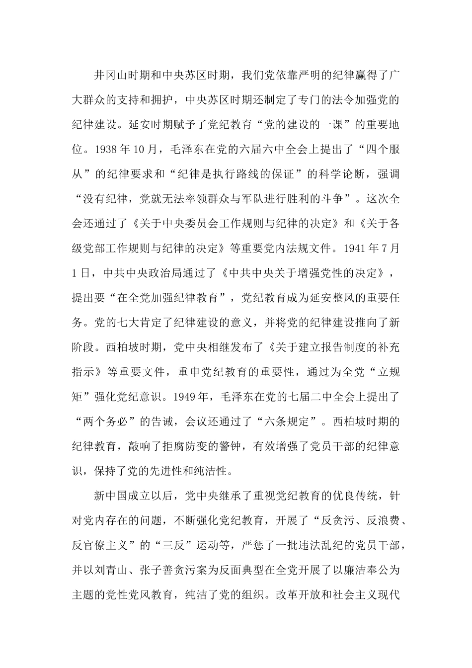 2024年党纪学习教育专题党课讲稿6篇与信访局2025年“十五五”规划编制之年党建工作计划3篇合编供参考2024年党纪学习教育专题党课讲稿6篇{目录}一、2024年党纪学习教育专题党课讲稿:以严的基调全面加强纪律建设二、2024年党纪学习教育党课讲稿2650范文:严明党的纪律规矩,展新时代干部风貌三、2024年党纪学习教育纪律教育专题党课讲稿3000字范文:严守纪律规矩永葆敬畏之心四、2024年党纪学习教育党课讲稿4370字范文:抓好党性、党风、党纪建设,推动全面从严治党取得新成效五、2024年党纪学习教育党课讲稿6090字范文:《中国共产党纪律处分条例》宣讲提纲六、2024年党纪学习教育党课讲稿:深入学习贯彻新修订的《中国共产党纪律处分条例》,将纪律要求内化于心外化于行2024党纪学习教育专题党课讲稿:以严的基调全面加强纪律建设组织严密、纪律严明是党的政治优势和优良传统。中共中央办公厅近日印发的《关于在全党开展党纪学习教育的通知》(以下简称《通知》),对2024年4月至7月在全党开展党纪学习教育作了全面部署,为开展党纪学习教育提供了根本遵循。在全党开展党纪学习教育,是我们党全面从严治党的又一重大举措,展现了党中央“自我革命永远在路上”的政治清醒和行动自觉,旨在把党建设得更加坚强有力。一、高度重视党纪学习教育是我们党的优良传统纪律是党的生命,重视党纪教育是党的优良传统和独特优势。早在立党之初,我们党就将严明的纪律写在了党章上,党的二大通过的第一部党章设“纪律”专章,着重强调党的组织纪律性和对党员的纪律要求,为党的纪律建设提供了“制度母版”。井冈山时期和中央苏区时期,我们党依靠严明的纪律赢得了广大群众的支持和拥护,中央苏区时期还制定了专门的法令加强党的纪律建设。延安时期赋予了党纪教育“党的建设的一课”的重要地位。1938年10月,毛泽东在党的六届六中全会上提出了“四个服从”的纪律要求和“纪律是执行路线的保证”的科学论断,强调“没有纪律,党就无法率领群众与军队进行胜利的斗争”。这次全会还通过了《关于中央委员会工作规则与纪律的决定》和《关于各级党部工作规则与纪律的决定》等重要党内法规文件。1941年7月1日,中共中央政治局通过了《中共中央关于增强党性的决定》,提出要“在全党加强纪律教育”,党纪教育成为延安整风的重要任务。党的七大肯定了纪律建设的意义,并将党的纪律建设推向了新阶段。西柏坡时期,党中央相继发布了《关于建立报告制度的补充指示》等重要文件,重申党纪教育的重要性,通过为全党“立规矩”强化党纪意识。1949年,毛泽东在党的七届二中全会上提出了“两个务必”的告诫,会议还通过了“六条规定”。西柏坡时期的纪律教育,敲响了拒腐防变的警钟,有效增强了党员干部的纪律意识,保持了党的先进性和纯洁性。新中国成立以后,党中央继承了重视党纪教育的优良传统,针对党内存在的问题,不断强化党纪教育,开展了“反贪污、反浪费、反官僚主义”的“三反”运动等,严惩了一批违法乱纪的党员干部,并以刘青山、张子善贪污案为反面典型在全党开展了以廉洁奉公为主题的党性党风教育,纯洁了党的组织。改革开放和社会主义现代化建设新时期,针对党的建设面临的新变化新问题,坚持“党要管党、从严治党”方针,以党内集中教育的方式强化党纪教育,党内环境得到净化,党风党纪得到重塑,改进了干部工作作风,推动党的建设迈上了新台阶。党的十二大修订的党章将纪律要求纳入党员必须履行的八项义务。党的十八大以来,以习近平同志为核心的党中央,坚持把纪律挺在加强党的建设的最前面,将纪律建设纳入党的建设总体布局,出台“八项规定”,开启了新时代加强党的纪律建设的新征程,并通过开展深入持久的党内教育,将党纪教育纳入党员干部教育体系之中,先后开展了党的群众路线教育实践活动和“三严三实”专题教育、“两学一做”学习教育、党史学习教育、学习贯彻习近平新时代中国特色社会主义思想主题教育等。与此同时,先后出台了《中国共产党廉洁自律准则》《关于新形势下党内政治生活的若干准则》《中国共产党问责条例》《党史学习教育工作条例》等一系列强化党纪的党规党法;党中央...