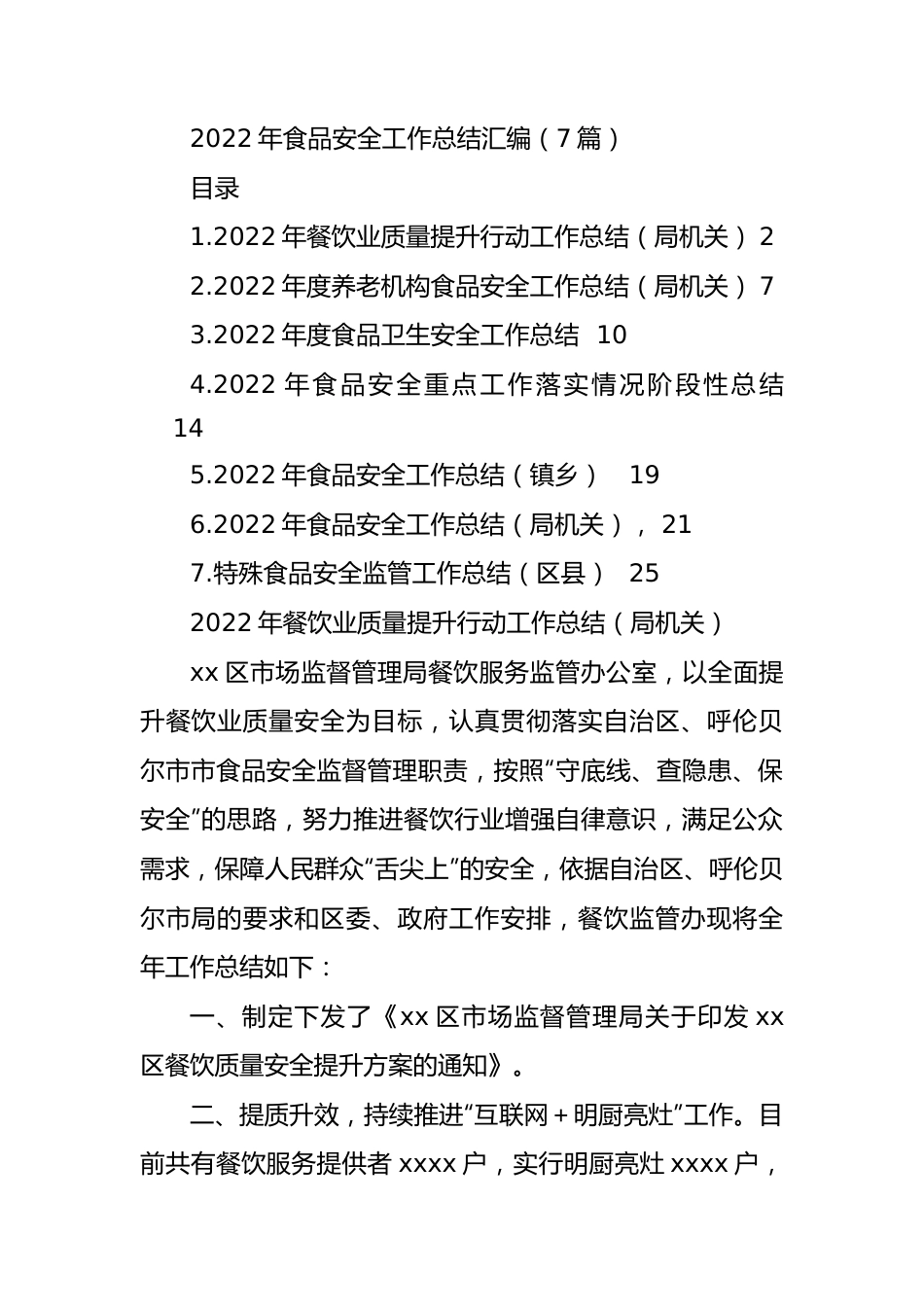 2022年食品安全工作总结汇编(7篇)目录1.2022年餐饮业质量提升行动工作总结(局机关)22.2022年度养老机构食品安全工作总结(局机关)73.2022年度食品卫生安全工作总结104.2022年食品安全重点工作落实情况阶段性总结145.2022年食品安全工作总结(镇乡)196.2022年食品安全工作总结(局机关),217.特殊食品安全监管工作总结(区县)252022年餐饮业质量提升行动工作总结(局机关)xx区市场监督管理局餐饮服务监管办公室,以全面提升餐饮业质量安全为目标,认真贯彻落实自治区、呼伦贝尔市市食品安全监督管理职责,按照“守底线、查隐患、保安全”的思路,努力推进餐饮行业增强自律意识,满足公众需求,保障人民群众“舌尖上”的安全,依据自治区、呼伦贝尔市局的要求和区委、政府工作安排,餐饮监管办现将全年工作总结如下:一、制定下发了《xx区市场监督管理局关于印发xx区餐饮质量安全提升方案的通知》。二、提质升效,持续推进“互联网+明厨亮灶”工作。目前共有餐饮服务提供者xxxx户,实行明厨亮灶xxxx户,完成比例xx.x%;实行“互联网+明厨亮灶”数xxx户,完成比例xx.x.%;共有餐饮服务提供者xxxx户,实行实行色标管理,完成比例xxx%;五常、xT、xD等食品安全管理方法数xxxx户,完成比例xx%;根据教育部门提供现共有学校、托幼机构食堂xx户。“明厨亮灶”实行数xx户,完成比例xxx%。,完成“互联网+明厨亮灶”xx家,完成比例xxx.xx%,以上工作持续开展中。三、开展餐饮服务风险分级管理工作。辖区内持证餐饮服务提供者(xxxx)家,完成率达到(xxx)%。其中:风险等级为A级风险的餐饮服务提供者(xxx)家,风险等级为B级风险的餐饮服务提供者(xxx)家,风险等级为C级风险的餐饮服务提供者(xxx)家,风险等级为D级风险的餐饮服务提供者(xxx)家。四、制定下发了《xx区市场监督管理局关于进一步加强反餐饮浪费监督工作的紧急通知》深入贯彻落实习近平总书记关于制止餐饮浪费行为的重要指示精神,全面遏制了餐饮服务环节“舌尖上的浪费”。五、提质升效,持续推进“餐饮服务网格化监管”实施工作。进一步明确食品安全监管责任,强化了食品安全属地管理责任,全面建立职责清晰,权责一致、运转高效的监管体制机制。六、开展餐饮全区学生“小饭桌”食品安全全覆盖监督检查工作。在全区范围内开展了一次“拉网式”大排查、大检查工作,对xx市学生“小饭桌”监督检查情况进行了清单统计汇总。七、联合开展校园食品安全守护行动。联合xx区教科局与xx区xx家学校(托幼机构),签订食堂食品安全责任状,明确学校、幼儿园疫情防控责任及注意事项。八、开展了全面加强餐厨垃圾专项整治活动。加强对餐厨废弃物的源头管理,加强xx区餐厨废弃物管理,规范餐厨废弃物处置,防止餐厨废弃物随意丢弃造成环境卫生问题,保障群众身体健康。与xx家餐饮服务单位签订《餐饮废弃物收运协议》。九、组织学习托幼机构及食堂人员参加了“两库一平台”培训。组织我区餐饮单位参加培训,xxx余人参加了网络培训。十、继续做好疫情常态化防控。制定印发了《xx区2022年进一步加强餐饮重点领域食品安全和疫情防控工作检查方案》。进一步加强了食品安全和疫情防控工作,有序推动复工复产,结合我区实际情况制定了本方案,持续加大了工作力度,细化了措施,落实了责任,降低了疫情传播风险,筑牢了食品安全防线。十一、积极开展建筑工地食堂疫情防控及食品安全检查。为加强建筑工地食堂食品安全监管贯彻落实疫情防控工作,督促落实食品安全主体责任,有效消除建筑工地食堂食品安全隐患,保障建筑工人饮食安全。我局对已开工的建筑工地食堂开展专项检查行动。此次检查重点检查了建筑工地食堂疫情防控工作、食品安全管理情况、从业员管理情况。我局执法人员在现场对建筑工地食堂负责人开展了普法宣传活动。通过此次检查提升了建筑工地食堂经营者的责任意识,规范了其经营行为。切实保障了建筑工地食堂食品安全。十二、开展旅游景区及周边餐饮单位整治提升行动。为进一步提升景区周边餐饮单位服务质量,xx区市场监督管理局多措并举、精准发力,开展景区及周边餐饮单位整治行动,全力保障景区及周边餐饮服务食品安全...