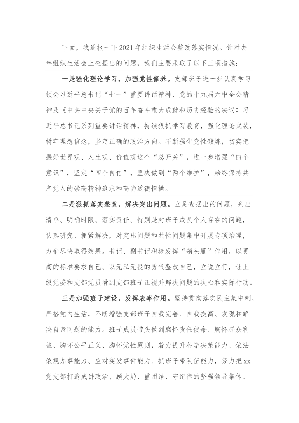 党支部2021年专题组织生活会前准备及整改落实情况下面由我通报一下此次专题组织生活会准备情况。会前,xx党支部做了充分的准备。着重抓好以下环节:一是制定筹备方案,确保准备充分。对会议时间、指导思想、要解决的问题及具体方法步骤等内容作了明确要求。二是确定会议主题。三是征求意见建议,解决实际问题。采取实地调查、发放征求意见表等形式,广泛征求了民警的意见建议,共征求建议2条。四是组织集体学习,提高思想共识。会前,重点学习了党的十九届六中全会精神、习近平总书记“七一”重要讲话精神、十九届六中全会精神及《中共中央关于党的百年奋斗重大成就和历史经验的决议》人民日报、新华社等权威媒体对总书记讲话的解读、XX学习教育等,深入学习了《中国共产党组织工作条例》《中国共产党纪律处分条例》等有关党内法规,进一步汇聚了每名同志思想认识,为开展好批评与自我批评奠定了良好的思想基础。五是广泛开展谈心,统一思想认识。会前,党支部书记、副书记,班子成员相互之间进行了广泛的个别谈心,交换了意见,统一了思想。六是认真准备发言,确保会议质量。班子成员严格对照会议要求进行深刻查摆剖析,认真撰写对照检查材料,形成了发言提纲。七是上报会议请示,争取上级指导。八是拟定会议通知,专门召开预备会。组织支部成员认真学习了组织生活会主要程序,并结合工作实际对支部班子对照检查材料进行了审议,提出了补充意见和建议。(通报完毕)下面,我通报一下2021年组织生活会整改落实情况。针对去年组织生活会上查摆出的问题,我们主要采取了以下三项措施:一是强化理论学习,加强党性修养。支部班子进一步认真学习领会习近平总书记“七一”重要讲话精神、党的十九届六中全会精神及《中共中央关于党的百年奋斗重大成就和历史经验的决议》习近平总书记系列重要讲话精神,持续狠抓学习教育,强化理论武装,树牢理想信念,坚定正确的政治方向。不断强化党性锻炼,切实把握好世界观、人生观、价值观这个“总开关”,进一步增强“四个意识”,坚定“四个自信”,坚决做到“两个维护”,始终保持共产党人的崇高精神追求和高尚道德情操。二是狠抓落实整改,解决突出问题。立足查摆出的问题,列出清单、明确时限、落实责任。特别是对班子成员个人存在的问题,认真研究、抓紧解决,对突出问题和共性问题集中开展专项治理,力争尽快取得效果。书记、副书记积极发挥“领头雁”作用,以更高的标准要求自己、以无私无畏的勇气整改自己,立说立行,让上级党委和支部党员看到支部班子正视并解决问题的决心和实际行动。三是加强班子建设,发挥表率作用。坚持贯彻落实民主集中制,严格党内生活,不断增强支部班子自我完善、自我提高、发现和解决自身问题的能力。班子成员带头做到胸怀责任使命、胸怀群众利益、胸怀公平正义、胸怀党性原则,着力提升科学决策能力、依法依规办事能力、应对突发事件能力、抓班子带队伍能力,努力把xx党支部打造成讲政治、顾大局、重团结、守纪律的坚强领导集体。(通报完毕)