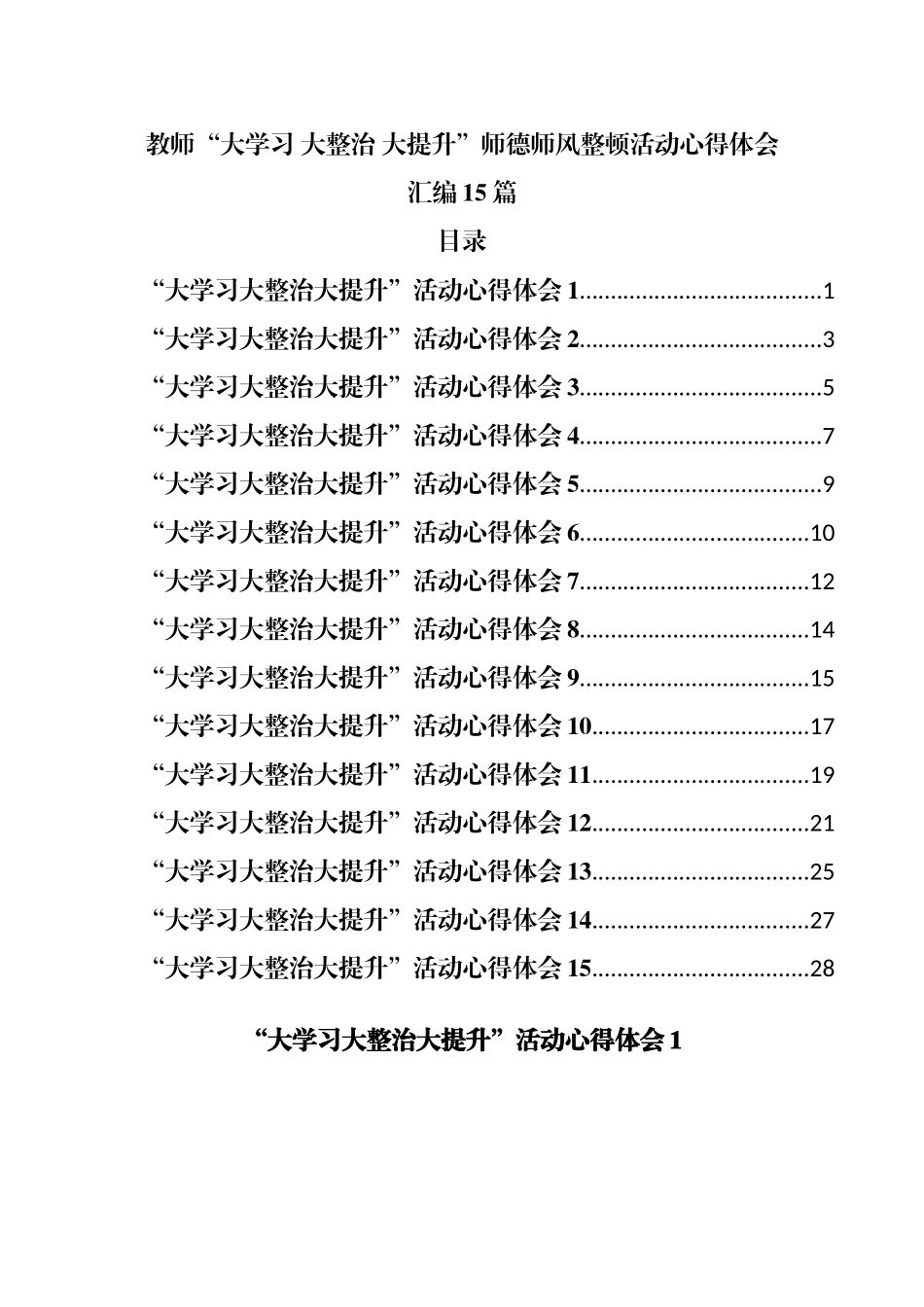 教师“大学习大整治大提升”师德师风整顿活动心得体会汇编15篇目录“大学习大整治大提升”活动心得体会1.......................................1“大学习大整治大提升”活动心得体会2.......................................3“大学习大整治大提升”活动心得体会3.......................................5“大学习大整治大提升”活动心得体会4.......................................7“大学习大整治大提升”活动心得体会5.......................................9“大学习大整治大提升”活动心得体会6.....................................10“大学习大整治大提升”活动心得体会7.....................................12“大学习大整治大提升”活动心得体会8.....................................14“大学习大整治大提升”活动心得体会9.....................................15“大学习大整治大提升”活动心得体会10...................................17“大学习大整治大提升”活动心得体会11...................................19“大学习大整治大提升”活动心得体会12...................................21“大学习大整治大提升”活动心得体会13...................................25“大学习大整治大提升”活动心得体会14...................................27“大学习大整治大提升”活动心得体会15...................................28“大学习大整治大提升”活动心得体会1高尚的师德是爱,是敬业,是精业。教师对孩子的“爱”应是真诚的、无私的、广泛的、一视同仁的。让自己消除浮躁,怀着“敬业、乐业、专业、创业”的精神,每天都带着一份好心情投入到工作中,带着微笑去迎接孩子,用爱和实际行动及人格魅力,去感染和滋润孩子幼小的心田是我从1993年入职第三幼儿园至今秉呈的一种态度,也是我一直努力的方向,通过教体局开展“大学习大整治大提升”活动让自己更加坚定了这个方向。师德师风对一个教师来说特别的重要。因为教师是孩子行动的标杆,教师的思想、行为、作风和品质,每时每刻都在感染、熏陶和影响孩子。在我园的师德师风建设过程中为了让教师在孩子及家长心目中树立良好的教师形象特制定了第三幼儿园教师行为规范细则10条,分别从教师的仪容仪表、行为举止、语言沟通等方面提出了明确的要求,每月确定两条重点内容,并通过行政巡班检查去抓落实,我园将借助教体局开展“大学习大整治大提升”这一东风,以新时代幼儿园教师职业行为十项准则为核心,把最基本的要求做细做实,全面提高教师师德素养,使我园师德师风向更好的方向转变,着力解决以教谋私、讥讽、歧视、体罚幼儿、有偿招生、有偿家教等有损教师形象的问题,努力创建一支具有“爱岗敬业、教书育人、为人师表”的教师队伍。新时代对广大教师落实立德树人根本任务提出新的更高要求,幼儿园教师的师德建设,不仅要求幼儿教师确立自己的儿童观、幼儿教育观、幼儿学习观,而且要求老师具有较多、较深的关于幼儿发展的知识和幼儿如何学习的知识,以及教师在教育实践中运用这些知识、信息的能力《做幼儿喜爱的魅力教师》这本书就是一粒饱满的种子,这本应时的读物在感动我们的同时,也引领我们悄悄的反思着:“幼儿的成长需要教师的爱,教师的专业发展也同样需要幼儿的爱”,她告诉我们做幼儿喜爱的魅力教师,我们要努力具备幼儿喜爱的条件:有爱心、有耐心、有童心、有快乐之心、有幽默、有才能等。我园将在“大学习大整治大提升”活动中通过这本书的分享,引导教师争做幼儿喜爱的魅力教师,让每个幼儿在爱的滋润下快乐健康的成长,让每位幼儿教师在充满爱的教育情境中快乐的工作!作为党员,我应该要有“功成不必在我”的气度和“久久为功”的韧劲,积极投身于工作和实践中,用爱和实际行动及人格魅力,去感染和滋润孩子幼小的心田。“大学习大整治大提升”活动心得体会2自2022年3月3日在xxx县教师进修学校聆听了全县教职员工队伍整顿暨“大学习大整治大提升”会议以来,对我触动很大。作为一名教师,我认为这次活动的开展很有必要,这是全面提升教师师德师风的必要途径。联系到近年来身...