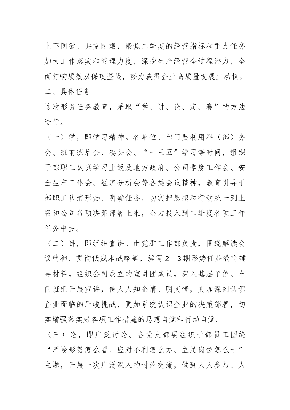 关于开展“严峻形势怎么看应对不利怎么办立足岗位怎么干”系列形势任务教育的实施意见根据公司季度工作会议部署要求,自5月份开始,在全公司启动开展“严峻形势怎么看、应对不利怎么办、立足岗位怎么干”系列形势任务教育,具体事宜安排如下:一、目的意义一季度以来,在各级共同努力下,公司整体工作稳步推进但也存在安全基础不稳固、生产系统有短板、生产组织不力、经营质效下降等问题,特别是干部职工的思想作风方面,面对严峻的形势,个别干部职工存在思想不紧、作风不硬、拼劲不足、大局意识和担当作为不强等问题,严重制约着公司各方面工作发展。二季度,公司仍然面临安全生产、政策约束、市场下行、增支减盈因素多、环保等诸多风险挑战,形势严峻复杂、任务艰巨繁重、责任异常重大,保持稳健发展的压力重重。开展“严峻形势怎么看、应对不利怎么办、立足岗位怎么干”系列形势任务教育,旨在引导各级切实认清公司发展面临的严峻形势,树牢危机意识和依法合规、低成本经营等理念,坚决破除“与己无关”的错误认识和“毛巾已拧干、潜力已挖尽”的畏难情绪,解放思想,转变作风,上下同欲、共克时艰,聚焦二季度的经营指标和重点任务加大工作落实和管理力度,深挖生产经营全过程潜力,全面打响质效双保攻坚战,努力赢得企业高质量发展主动权。二、具体任务这次形势任务教育,采取“学、讲、论、定、赛”的方法进行。(一)学,即学习精神。各单位、部门要利用科(部)务会、班前班后会、凑头会、“一三五”学习等时间,组织干部职工认真学习上级及地方政府、公司季度工作会、安全生产工作会、经济分析会等各类会议精神,教育引导干部职工认清形势、明确任务,切实把思想和行动统一到上级和公司各项决策部署上来,全力投入到二季度各项工作任务中去。(二)讲,即组织宣讲。由党群工作部负责,围绕解读会议精神、贯彻低成本战略等,编写2-3期形势任务教育辅导材料,组织公司成立的宣讲团成员,深入基层单位、车间班组开展宣讲,使人人知企情、明实情,更加深刻认识企业面临的严峻挑战,更加系统认识企业的决策部署,切实增强落实好各项工作措施的思想自觉和行动自觉。(三)论,即广泛讨论。各党支部要组织干部员工围绕“严峻形势怎么看、应对不利怎么办、立足岗位怎么干”主题,开展一次广泛深入的讨论交流,做到人人参与、人人思考、人人发言,找问题、查不足,提建议、说措施,达共识、齐行动,引导全员把外部压力转化为内生动力,把思想认识转化为具体行动,凝心聚力完成二季度各项目标任务。(四)定,即制定措施。各单位、部门要围绕二季度经营指标和重点任务,结合本单位实际,认真制定科学合理、执行有力的落实举措,做到目标任务、具体措施、责任人时间节点、考核奖惩“五明确”,切实把压力传递到每一个神经末梢,把指标落实到每一个具体岗位,形成千斤重担众人挑、人人头上有指标的良好工作格局和从我做起、实干担当的强大声势氛围。(五)赛,即开展竞赛。各党支部、各单位部门要紧扣公司二季度经营指标和重点任务,结合本单位、专业实际,从安全生产、精益管理、降本提效、学习提素、重点工作等方面,广泛展开对标竞赛、班组竞赛、岗位竞赛等活动细化量化指标,强化政策激励,形成比着上、赛着干的浓厚工作氛围。三、保障措施(一)加强组织领导。公司党群工作部在公司党委的领导下,具体负责此次形势任务教育活动的统筹策划和、组织实施和督导考核。各党支部书记、各单位部门负责人是本单位、部门开展形势任务教育的“第一责任人”,要认真贯彻、积极发动、精心组织,确保形势任务教育取得实效。(二)加强宣传发动。党群工作部要充分发挥公司微信公众号、宣传栏、电子屏等载体作用,灵活运用视频、音频等形式,广泛开展宣传造势,发动全员积极参与,让广大干部职工人人知晓此次形势任务教育的目的意义和措施要求,积极参与到各项工作中来。(三)加强督导考核。党群工作部将对各党支部、各单位部门形势任务教育活动的开展落实情况进行严格督导,对于活动质效好、竞赛实效好、月度无“三违”、超额完成生产任务、业务指标创纪录等的党支部,月度党建考核分别予以...