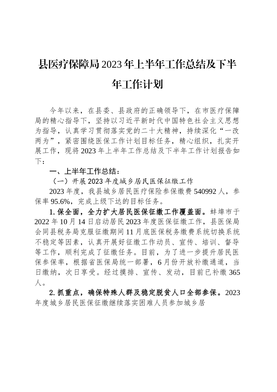 县医疗保障局2023年上半年工作总结及下半年工作计划今年以来,在县委、县政府的正确领导下,在市医疗保障局的精心指导下,坚持以习近平新时代中国特色社会主义思想为指导,认真学习贯彻落实党的二十大精神,持续深化“一改两为”,紧密围绕医保工作计划目标任务,精心组织,扎实开展工作,现将2023年上半年工作总结及下半年工作计划报告如下:一、上半年工作总结:(一)开展2023年度城乡居民医保征缴工作2023年度,我县城乡居民医疗保险参保缴费540992人,参保率95.6%,完成上级下达的目标任务。1.保全面,全力扩大居民医保征缴工作覆盖面。蚌埠市于2022年10月14日启动居民2023年度医保征缴工作,县医保局会同县税务局克服征缴期间11月底医保税务缴费系统切换系统不稳定等因素,认真开展好征缴工作动员、宣传、培训、督导等工作,顺利完成了征缴任务。目前,为了进一步提升居民医保参保率,根据省医保局统一部署,6月份开放补缴通道,当日缴纳,次日享受。经过摸排、宣传、发动,目前已补缴365人。2.抓重点,确保特殊人群及稳定脱贫人口全部参保。2023年度城乡居民医保征缴继续落实困难人员参加城乡居民个人缴费补贴政策,通过城乡医疗救助基金给予资助,共资助困难人员参保27285人,资助金额817.2万元,建立参保绿色通道,坚持动态清零。根据动态新增困难人员名单,及时办理参保登记,并在系统中精准标注属性,确保我县特困、低保、监测等特殊人群100%参保。3.建机制,确保参保群众及时准确享受待遇。由于今年省级层面进行了医保税务缴费系统切换,两个系统切换过程中发生了很多需要完善的地方,为了顺利有序开展征缴工作,我县积极建立了覆盖县、乡镇、村相关医保经办人员参与的微信群,针对有的群众无法正常参保缴费等问题在群里反馈,县医保局、县税务局、县医保中心根据各自职责第一时间给予解决,县级层面无法解决的问题上报市医保中心和系统工程师进行解决,畅通了问题解决渠道,确保群众顺利参保。(二)开展医保基金监管集中宣传月活动为进一步强化社会监督,自觉维护医保基金安全,大力营造“人人知法、人人守法、人人监督”的社会氛围,我县于4月份集中开展了以安全规范用基金、守好人民“看病钱”为主题的系列基金监管集中宣传月宣传活动。1.线上宣传。通过联通公司,以微信朋友圈方式投放安全规范用基金、守好人民“看病钱”为主题的基金监管集中宣传月朋友圈广告68万条,通过新媒体广泛开展宣传,扩大打击欺诈骗保社会知晓率和覆盖面,发挥震慑作用。2.线下宣传。集中宣传月开展以来,县医疗保障局印制宣传海报1000份、宣传折页2万份,租用2辆流动宣传车,深入各乡镇、村、社区、卫生室以张贴宣传海报,发放宣传折页等方式进行广泛宣传,各村通过乡村大喇叭、各定点医药机构通过大屏幕、滚动字幕等形式对打击欺诈骗保展开宣传。3.集中宣传。为持续保持打击欺诈骗取医保基金行为的高压态势,宣传解读医疗保障基金监管法律法规及相关政策规定,营造安全规范用基金,守好人民“看病钱”的浓厚舆论氛围,4月19日上午,XX县医疗保障局联合XX县人民医院在万福广场开展医保基金监管集中宣传活动,活动现场发放了宣传折页、宣传袋、宣传帽等宣传物品,设置了宣传展板、宣传彩虹门,县医院专家同步开展了义诊活动。通过集中开展宣传活动,以微信朋友圈、流动广告车、专家义诊、现场咨询等形式,扩大宣传覆盖面,引导群众正确认识加强基金监管的重要性和必要性。(三)开展巩固拓展医疗保障脱贫攻坚成果与乡村振兴有效衔接工作。1.分类资助参保,做实脱贫人口及困难人员应保尽保。2023年度城乡居民医保征缴继续落实困难人员参加城乡居民个人缴费补贴政策,通过城乡医疗救助基金给予资助,共资助困难人员参保27285人,资助金额817.2万元,建立参保绿色通道,坚持动态清零。根据动态新增困难人员名单,及时办理参保登记,并在系统中精准标注属性,确保我县特困、低保、监测等特殊人群100%参保。2023年度我县动态参保150人,其中,困难人员81人。2.抓好预警监测,构建防范脱贫人口和困难人员因病致贫返贫机制。医保、民政、乡村振兴等部门定期开展信息交换工作,安排专人每月及时...