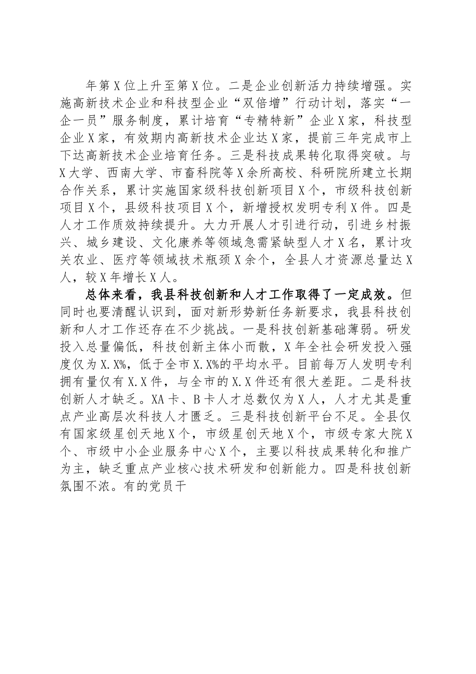 县委书记在全县科技创新和人才工作会议上的讲话同志们:今天,我们召开X县科技创新和人才工作会议,主要任务是以习近平新时代中国特色社会主义思想为指导,全面贯彻落实党的二十大精神,深入学习贯彻习近平总书记关于科技创新的重要论述和做好新时代人才工作的重要思想,深入贯彻市委六届二次、三次全会精神,认真落实全市科技创新和人才工作大会安排部署,以创新制胜、人才引领为现代化新X建设提供强劲动力。刚才,县委组织部、县经济信息委,分别汇报了全县科技创新和人才工作推进情况,X名优秀科技人才代表结合自己的工作实践和体会作了交流发言,大家讲得都很好,最主要的是干得好,干得好才讲得好。我听了之后,也很受启发。下面,我讲X点意见。一、切实增强做好科技创新和人才工作的责任感、使命感抓好科技创新和人才工作是推动高质量发展、创造高品质生活的迫切需要。特别是作为国家乡村振兴重点帮扶县,要实现在追赶中跨越、在跨越中领先,科技创新和人才工作是关键变量。全县上下务必提高站位、强化认识,紧跟党中央要求、时代前进步伐和事业发展需要,全力以赴做好科技创新和人才工作。1.深入学习领会习近平总书记关于科技创新的重要论述和做好新时代人才工作的重要思想。党的十八大以来,习近平总书记战略擘画科技强国、人才强国,提出一系列新思想新论断新要求,阐述了加快实施创新驱动发展战略和深入实施人才强国战略的方向目标、重大举措和基本要求,提出“科技是第一生产力、人才是第一资源、创新是第一动力”的重大论断,明确“加快建设世界重要人才中心和创新高地”的战略目标,树立“四个面向”的创新导向,部署“实现高水平科技自立自强”的重要任务,提出“完善科技创新体系”的改革要求,谋划“培养造就大批德才兼备的高素质人才”的发展大计。这些重要论述,为我们做好科技创新和人才工作提供了根本遵循,各级各部门要认真学习领会,切实用以武装头脑、指导实践、推动工作。2.准确把握全市科技创新和人才工作大会安排部署。X月X日,全市科技创新和人才工作大会召开,X书记在会上提出要坚持创新制胜,强化人才引领,加快建设具有全国影响力的科技创新中心,对未来X年全市科技创新和人才工作的总体要求、主要目标、基本思路和重点任务进行了系统安排部署。我们要抢抓成渝地区双城经济圈建设、西部陆海新通道、长江经济带发展等国家重大战略机遇,精准对接全市“X”现代制造业集群体系,聚焦全市“X”科技创新战略布局,结合X实际,因地制宜实施一批技术创新和应用示范项目,加快建设大巴山绿色发展科技创新示范县,以科技创新赋能全县高质量发展。3.正确看待我县科技创新和人才工作面临的形势。近年来,我们坚持以习近平新时代中国特色社会主义思想为指导,深入实施创新驱动发展战略,全面推进科教兴县、人才强县,科技创新和人才工作取得了明显进步。一是综合创新能力持续提升。出台《X县支持科技创新十五条政策》,全社会R&D投入达X万元,打破近X年无规上企业研发投入困局,全市科技创新考核由X年第X位上升至第X位。二是企业创新活力持续增强。实施高新技术企业和科技型企业“双倍增”行动计划,落实“一企一员”服务制度,累计培育“专精特新”企业X家,科技型企业X家,有效期内高新技术企业达X家,提前三年完成市上下达高新技术企业培育任务。三是科技成果转化取得突破。与X大学、西南大学、市畜科院等X余所高校、科研院所建立长期合作关系,累计实施国家级科技创新项目X个,市级科技创新项目X个,县级科技项目X个,新增授权发明专利X件。四是人才工作质效持续提升。大力开展人才引进行动,引进乡村振兴、城乡建设、文化康养等领域急需紧缺型人才X名,累计攻关农业、医疗等领域技术瓶颈X余个,全县人才资源总量达X人,较X年增长X人。总体来看,我县科技创新和人才工作取得了一定成效。但同时也要清醒认识到,面对新形势新任务新要求,我县科技创新和人才工作还存在不少挑战。一是科技创新基础薄弱。研发投入总量偏低,科技创新主体小而散,X年全社会研发投入强度仅为X.X%,低于全市X.X%的平均水平。目前每万人发明专利拥有量仅有X.X件,与全市的X.X件还有...