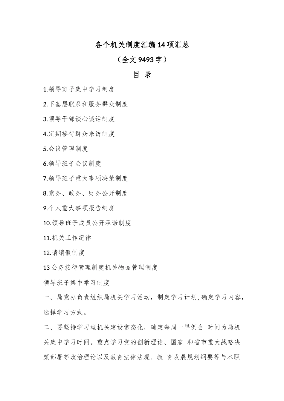 各个机关制度汇编14项汇总(全文9493字)目录1.领导班子集中学习制度2.下基层联系和服务群众制度3.领导干部谈心谈话制度4.定期接待群众来访制度5.会议管理制度6.领导班子会议制度7.领导班子重大事项决策制度8.党务、政务、财务公开制度9.个人重大事项报告制度10.领导班子成员公开承诺制度11.机关工作纪律12.请销假制度13公务接待管理制度机关物品管理制度领导班子集中学习制度一、局党办负责组织局机关学习活动,制定学习计划,确定学习内容,选择学习方式。二、要坚持学习型机关建设常态化,确定每周一早例会时间为局机关集中学习时间。重点学习党的创新理论、国家和省市重大战略决策部署等政治理论以及教育法律法规、教育发展规划纲要等与本职工作有关的业务知识、工作方式方法、创新手段和理念等。三、采取专人领学、辅导和讨论相结合、集中学习与个人自学相结合、全员记笔记与分层撰写心得体会相结合的方法,务求实效。四、集中学习实行签到制度,因事(含工作)因病不能参加学习活动的要向主管局长请假,并告知党办。学习笔记每半年检查一次,对记录不全、态度不认真的提出通报批评。下基层联系和服务群众制度领导干部联系群众、服务群众是进一步落实全心全意为人民服务宗旨的重要举措。结合XX局实际,制定本制度。一、领导干部要廉洁从政。要在局领导班子中进行权力观、地位观、利益观、廉洁自律教育,增强领导干部的拒腐防变能力,确保党风廉政建设取得实效。要求领导干部用党纪政纪条规约束从政行为,更多精彩范文请搜索:携笔同道。做到执政为民、不谋私利,用权为民、不搞特殊。管好自己和家属及身边工作人员,与职工同甘共苦,处理好党群干群关系。二、热情为群众排忧解难。要通过职代会、座谈会、谈心、慰问、处理信访等渠道,征求群众意见,倾听群众的呼声,及时了解群众的愿望和要求。注意做好职工的思想工作,帮助化解教职工之间的矛盾,注意关心职工的生活与疾苦,维护他们的合法利益,努力为职工服务。三、不断推进政务公开和党务公开。加强对政务、党务公开的组织领导,增强工作的透明度,以促进民主决策、民主管理和民主监督的深入发展。凡属职称、聘任、考勤、考核、评先、选优等涉及职工切身利益的事项均应以适当形式公开。四、接受群众的监督和评议。要以身作则,自觉接受群众的监督和评议。要充分利用党政联席会议制度等工作机制,充分倾听和采纳来自各个层面的意见。共产党员每半年要个别征求一次党外群众的意见,要接受一次群众的民主评议。对群众的监督和评议,都要做好基本情况和意见内容的记录,尊重群众的意见、批评和建议,并在征求意见和接受评议后,及时针对存在的问题进行整改。五、固定联系对象。要确定固定联系服务对象,每名领导联系1—2名群众。做到定期走访沟通。与联系的群众谈心交心,征求意见建议。每季度至少收集并反映一次联系对象的意见和建议,帮助维护其正当权益。重要事项应及时征求联系群众意见。六、开展主题活动。推行领导干部承诺服务,积极参与以服务群众为主要内容的主题实践活动。踊跃参加社会公益活动。领导干部谈心谈话制度为切实加强党员的教育和管理,及时了解和解决党员的实际困难,保持党员队伍的先进性和纯洁性,更好地发挥党员的先锋模范作用,特制定本制度。一、局党组和各基层党组织每年制定谈心谈话计划,局领导班子成员与基层普通党员的谈心谈话每月至少进行一次。二、谈心谈话可根据不同情况采取集体谈、个别谈等方式进行。三、谈心谈话要做好文字记录。四、谈话人在谈话前要做充分准备,明确谈话的主要内容和要求。谈话时,党员应如实向党组织汇报近期学习、思想、工作、生活等方面的情况。谈话人代表党组织对党员的工作要予以客观的评价,对存在的问题和不足要提出批评,并指明今后努力的方向。五、谈心谈话中要把开展批评、自我批评与帮助党员解决实际困难结合起来。既要严格按照党员标准要求党员,又要尊重、理解、关心、爱护党员,帮助他们解决生活上、工作中的实际困难。六、对平时通过谈心谈话掌握的情况,不便马上答复或一时难以解决的,要及时报告党组织主要负责人,经党组织集体研究后统一答复或协调解决...