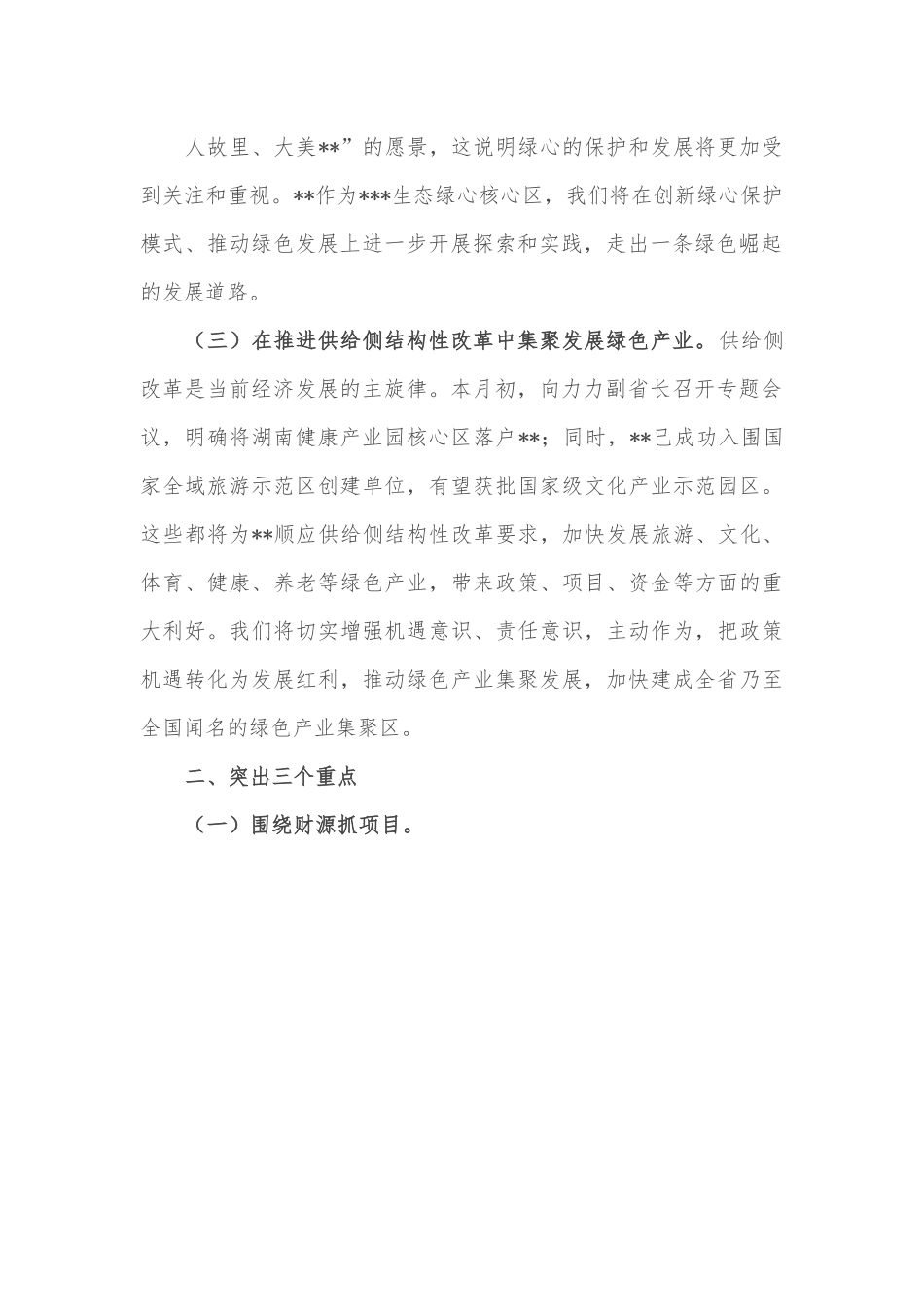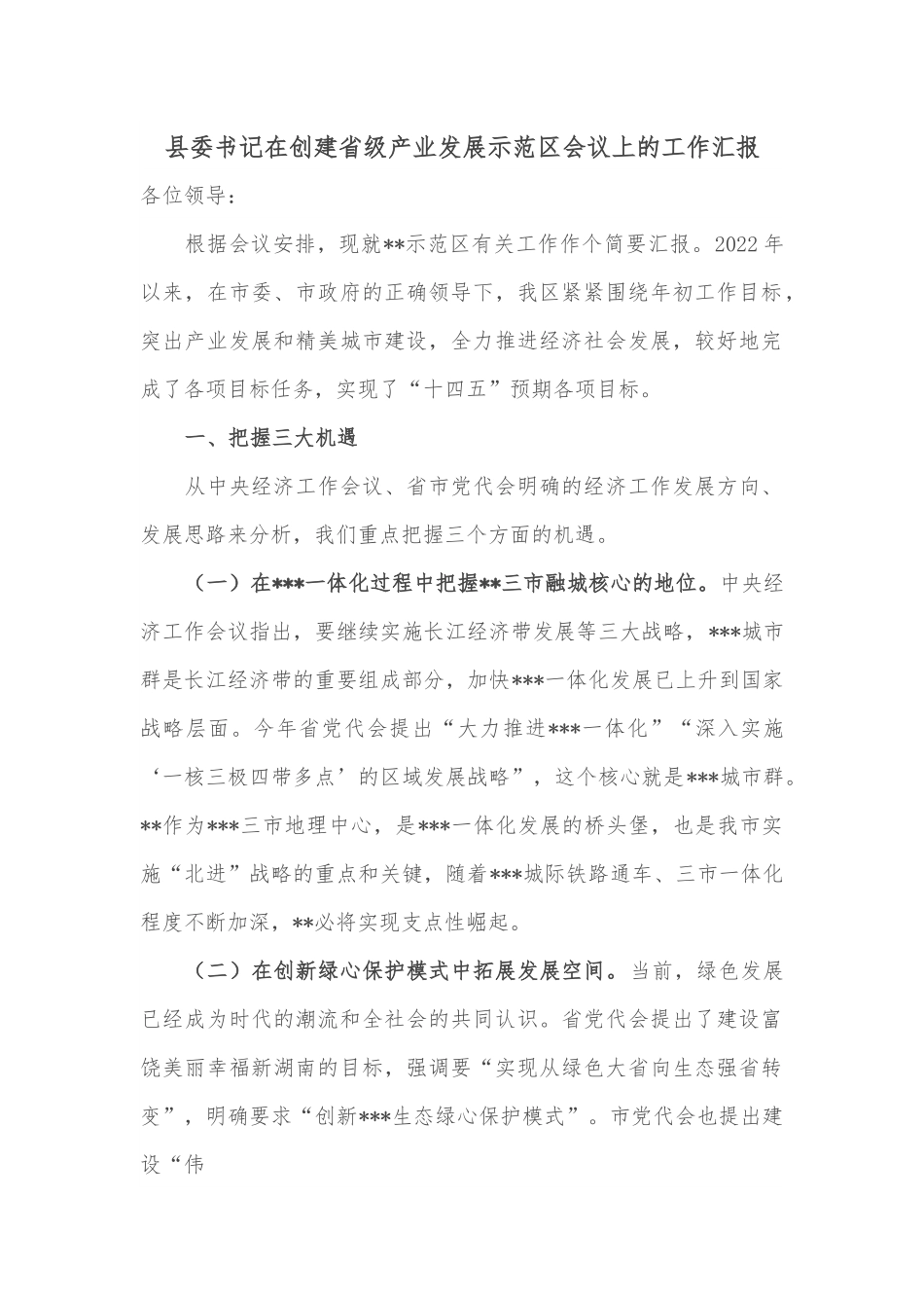 县委书记在创建省级产业发展示范区会议上的工作汇报各位领导:根据会议安排,现就**示范区有关工作作个简要汇报。2022年以来,在市委、市政府的正确领导下,我区紧紧围绕年初工作目标,突出产业发展和精美城市建设,全力推进经济社会发展,较好地完成了各项目标任务,实现了“十四五”预期各项目标。一、把握三大机遇从中央经济工作会议、省市党代会明确的经济工作发展方向、发展思路来分析,我们重点把握三个方面的机遇。(一)在***一体化过程中把握**三市融城核心的地位。中央经济工作会议指出,要继续实施长江经济带发展等三大战略,***城市群是长江经济带的重要组成部分,加快***一体化发展已上升到国家战略层面。今年省党代会提出“大力推进***一体化”“深入实施‘一核三极四带多点’的区域发展战略”,这个核心就是***城市群。**作为***三市地理中心,是***一体化发展的桥头堡,也是我市实施“北进”战略的重点和关键,随着***城际铁路通车、三市一体化程度不断加深,**必将实现支点性崛起。(二)在创新绿心保护模式中拓展发展空间。当前,绿色发展已经成为时代的潮流和全社会的共同认识。省党代会提出了建设富饶美丽幸福新湖南的目标,强调要“实现从绿色大省向生态强省转变”,明确要求“创新***生态绿心保护模式”。市党代会也提出建设“伟人故里、大美**”的愿景,这说明绿心的保护和发展将更加受到关注和重视。**作为***生态绿心核心区,我们将在创新绿心保护模式、推动绿色发展上进一步开展探索和实践,走出一条绿色崛起的发展道路。(三)在推进供给侧结构性改革中集聚发展绿色产业。供给侧改革是当前经济发展的主旋律。本月初,向力力副省长召开专题会议,明确将湖南健康产业园核心区落户**;同时,**已成功入围国家全域旅游示范区创建单位,有望获批国家级文化产业示范园区。这些都将为**顺应供给侧结构性改革要求,加快发展旅游、文化、体育、健康、养老等绿色产业,带来政策、项目、资金等方面的重大利好。我们将切实增强机遇意识、责任意识,主动作为,把政策机遇转化为发展红利,推动绿色产业集聚发展,加快建成全省乃至全国闻名的绿色产业集聚区。二、突出三个重点(一)围绕财源抓项目。树牢抓发展必须抓财源,抓财源必须抓项目的理念,通过项目建设培育财源、壮大财源。一方面,加大政府投入,全面完成区内基础设施和公共配套设施建设。加快推进精美**两年行动,完成湘江风光带**段建设,确保高速公路互通开通运营,全力推进棚户区改造、危房改造和城中村改造建设,加快城铁、铁路沿线风貌改造以及公路两侧房屋立面改造,提升城市形象;抓紧推进截污干管、省级**森林公园等生态建设项目,提升生态品质;加快市科技馆、示范中学、公立医院、邻里中心等公共配套设施建设,确保仰天湖公园对外开放,完善城市功能,在改善民生的同时为产业导入、人气聚集奠定基础。另一方面,以政府投资带动社会投资,引导社会资本加大投资力度,全力推动主导产业发展,加快推动湖南健康产业园、****文化旅游、**途居房车露营地、城市海景水上乐园、仰天湖度假中心、**全域旅游、***自主创新研发中心等11个重点产业项目建设,力争金南山谷总部基地等5个项目开工建设,实现健康产业强势起步,全域旅游奠定基础,文化产业初见成效。同时,深入开展企业帮扶行动,全力支持瑞泰科技等重点财源企业加大投入、扩大生产、加快发展,力争新增骨干财源企业5家以上。(二)突出产业抓招商。围绕生态旅游、文化创意、健康养生、高端商务等主导产业实施精准招商,积极对接一批主导产业方面的龙头企业,重点对接和引进中航航空大世界、湖南奥林匹克体育中心等10个产业项目,确保全年签订商务协议5个以上,引进资金不少于100亿元。同时,加快对接亿阳集团斯坦福医学院、湖南省信托健康养老中心、**大学***院士基因检测、***集团***健康小镇、**市中心医院生殖专科、世纪爱晚**健康旅游等项目并落地一批,实质性启动湖南健康产业园核心区建设。深度对接中国文化产业发展集团、东郊奥特莱斯小镇、恒大文化旅游、**养老旅游示范园等项目,储备一批项目。(三)巩固基层抓党建。始终把抓好党建作...