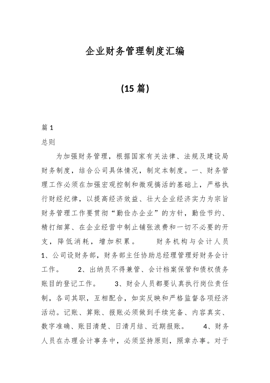 企业财务管理制度汇编(15篇)篇1总则为加强财务管理,根据国家有关法律、法规及建设局财务制度,结合公司具体情况,制定本制度。一、财务管理工作必须在加强宏观控制和微观搞活的基础上,严格执行财经纪律,以提高经济效益、壮大企业经济实力为宗旨财务管理工作要贯彻“勤俭办企业”的方针,勤俭节约、精打细算、在企业经营中制止铺张浪费和一切不必要的开支,降低消耗,增加积累。财务机构与会计人员1、公司设财务部,财务部主任协助总经理管理好财务会计工作。2、出纳员不得兼管、会计档案保管和债权债务账目的登记工作。3、财会人员都要认真执行岗位责任制,各司其职,互相配合,如实反映和严格监督各项经济活动。记账、算账、报账必须做到手续完备、内容真实、数字准确、账目清楚、日清月结、近期报账。4、财务人员在办理会计事务中,必须坚持原则,照章办事。对于违反财经纪律和财务制度的事项,必须拒绝付款、拒绝报销或拒绝执行,并及时向总经理报告。5、财会人员力求稳定,不随便调动。财务人员调动工作或因故离职,必须与接替人员办理交接手续,没有办清交接手续的,不得离职,亦不得中断会计工作。移交交接包括移交人经管的会计凭证、报表、账目、款项公章、实物及未了事项等。移交交接必须由建设局财务科监交。会计核算原则及科目1、公司严格执行《中华人民共和国会计法》、《会计人员职权条例》、《会计人员工作规则》等法律法规关于会计核算一般原则、会计凭证和账簿、内部审计和财产清查、成本清查等事项的规定。2、记账方法采用借贷记账法。记账原则采用权责发生制,以人民币为记账本位币。3、一切会计凭证、账簿、报表中各种文字记录用中文记载,数目字用阿拉伯数字记载。记载、书写必须使用钢笔,不得用铅笔及圆珠笔书写。4、公司以单价20xx元以上、使用年限一年以上的资产为固定资产,分为五大类:(1)房屋及其他建筑物;(2)机器设备;(3)电子设备(如微机、复印机、传真机等);(4)运输工具;(5)其他设备。各类固定资产折旧年限为:1、房屋及建筑物35年;2、机器设备10年;3、电子设备、运输工具5年;4、其他设备5年。固定资产以不计留残值提取折旧。固定资产提完折旧后仍可继续使用的,不再计提折旧;提前报废的固定资产要补提足折旧。购入的固定资产,以进价加运输、装卸、包装、保险等费用作为原则。需安装的固定资产,还应包括安装费用。企业财务管理制度2第一章总则第一条为加强公司的财务工作,发挥财务在公司经营管理和提高经济效益中的作用,特制定本制度。第二条公司财务部门的职能是:(一)认真贯彻执行国家有关的财务管理制度和税收制度,执行公司统一的财务制度。(二)建立健全财务管理的各种规章制度,编制财务计划,加强经营核算管理,反映、分析财务计划的执行情况,检查监督财务纪律的执行情况。(三)积极为经营管理服务,通过财务监督发现问题,提出改进意见,促进公司取得较好的经济效益。(四)厉行节约,合理分配和使用资金。(五)合理分配公司收入,及时完成需要上交的税收及管理费用。(六)积极主动与有关机构及财政、税务、银行部门沟通,及时掌握相关法律法规的变化,有效规范财务工作,及时提供财务报表和有关资料。(七)完成公司交给的其他工作。第三条公司设财务部,部门下设会计和出纳岗位。第四条公司各部门和职员办理财会事务,必须遵守本规定。第二章财务部门各个工作岗位职责第五条财务经理负责组织本公司的下列财务工作:(一)编制和执行预算、财务收支计划、信贷计划,拟订资金筹措和使用方案,开辟财源有效地使用资金;(二)进行成本费用预测、计划、控制、核算、分析和考核,督促本公司有关部门降低消耗、节约费用、提高经济效益;(三)建立健全经济核算制度,利用财务会计资料进行经济活动分析,及时向总经理提出合理化建议。(四)组织领导财务部门的工作,分配和监督其他人员的工作任务,制定考核奖惩指标;(五)负责建立和完善公司已有的财务核算体系,生产管理控制流程,成本归集分配制度;(六)分析公司财务、成本和利润的执行情况,挖掘增收节支潜力,考核资金使用效果,当好公司参谋。(七)承办公司领导交办的其他工作。第...