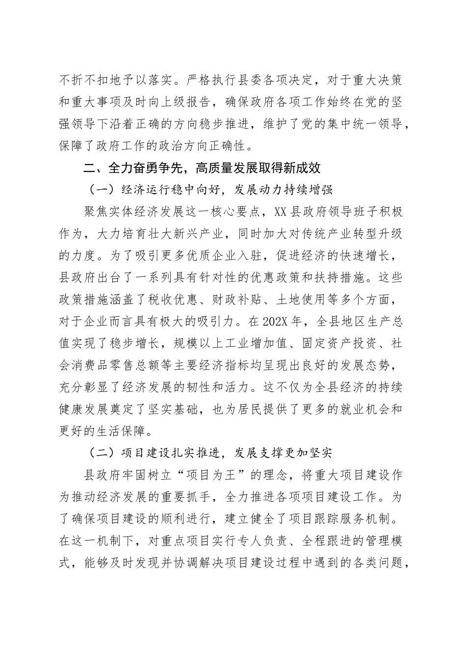 2024年度县政府领导班子工作总结(3739字)2024年,在时代发展的浪潮中,XX县政府领导班子始终坚守使命,坚持以XX思想为指导,全面且深入地贯彻XX和XX届X中、X中全会精神,切实将习近平总书记视察XX重要讲话精神以及中央、省、市重大决策部署与县委工作要求落到实处,紧紧锚定“走在前、开新局”的宏伟目标,全力以赴推动各项工作朝着“事争一流、唯旗是夺”的方向迈进,由此使得政府系统各项工作实现了质的飞跃,稳稳地迈上新台阶。一、强化思想引领,履职能力稳步提升(一)筑牢思想根基,政治立场更加坚定县政府领导班子深刻认识到思想根基对于履行职责的重要性,故而严格落实县政府常务会议“第一议题”制度。这一制度的有效执行,确保了各班子成员能够第一时间精准掌握中央最新决策部署要求,使其在工作中始终保持与党中央决策的高度一致性。同时,为了进一步深化思想建设,县政府高标准组织开展县政府党组理论学习中心组集中学习研讨活动。在活动开展过程中,精心科学地制定自学计划,要求班子成员及时跟进学习新思想、新观点、新论断以及中央、省、市重大决策部署等内容。通过这样系统且深入的学习方式,切实将理论学习所取得的成效转化为推动高质量发展的实际行动。在日常工作与决策中,始终牢固树立“四个意识”,坚定不移地坚定“四个自信”,不折不扣地做到“两个维护”,以高度的政治自觉严格遵守政治纪律和政治规矩,为各项工作的顺利开展奠定了坚实的政治基础。(二)深入调查研究,工作质效显著提升紧扣高质量发展这一时代主题,县政府领导班子坚持紧贴中心工作、全力服务发展大局,将调查研究视作一项具有战略性、长期性以及基础性的重要工作来抓。各班子成员积极深入到创新发展的最前沿阵地,以及群众生产生活的第一线,以精准、细致的态度开展调查研究工作。他们深入了解企业的创新需求、群众的生活诉求以及社会发展的痛点难点等诸多方面,从而为推动高质量发展掌握了最为真实、可靠的第一手资料。在此基础上,结合调研所反映的实际情况,及时且有针对性地对政府系统工作进行改进与完善。通过这种方式,真正将调研成果转化为推动经济社会高质量发展的实际举措,使得政府系统工作的质量与效率得以持续提升,为全县经济社会的发展注入了源源不断的动力。(三)加强政治建设,党性修养不断加强在政治建设方面,县政府领导班子始终保持高度的重视。严肃党内政治生活,严格按照新形势下党内政治生活的若干准则的要求执行相关规定,深入落实“三会一课”、党性分析、双重组织生活等各项重要制度。通过这些制度的有效落实,各班子成员的党性修养和整体素质得以稳步提升。在实际工作中,他们始终坚定不移地贯彻党中央决策部署,对省市工作要求也不折不扣地予以落实。严格执行县委各项决定,对于重大决策和重大事项及时向上级报告,确保政府各项工作始终在党的坚强领导下沿着正确的方向稳步推进,维护了党的集中统一领导,保障了政府工作的政治方向正确性。二、全力奋勇争先,高质量发展取得新成效(一)经济运行稳中向好,发展动力持续增强聚焦实体经济发展这一核心要点,XX县政府领导班子积极作为,大力培育壮大新兴产业,同时加大对传统产业转型升级的力度。为了吸引更多优质企业入驻,促进经济的快速增长,县政府出台了一系列具有针对性的优惠政策和扶持措施。这些政策措施涵盖了税收优惠、财政补贴、土地使用等多个方面,对于企业而言具有极大的吸引力。在202X年,全县地区生产总值实现了稳步增长,规模以上工业增加值、固定资产投资、社会消费品零售总额等主要经济指标均呈现出良好的发展态势,充分彰显了经济发展的韧性和活力。这不仅为全县经济的持续健康发展奠定了坚实基础,也为居民提供了更多的就业机会和更好的生活保障。(二)项目建设扎实推进,发展支撑更加坚实县政府牢固树立“项目为王”的理念,将重大项目建设作为推动经济发展的重要抓手,全力推进各项项目建设工作。为了确保项目建设的顺利进行,建立健全了项目跟踪服务机制。在这一机制下,对重点项目实行专人负责、全程跟进的管理模式,能够及时发现并协调解决项目建设过程中遇到的各类问题,如土地...