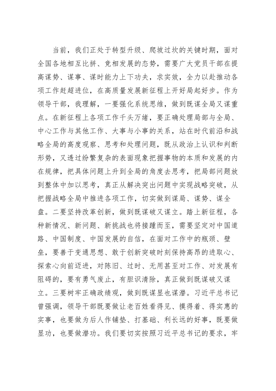 “”高质量发展,我该谋什么专题研讨发言当前,我们正处于转型升级、爬坡过坎的关键时期,面对全国各地相互比拼、竞相发展的态势,需要广大党员干部在提高谋势、谋事、谋时能力上下功夫,求实效,全力以赴推动各项工作赶超进位,在高质量发展新征程上开好局起好步。作为领导干部,我理解,一要强化系统思维,做到既谋全局又谋重点。在新征程上各项工作千头万绪,要正确处理局部与全局、中心工作与其他工作、大事与小事的关系,站在时代前沿和战略全局的高度观察、思考和处理问题,既从政治上认识和判断形势,又透过纷繁复杂的表面现象把握事物的本质和发展的内在规律,把具体问题上升到全局的角度去思考,把局部问题放到整体中加以思考,真正从解决突出问题中实现战略突破,从把握战略全局中推进各项工作,切实做到谋局、谋势、谋全盘。二要坚持改革创新,做到既谋破又谋立。踏上新征程,各种新情况、新问题、新挑战也将接踵而至,需要坚定对中国道路、中国制度、中国发展的自信,在面对工作中的瓶颈、壁垒,要善于变通思想、敢于创新突破时刻保持高昂的进取心、探索心向前迈进,对陈旧、过时、无用甚至对工作、对发展有阻碍的,要有勇气废止,有胆识清除,真正做到既谋破又谋立。三要树牢正确政绩观,做到既谋显也谋潜。习近平总书记曾强调,领导干部既要做让老百姓看得见、摸得着、得实惠的实事,也要做为后人作铺垫、打基础、利长远的好事,既要做显功,也要做潜功。我们要切实按照习近平总书记的要求,牢固树立正确的政绩观,尽心尽力干好党和人民的事,特别是对群众不满意的最迫切需要解决的问题,不要拖,马上办,而且要尽快见成效,以功成不必在我,功成必定有我的博大胸怀和奉献精神,积极为党和人民建功立业。在新征程上,要始终坚守组织路线服务政治路线原则,在服务大局中坚定政治方向,在聚焦主业中把握职责定位,多谋长远之策、多行固本之举、多发精准之力,为现代化建设大局作出组织贡献。重点做到“四个必须”,抓好“四个方面”工作。做到“三个必须”:一是必须牢牢把握应党而生、为党而存的政治站位。始终把旗帜鲜明讲政治摆在首要位置,坚持以政治建设为统领,选人用人突出政治标准,组织建设突出政治功能,人才工作突出政治引领,确保每项工作都有好的政治导向、政治影响、政治效果。二是必须善于运用系统谋划、统筹推进的工作方法。把系统观念贯穿到工作全过程,谋划工作通盘考虑,出台政策相互衔接,力量摆布统筹兼顾,做到与党委同向而行、同频共振,与其他部门相互衔接、相互协调,切实增强工作的整体性、协同性。三是必须充分发扬真抓实干、攻坚克难的务实精神。把实践实干实效要求贯穿组织工作全过程,把抓落实作为开展工作的主要方式,加强调查研究,经常“解剖麻雀”,对确定的目标任务紧盯不放、一抓到底。抓好“三个方面”工作:一是知行合一铸好“魂”,为实现高质量发展打牢思想基础。始终把政治建设摆在首位,坚持不懈用习近平新时代中国特色社会主义思想凝心铸魂,根据中央统一部署,加强统筹谋划,精心组织实施好主题教育,综合运用专题学习、宣传宣讲、实践活动、检视问题和整改落实等方式,推动各级党组织和广大党员干部全面系统学、持续深入学、联系实际学,把握好这一思想的世界观和方法论,坚持好、运用好贯穿其中的立场观点方法,切实把党的创新理论转化为坚定理想、锤炼党性和指导实践、推动工作的强大力量。二是上下贯通塑好“形”,为实现高质量发展严密组织体系。坚持大抓基层的鲜明导向,持续深化抓党建促乡村振兴、促基层治理,深入实施村级组织带头人雁阵培育计划,拓展“党建+产业”组织振兴模式,持续推动村级集体经济“提标倍增”,引导各级党组织和党员在城市更新中找位置、在产业链建设中看作用,以点带面引领带动基层党建工作整体提升。注重从青年、产业工人、农民、知识分子中发展党员,严肃稳妥处置不合格党员,把各方面先进分子和优秀人才吸收进来、组织起来,增强党组织肌体活力,让组织体系的经脉气血更加畅通。三是公道正派选好“人”,为实现高质量发展提供力量保障。鲜明树立正确的选人用人导向,不断强化干部思想...