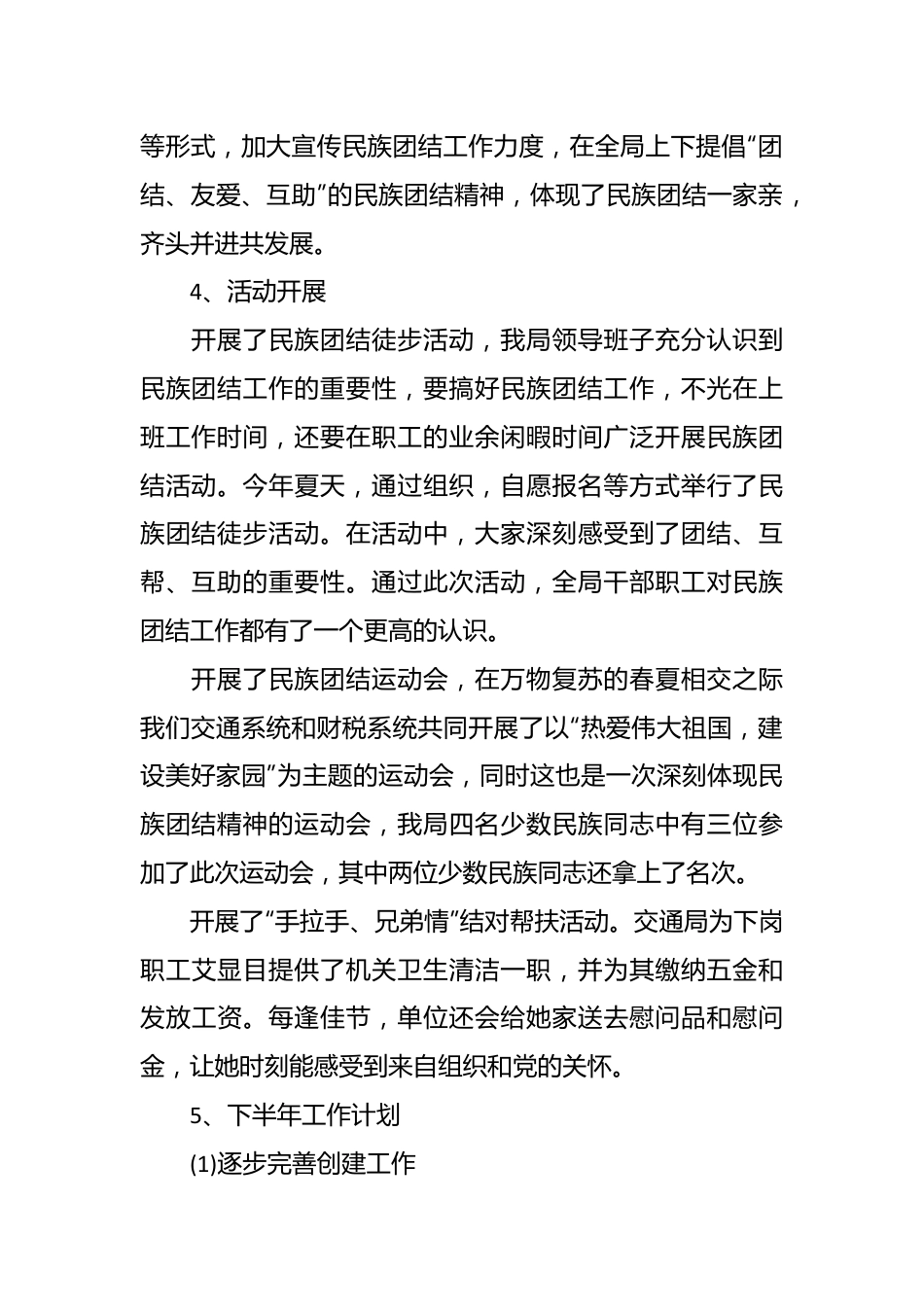 关于民族团结进步创建活动工作汇报(9篇)篇1今年我局民族团结工作以第30个民族团结教育月为切入点,立足实际,结合“热爱伟大祖国,建设美好家园”主题活动,坚持贴近实际,贴近生活,贴近群众,开展了以“肩并肩、爱国情”团结共建,“手拉手、兄弟情”结对帮扶,“根连根,骨肉情”温暖入户为主题的教育活动。1、领导重视我局领导高度重视民族团结工作,把民族团结工作纳入交通工作重要议事日程,与交通业务工作相结合,使民族团结工作真正融入到我局工作的方方面面。2、组织机构健全我局民族团结工作能做到由领导班子进行会议讨论,由办公室制定工作计划、活动方案,做到思想统一、目标明确。加强组织内部管理,提高管理水平及组织功效。根据《新疆维吾尔自治区民族团结教育条例》,我局民族团结工作完善了各项规章制度,形成一系列的管理措施。3、注重宣传积极组织会员学习,利用学习、横幅、公交车张贴标语等形式,加大宣传民族团结工作力度,在全局上下提倡“团结、友爱、互助”的民族团结精神,体现了民族团结一家亲,齐头并进共发展。4、活动开展开展了民族团结徒步活动,我局领导班子充分认识到民族团结工作的重要性,要搞好民族团结工作,不光在上班工作时间,还要在职工的业余闲暇时间广泛开展民族团结活动。今年夏天,通过组织,自愿报名等方式举行了民族团结徒步活动。在活动中,大家深刻感受到了团结、互帮、互助的重要性。通过此次活动,全局干部职工对民族团结工作都有了一个更高的认识。开展了民族团结运动会,在万物复苏的春夏相交之际我们交通系统和财税系统共同开展了以“热爱伟大祖国,建设美好家园”为主题的运动会,同时这也是一次深刻体现民族团结精神的运动会,我局四名少数民族同志中有三位参加了此次运动会,其中两位少数民族同志还拿上了名次。开展了“手拉手、兄弟情”结对帮扶活动。交通局为下岗职工艾显目提供了机关卫生清洁一职,并为其缴纳五金和发放工资。每逢佳节,单位还会给她家送去慰问品和慰问金,让她时刻能感受到来自组织和党的关怀。5、下半年工作计划(1)逐步完善创建工作(2)增强民族团结精神,积极开办活动。(3)继续发扬、宣传有关知识。(4)加强与帮扶对象的联系,更详细的了解他们的困难,争取开展更全面,更细致的帮扶活动。民族团结进步创建活动工作汇报篇2山西省是少数民族散杂居省份,有53个少数民族成份近12万人,约占全省总人口0.35%,呈大分散、小聚居特点。由于处在连接我国东西部回族带的中心地区,我省少数民族人口总量虽少,但在全国有一定影响。全省有42个少数民族聚居村,分布在6市22个县,除1个蒙古族聚居村外,其余都为回族聚居村。有近百个少数民族相对聚居的社区、学校、企业。每年有近3万少数民族流动人口在我省求学经商务工。20xx年以来,我省牢牢把握民族工作主题,认真贯彻党的民族工作方针政策,坚持以人为本,抓好日常和平常工作,在全社会广泛深入地开展了一系列内容丰富、形式多样的民族团结进步创建活动,有力的促进了全省民族团结进步事业的发展。一、强化基础建设,为创建工作提供有力保障一是加强领导机制建设。全省各级党委、政府将民族工作列入重要议事日程,初步形成了民族工作研究机制。在省领导协调下,省民委兼职委员单位进一步加大了对民族工作的支持。省民委建立了与少数民族代表人物联系交友制度委主要领导定期与市、县主要领导和分管领导联系,形成了联系沟通机制。20xx年,省人大听取审议了省级政府关于全省民族工作报告,给予了充分肯定。二是加强干部队伍建设。坚持把做好民族工作“重在平时、重在交心”作为衡量干部队伍建设的标准,通过聘请高层次领导、专家授课、与中国社科院合作举办民族宗教知识系列讲座、请省民委兼职委员单位开办系列讲座、到民族工作先进省、市学习考察等方式强化对党政领导、民族工作干部、少数民族代表人士的培训,不断提高他们的政治素质和工作能力。省民委建立了与市、县两级党政领导联系沟通机制,共同推进工作。同时,各级党委加强对少数民族干部、少数民族代表人士的教育培养。全省现有少数民族市厅级干部4人,县处级120余人。省、市、县三级少数民族代表...