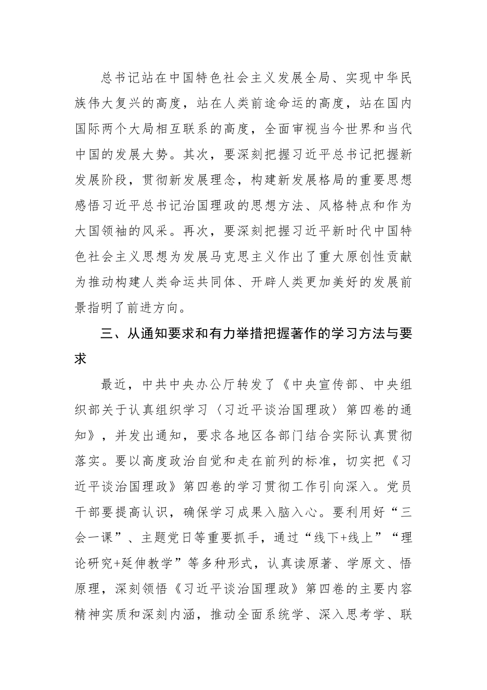 《习近平谈治国理政》第四卷交流研讨:深刻把握第四卷的内涵要求在全党全社会喜迎党的二十大之际,《习近平谈治国理政》第四卷正式出版发行,这是我们党和国家政治生活中的一件大事。这部重要著作体系严整、内涵丰富、思想深邃,与第一卷、第二卷、第三卷一脉相承又与时俱进,通篇闪耀着马克思主义真理光芒、彰显着强大实践伟力、饱含着厚重人民情怀。学好用好《习近平谈治国理政》第四卷,是党中央的明确要求,是广大党员干部的重大政治任务。在学习实践中,重要的是从三个维度把握好这部权威著作的内涵要求。一、从政治高度把握著作的重大意义二、从框架结构把握著作的主要内容从宏观上讲,《习近平谈治国理政》第四卷收入了习近平总书记在2020年2月3日至2022年5月10日期间的具有代表性和独创性的重要著作,为了便于读者阅读,还作了必要注释并收入习近平总书记2020年1月以来的图片45幅。也就是说,21个专题109篇文章,注释和45幅图片构成了《习近平谈治国理政》第四卷的框架内容。从书目的布局看,第四卷所收入的109篇文章,其中2021年7月1日的《在庆祝中国共产党成立一百周年大会上的讲话》一文为开篇之作,2022年1月30日的《团结就是力量,奋斗开创未来》为收官之作。可以从三个深刻把握来认识《习近平谈治国理政》第四卷的丰富内涵。首先,要深刻把握习近平总书记站在中国特色社会主义发展全局、实现中华民族伟大复兴的高度,站在人类前途命运的高度,站在国内国际两个大局相互联系的高度,全面审视当今世界和当代中国的发展大势。其次,要深刻把握习近平总书记把握新发展阶段,贯彻新发展理念,构建新发展格局的重要思想感悟习近平总书记治国理政的思想方法、风格特点和作为大国领袖的风采。再次,要深刻把握习近平新时代中国特色社会主义思想为发展马克思主义作出了重大原创性贡献为推动构建人类命运共同体、开辟人类更加美好的发展前景指明了前进方向。三、从通知要求和有力举措把握著作的学习方法与要求最近,中共中央办公厅转发了《中央宣传部、中央组织部关于认真组织学习〈习近平谈治国理政〉第四卷的通知》,并发出通知,要求各地区各部门结合实际认真贯彻落实。要以高度政治自觉和走在前列的标准,切实把《习近平谈治国理政》第四卷的学习贯彻工作引向深入。党员干部要提高认识,确保学习成果入脑入心。要利用好“三会一课”、主题党日等重要抓手,通过“线下+线上”“理论研究+延伸教学”等多种形式,认真读原著、学原文、悟原理,深刻领悟《习近平谈治国理政》第四卷的主要内容精神实质和深刻内涵,推动全面系统学、深入思考学、联系实际学、笃信笃行学,增强学习实效,营造自觉学习和主动落实的浓厚氛围,无旁骛把我们自己的事情做好,坚定不移推进中华民族伟大复兴历史进程,在新时代新征程上赢得更加伟大的胜利和荣光。