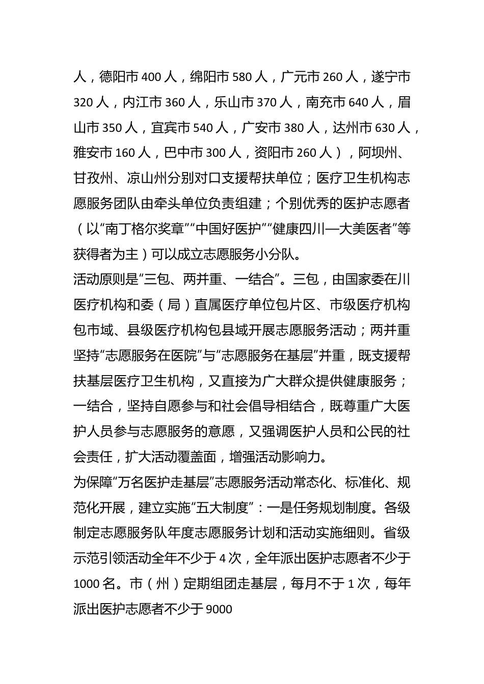 “万名医护走基层”志愿服务活动方案省卫生健康委组织“万名医护走基层”志愿服务活动主要目的是贯彻落实中共中央办公厅、国务院办公厅《关于进一步深化改革促进乡村医疗卫生体系健康发展的意见》《关于进一步完善医疗卫生服务体系的意见》精神,推动优质医疗资源扩容下沉和均衡布局,推动城乡基本公共服务均等化,全面助力乡村振兴发展,全面夯实四川现代化建设健康基础。总体部署是坚持人民至上、生命至上,以群众健康需求为导向,以革命老区、民族地区、偏远山区为重点,每年动员全省县级以上医疗卫生机构10000名医护人员,深入到县、乡、村开展志愿服务,引导支持广大医务人员志愿深入基层、服务百姓。队伍架构是总队-支队-团队-小分队“四级”队伍,确保志愿服务覆盖到全省所有县、乡、村三级,队员以医师为主体,原则上以副高级及以上职称或博士学历以上人员为主,兼顾“医、护、技、管、后”人员,覆盖内外妇儿等学科。其中,省志愿服务总队由省卫生健康委负责组建,由4家国家委在川医疗机构和18家省级直属医疗机构抽组1000名队员组成;市(州)志愿服务支队由各市(州)卫生健康委负责组建除3州外,18个市共组建18支志愿服务支队(成都市2500人,自贡市300人,攀枝花市150人,泸州市500人,德阳市400人,绵阳市580人,广元市260人,遂宁市320人,内江市360人,乐山市370人,南充市640人,眉山市350人,宜宾市540人,广安市380人,达州市630人,雅安市160人,巴中市300人,资阳市260人),阿坝州、甘孜州、凉山州分别对口支援帮扶单位;医疗卫生机构志愿服务团队由牵头单位负责组建;个别优秀的医护志愿者(以“南丁格尔奖章”“中国好医护”“健康四川—大美医者”等获得者为主)可以成立志愿服务小分队。活动原则是“三包、两并重、一结合”。三包,由国家委在川医疗机构和委(局)直属医疗单位包片区、市级医疗机构包市域、县级医疗机构包县域开展志愿服务活动;两并重坚持“志愿服务在医院”与“志愿服务在基层”并重,既支援帮扶基层医疗卫生机构,又直接为广大群众提供健康服务;一结合,坚持自愿参与和社会倡导相结合,既尊重广大医护人员参与志愿服务的意愿,又强调医护人员和公民的社会责任,扩大活动覆盖面,增强活动影响力。为保障“万名医护走基层”志愿服务活动常态化、标准化、规范化开展,建立实施“五大制度”:一是任务规划制度。各级制定志愿服务队年度志愿服务计划和活动实施细则。省级示范引领活动全年不少于4次,全年派出医护志愿者不少于1000名。市(州)定期组团走基层,每月不于1次,每年派出医护志愿者不少于9000名;同时鼓励对口支援三州的三级以上医疗机构、冠名红十字医疗机构及红十字南丁格尔志愿服务队主动对接受援地开展志愿服务走基层活动。二是监督考核制度。省卫生健康委将各级医疗卫生机构志愿服务基层情况纳入工作考评,组织、推动并跟进抽查医护志愿服务走基层开展情况县级卫生健康行政部门、志愿服务团队和受援单位对本年度工作完成情况进行总结和自评。市(州)级以上卫生健康行政部门定期收集上报各单位在基层医疗卫生机构开展志愿服务情况,对项目实施的社会成效进行评估,形成每季度、年度工作总结和报告报送至省卫生健康委,省卫生健康委对各地工作情况进行抽查。三是引导激励制度。推广运用“志愿四川”等志愿服务信息平台,加强志愿服务团队动态管理,记录医护志愿者服务时长。志愿服务团队建立本单位志愿服务管理制度和志愿服务考核细则,注重考核结果运用,将考评情况作为个人、集体评先创优和医德医风考核、推优入党的参考依据。执业医师晋升为副高级技术职称的,参加志愿服务基层时间作为其基层工作经历累计计算。志愿服务表现突出的个人,优先推荐“南丁格尔奖章候选人”“中国好医生中国好护士”“健康四川——大美医者”“优秀红十字志愿者”“红十字‘会员之星’”等。四是专项保障制度。志愿服务团队所在单位保证医护志愿者各项福利待遇不变并购买意外伤害保险,志愿服务开展地为医护志愿者提供必要的保障,协助做好相应安排。医护志愿者走基层所需费用原则上参照相关报销标准由派出单位承担,活动结束后凭发票据实报...