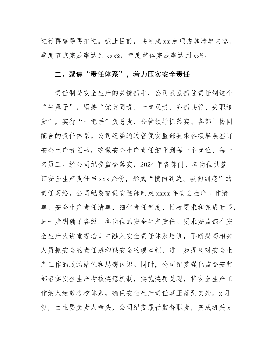 公司纪委在安全生产监督工作会议上的发言为深入学习贯彻总书记关于安全生产的重要指示批示精神,落实x集团“一六六”战略路径工作要求,x分公司纪委充分发挥监督职能,锚定年度安全生产目标,以“时时放心不下”的危机感、“处处小心谨慎”的责任感狠抓安全生产专项行动,科学谋划,统筹组织,全力提升安全生产管理水平,护航公司高质量发展。一、聚焦“统筹部署”,着力推进过程监督x分公司纪委立足监督职责,第一时间组织召开动员部署会,制定印发《x分公司xxxx年度“六个专项行动”监督工作方案》,牢牢把握“六专行动”总体要求和目标任务,细化任务推进清单,结合公司实际研究制定务实可行、衔接联动的方案举措,细化到“项”、具体到“事”、责任到“人”,明确时间表,推动安全生产专项行动顺利起步。x分公司纪委坚持“六专行动”的鲜明导向,紧抓重点要求和关键节点,通过“日排查、周盘点、月汇报、季分析”管控机制,扎实推进各项举措任务高效落实。在工作督导上着力攻克完成效果难保证、工作任务难推进等问题,针对未完成的任务制定专项攻坚方案进行再督导再推进。截止目前,共完成xx余项措施清单内容,季度节点完成率达到xxx%,年度整体完成率达到xx%。二、聚焦“责任体系”,着力压实安全责任责任制是安全生产的关键抓手,公司紧紧抓住责任制这个“牛鼻子”,坚持“党政同责、一岗双责、齐抓共管、失职追责”,实行“一把手”负总责、分管领导抓落实、各部门协同配合的责任体系。公司纪委通过督促安监部要求各级层层签订安全生产责任书,确保安全生产责任细化到每一个岗位、每一名员工。经公司纪委监督落实,2024年各部门、各岗位共签订安全生产责任书xxx余份,形成“横向到边、纵向到底”的责任网络。公司纪委督促安监部制定xxxx年安全生产工作清单、安全生产责任清单,细化责任制度、目标要求和完成时限,进一步明确了各级、各岗位的安全生产责任。要求安监部在安全生产大讲堂等培训中融入安全责任体系培训,不断提高相关人员抓安全的责任感和谋安全的硬本领,进一步提高对安全生产工作的政治站位和思想认识。同时,公司纪委强化监督安监部落实安全生产考核奖惩机制,实施奖罚兑现,将安全生产工作纳入绩效考核体系,确保安全生产责任真正落到实处。x月份,由主要负责人牵头,公司纪委履行监督职责,完成机关x个部门和xx个在施项目上半年度安全生产责任制考核,考核覆盖人员达到xxx余人。二、聚焦“隐患整治”,着力巩固安全防线推动制度完善,尽最大可能防范各类重大安全事故的发生。公司纪委针对公司在施项目点多面广、规模差异大、重大较大安全风险分布散等问题,推动职能部门建立起专项查、月度查、季度查、带班领导查“四查”链条化检查机制,切实将风险隐患控制、消除在萌芽状态。加强监督检查,推动安全生产责任落实到位。公司纪委监督安监部每月对所有在施项目进行全覆盖安全检查考核,对安全风险进行逐项排查,并印发安全检查通报;结合在施工程特点、季节性施工特点,督促安监部组织开展大型机械设备、危大工程、燃气安全、消防、高温防汛等安全专项排查整治,无缝衔接、全面覆盖;要求制定印发《企业负责人及项目主要负责人施工现场带班生产管理实施细则》,按照规定开展领导带班检查,尤其在项目新开工、复工复产期间,项目危险性较大分项工程施工、典型工序施工期间,以及节假日和国家重大会议期间,采取“四不两直”方式进行带班检查。通过强化监督安全检查的链条式推进、闭合化运行,推动安全生产关口前移,切实提高风险隐患排查整治实效,有效预防了各类安全生产事故发生。四、聚焦“培训赋能”,着力筑牢生产根基公司纪委切实发挥监督探头作用。为全面提升公司安全生产管理水平,提高安全技术人员业务素质,公司纪委要求安监部定期组织安全生产管理业务素能提升培训班,开展危大工程安全管控、应急管理、智慧工地安全管理系统运用等专题培训。公司纪委通过走访调研、座谈等方式,了解了各级安全管理人员的培训需求,根据在施项目重难点、季节性施工特点,督促安监部组织开展“安全大讲堂”活动,分期分批组织开展安全专题教育培训,围绕施工现场危...