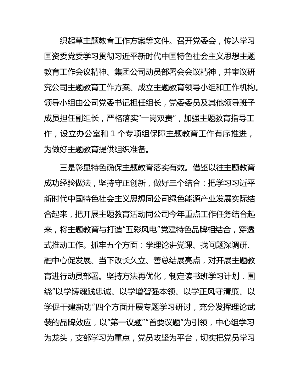 指导组:根据会议安排,现将公司学习贯彻习近平新时代中国特色社会主义思想主题教育筹备开展情况汇报如下:一、动员部署情况党中央决定,从4月开始,分两批在全党深入开展学习贯彻习近平新时代中国特色社会主义思想主题教育,是党的二十大作出的重大部署。公司党委坚决贯彻落实党中央决策部署要求,在上级党委的统筹部署下,全面对标对表,切实把开展好主题教育作为当前一项重要政治任务抓紧抓好,扎实推进各项筹备工作。一是强化理论学习筑牢主题教育的思想基础。公司党委支以“第一议题”形式学习习近平总书记在中央学习贯彻习近平新时代中国特色社会主义思想主题教育工作会议上的重要讲话精神,深刻认识理解和把握“学思想、强党性、重实践、建新功”总要求,深刻认识到此次主题教育的内涵,为抓紧抓实主题教育前期各项筹备工作做好准备,把思想和行动统一到习近平总书记重要指示精神和党中央决策部署上来,为开展主题教育提供根本遵循。二是坚持认识再提高统筹部署快行动。按要求参加集团公司动员部署会,会后迅速响应,当天即研究部署相关工作,组织起草主题教育工作方案等文件。召开党委会,传达学习国资委党委学习贯彻习近平新时代中国特色社会主义思想主题教育工作会议精神、集团公司动员部署会会议精神,并审议研究公司主题教育工作方案、成立主题教育领导小组和工作机构。领导小组由公司党委书记担任组长,党委委员及其他领导班子成员担任副组长,严格落实“一岗双责”,加强主题教育指导工作,设立办公室和1个专项组保障主题教育工作有序推进,为做好主题教育提供组织准备。三是彰显特色确保主题教育落实有效。借鉴以往主题教育成功经验做法,坚持守正创新,做好三个结合:把学习习近平新时代中国特色社会主义思想同公司绿色能源产业发展实际结合起来,把开展主题教育活动同公司今年重点工作任务结合起来,将主题教育与打造“五彩风电”党建特色品牌相结合,穿透式推动工作。抓牢五个方面:学理论讲党课、找问题深调研、融中心促发展、当下改长久立、善总结展亮点,对开展主题教育进行动员部署。坚持方法再优化,制定读书班学习计划,围绕“以学铸魂践忠诚、以学增智强本领、以学正风守清廉、以学促干建新功”四个方面开展专题学习研讨,充分发挥理论武装的品牌效应,以“第一议题”“首要议题”为引领,中心组学习为龙头,支部学习为重点,党员攻坚为平台,切实把党员学习工作热情转化为攻坚克难、干事创业的强大动力,形成党建亮点工作成果,发挥党建引领保障作用,切实将党建工作优势转化为企业发展优势、竞争优势。二、下一步工作计划下一步,x分公司将在集团党委及指导组的指导下,按照主题教育“学思想、强党性、重实践、建新功”总要求,围绕集团公司“强党建、谋创新、提效益、促发展”工作主线,聚焦公司“发展上规模、管理上台阶、队伍上水平”全年工作任务,在理论学习上下功夫,在调查研究上真作为,在推动发展上见成效,在检视整改上动真格。一是坚持学思用贯通、知信行统一。把新时代中国特色社会主义思想转化为坚定理想、锤炼党性和指导实践、推动工作的强大力量,把讲求实效贯穿主题教育全过程,确保规定动作不走样,自选动作有特色,推动主题教育与中心工作双向促进。二是坚持调查研究、助力绿色发展。充分发挥大调研机制作用,紧紧围绕年度中心工作,精选课题,开展“大调研”活动,召开调研情况交流会,把调研成果转化为破解难题、促进发展的实际行动。聚焦破解制约高质量发展堵点难题,开展“思想交流日”活动,充分发挥为群众办实事长效机制作用,坚持职工立场、坚持实践运用。三是强化问题查摆、及时总结提升。紧紧围绕高质量这个首要任务,矫正发展中存在的问题,进行集中整治销项。用好各类传播手段,创新宣传形式和载体,结合海上风电特色,及时发掘提炼主题教育中的好做法好经验,选树宣传先进典型,做好精品宣传作品传播,营造良好舆论氛围。我们将在指导组的精心指导下,坚持以习近平新时代中国特色社会主义思想为指导,深入学习贯彻习近平生态文明思想,进一步提高政治站位,自觉对标对表中央决策部署、集团党委工作要求,把主题教育与绿...