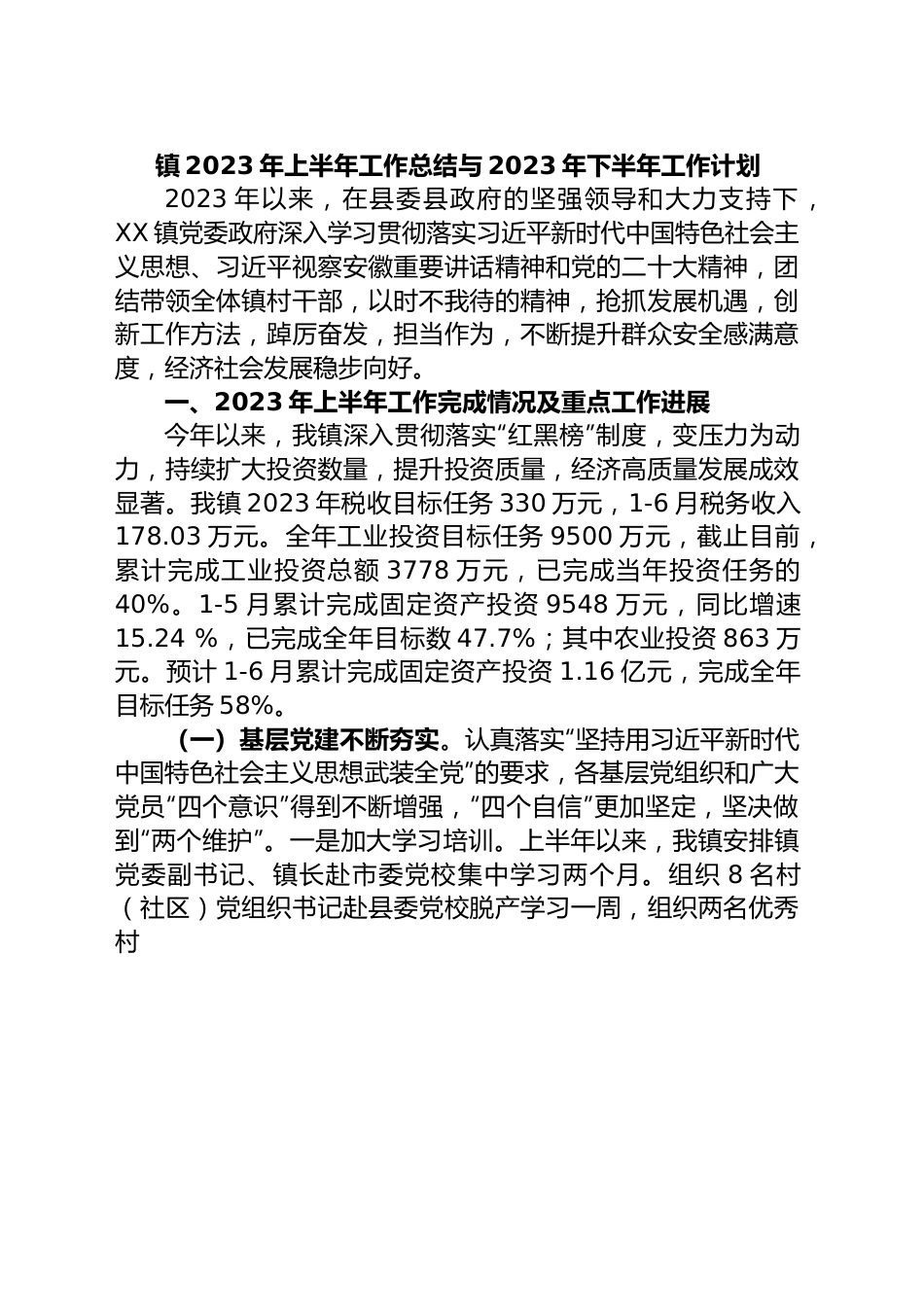 镇2023年上半年工作总结与2023年下半年工作计划2023年以来,在县委县政府的坚强领导和大力支持下,XX镇党委政府深入学习贯彻落实习近平新时代中国特色社会主义思想、习近平视察安徽重要讲话精神和党的二十大精神,团结带领全体镇村干部,以时不我待的精神,抢抓发展机遇,创新工作方法,踔厉奋发,担当作为,不断提升群众安全感满意度,经济社会发展稳步向好。一、2023年上半年工作完成情况及重点工作进展今年以来,我镇深入贯彻落实“红黑榜”制度,变压力为动力,持续扩大投资数量,提升投资质量,经济高质量发展成效显著。我镇2023年税收目标任务330万元,1-6月税务收入178.03万元。全年工业投资目标任务9500万元,截止目前,累计完成工业投资总额3778万元,已完成当年投资任务的40%。1-5月累计完成固定资产投资9548万元,同比增速15.24%,已完成全年目标数47.7%;其中农业投资863万元。预计1-6月累计完成固定资产投资1.16亿元,完成全年目标任务58%。(一)基层党建不断夯实。认真落实“坚持用习近平新时代中国特色社会主义思想武装全党”的要求,各基层党组织和广大党员“四个意识”得到不断增强,“四个自信”更加坚定,坚决做到“两个维护”。一是加大学习培训。上半年以来,我镇安排镇党委副书记、镇长赴市委党校集中学习两个月。组织8名村(社区)党组织书记赴县委党校脱产学习一周,组织两名优秀村党组织书记赴山东实地考察学习,进一步提升村党组织书记党的理论知识水平和带动村级发展的能力。二是抓党建促发展。年初制定10件镇级民生拟办实事,重点围绕打造升级版市级现代农业产业示范园、集镇形象提升、创新乡贤工作品牌等内容。敲定实施书记项目(领办事项)32个,目前书记项目完成进度70%。认真落实“推动整顿软弱涣散基层党组织常态化、长效化”的要求,今年持续对一个村开展软弱涣散基层党组织整顿,落实各项整顿措施,保证工作实效,确保软弱涣散基层党组织顺利转化。扎实推进抓党建促乡村振兴,今年以来,界岭村采取“党建+合作社+农户”的模式,利用村级闲置土地,打造特色西瓜大棚产业,促进村级集体经济发展,带动群众增收致富的做法得到及时总结,《大棚里种出“甜日子”》由安庆日报刊登。(二)双招双引发展良好。实行“镇党委书记牵头对接、班子成员分块参与、镇招商办包保联系”招商工作机制,定期赴长三角等先发地区开展招商推介。今年以来,充分利用闲置资产,成功引进1家深圳电子企业生产电子设备。结合地域特色,引进1家建材企业投资生产。探索“产地直采+线上直播带货+统一包装配送”电商模式,主动对接县园区电商企业平台,开展直播带货活动29次,线上销售茶油、羊肚菌等特色农产品超2000公斤、100万元。计划总投资1.2亿元的界岭村印象松滋旅游点持续开发建设,已完成总资金投入的60%。刘坡村网红打卡点打造投入200余万元,实施质量提升工程,结合本地佛教文化,项目综合效益得到发挥。(三)乡村振兴持续推进。一是教育资助。经本人申请、村审核、镇审批,开展雨露计划第二批人员公示,上半年一共153名及时得到了资助资金22.95万元。二是防返贫监测。结合安徽省防返贫监测系统监测预警,完成230名重点人员逐个核实。最终新增监测对象7户22人,消除隐患监测14户47人。三是进一步巩固大排查成果。镇村干部“一对一”结对入户,全覆盖、无遗漏入户开展大排查活动,共排查1733户已脱贫户、38户监测对象户。对各类户做到因户施策,因人帮扶,不断巩固排查成果。三是项目建设。积极完善建设镇级2023年项目库,共完成28个项目进库。上半年已实施乡村振兴项目22个,正有序实施。四是特色产业发展。积极拓宽发展思路,创新发展模式,推进资源有效整合、资金有效利用、产业有效升级,实现村级集体经济提质增效。XX镇界岭村油茶基地获评全省100个特色主导产业“一村一品”示范基地。深入摸排村级闲置资源资产,探索建立闲置资产村级托管模式,对闲置学校、老旧厂房、屋舍等进行改造提升,通过“改造+租赁”方式,实施整村发包,实现“物尽其用”。截至目前,投入资金300万元改造闲置资产3处、出租2处,实现村集体年均增收10万元以上。采取“政府+公司+合作...