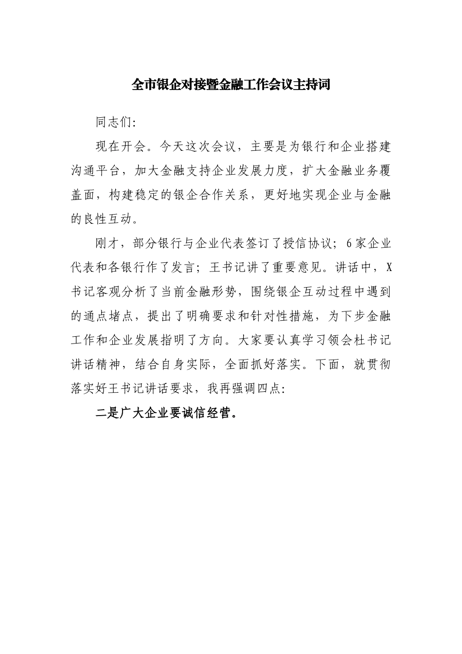 全市银企对接暨金融工作会议主持词同志们:现在开会。今天这次会议,主要是为银行和企业搭建沟通平台,加大金融支持企业发展力度,扩大金融业务覆盖面,构建稳定的银企合作关系,更好地实现企业与金融的良性互动。刚才,部分银行与企业代表签订了授信协议;6家企业代表和各银行作了发言;王书记讲了重要意见。讲话中,X书记客观分析了当前金融形势,围绕银企互动过程中遇到的通点堵点,提出了明确要求和针对性措施,为下步金融工作和企业发展指明了方向。大家要认真学习领会杜书记讲话精神,结合自身实际,全面抓好落实。下面,就贯彻落实好王书记讲话要求,我再强调四点:二是广大企业要诚信经营。今天会上签订的授信协议,有关企业要把握机遇,抓紧对接,尽快完善手续。各企业要加强与金融机构的沟通落实专人学习信贷业务知识,自觉适应金融机构的各项硬性规定,降低和避免金融风险。要牢固树立诚信经营意识视信誉为生命,按时还本付息,主动参与信用资质认定,争取金融机构更多支持。要凝心聚力发展主业,积极根据实际和市场需求,调整产品结构,努力创新开发有市场竞争力的产品,增强赢利能力。要加强企业管理,严格财务管理和会计核算,遵守与银行签订的协议承诺,定期反馈生产经营情况,增强银行信贷投入信心。这里再强调一点市里为企业提供的过桥资金,只能用于还贷、续贷,不得用于固定资产投资和其他用途。三是县直各部门单位要优化服务。市直各部门单位要坚持把金融工作放在更加突出和重要的位置,充分关心支持金融工作,协调解决好金融事业发展存在的问题。财政工信等部门单位,要定期筛选优质项目,及时推荐给金融机构,方便金融机构了解项目信息,及时做好信贷投放准备。地方金融监管局要定期开展银企对接活动,把有信誉有发展潜力的企业请到银行,介绍企业发展情况和资金需求;要把金融机构带到企业去,让他们了解企业,熟悉企业,切实帮助企业解决资金困难。经发集团要切实发挥好国企平台作用,进一步完善财政过桥资金使用办法,适度扩大使用范围,帮助更多的企业渡过难关;要坚持促发展和防风险并重,严格做好事前、事中、事后审查和监管工作,加强风险研判,最大限度降低风险、促进国有资产保值增值。其他市直部门单位也要发挥好自身职能,对与信贷要求还有差距的企业,在信息、技术、管理上给企业提供帮助,指导企业在项目上多下工夫,用优质的项目去争取信贷。四是严密防范金融风险。目前我县不良贷款率0.91%,全市为1.01%。市人民银行、银监办要加大监管力度,督促各金融机构加强贷款管理,严密监测贷款资金流向,防止贷款被违规挪用,确保贷款资金直接流向实体经济。要建立部门联动机制,积极开展打击逃废债专项行动,严厉打击逃废金融债务行为支持金融部门按期收贷收息,处置不良资产。对过桥、担保资金逾期的企业,金融、财政部门要与公安、法院、检察院等部门加强沟通合作,进行联合处置,督促企业尽快整改到位。对整改不到位的企业,除取消过桥担保政策扶持外,其他政策优惠也要一并取消。今天的会议就到这里,散会!
