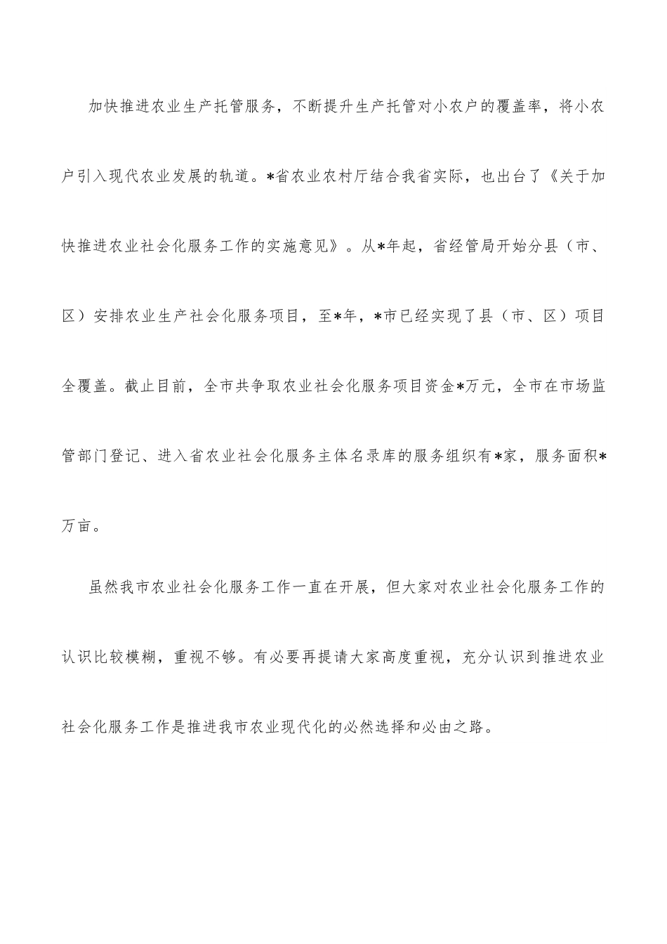 在全市农业社会化服务工作现场推进会上的讲话同志们,今天我们召开全市农业社会化服务工作现场推进会,主要目的在于进一步统一思想认识,找准存在问题,强化工作举措,加快推进全市农业社会化服务高质量发展。今年以来,全市经管部门克难奋进,主动作为,各项重点工作扎实有效推进,主要表现在:村级债务化解成效明显,清廉村居建设稳步推进,农村集体产权制度改革取得阶段性成果,新型农业经营主体培育卓有成效,家庭农场年度新增目标提前完成。今天上午,大家参观了*中药材种植专业合作社药材仓储、加工车间,**农机服务专业合作社水稻收割、秸秆离田社会化服务生产现场,*农业种植加工专业合作社水稻烘干、大米加工现场及规范化建设情况;观摩了*市水之源农产品产销专业合作社、*市圣和茶叶专业合作社承担农业生产社会化服务项目的相关资料。刚才,各县市区经管局长(农经中心主任)、**农机服务专业合作社等社会化服务组织作了交流发言,希望大家相互借鉴、取长补短、共同进步。市经管局长*同志对当前经管重点工作进行了安排部署,希望各地认真学习领会,抓好落实。下面,我讲三点意见,供大家参考。一、高度重视,充分认识农业社会化服务工作重要作用党的十九大指出,要健全农业社会化服务体系,实现小农户和现代农业发展有机衔接。*年*月,中办国办印发的《关于促进小农户和现代农业发展有机衔接的意见》强调,要健全面向小农户的社会化服务体系,发展农业生产性服务业,加快推进农业生产托管服务,不断提升生产托管对小农户的覆盖率,将小农户引入现代农业发展的轨道。*省农业农村厅结合我省实际,也出台了《关于加快推进农业社会化服务工作的实施意见》。从*年起,省经管局开始分县(市、区)安排农业生产社会化服务项目,至*年,*市已经实现了县(市、区)项目全覆盖。截止目前,全市共争取农业社会化服务项目资金*万元,全市在市场监管部门登记、进入省农业社会化服务主体名录库的服务组织有*家,服务面积*万亩。虽然我市农业社会化服务工作一直在开展,但大家对农业社会化服务工作的认识比较模糊,重视不够。有必要再提请大家高度重视,充分认识到推进农业社会化服务工作是推进我市农业现代化的必然选择和必由之路。首先,从政策上讲,大力发展农业社会化服务是进一步完善农村基本经营制度的需要。农村土地承包政策是党在农村的一项基本制度,是事关农村农民稳定的基本国策,必将保持长期稳定,这就决定了小农生产方式仍将是长期存在的基本现实。尤其是我市“八山一水一分田”,人均耕地只有*亩,远低于全国、全省平均水平,生产要素更加分散。而小农户作为农业生产的重要主体,没有小农户的生产现代化,就没有农业现代化。因此,必须通过发展农业社会化服务,开展土地股份合作、土地托管、代耕代种、联耕联种、病虫害统防统治、秧苗统育统供等服务,为普通农户提供专业化市场化服务,帮助解决生产过程中面临的共性问题,把一家一户小生产融入到农业现代化大生产之中,促进小农户和现代农业有机衔接,才能提高山区农业生产专业化、标准化、集约化水平,进而实现山区农业现代化。其次,从困扰山区农业现代化的几个关键问题来看,在促进农业标准化生产、规模化经营方面,在帮助农户节本增效方面,在解决农村劳动力不足方面,都需要通过发展农业社会化服务来推动解决。比如,在促进农业标准化生产、规模化经营方面,开展农业生产托管服务,通过服务组织集中采购、集成技术、标准作业、统一服务、订单收购等,能充分发挥农业机械装备的作业能力和分工分业专业化服务的优势,有效降低农业物化成本和生产作业成本。*市通过对柑桔、茶叶两大支柱产业实施社会化服务,解决了桔农、茶农销售难问题,提高了销售价格,增加了农民收入,带动了全市柑桔、茶叶产业的进一步发展。比如,在帮助农户节本增效方面,开展农业社会化服务,一部分小农户的生产难题得到解决,土地托管后,可以安心外出打工,挣得两份收益。*市泽发农业专业合作社通过加大投入,规模应用植保无人机等先进装备,初步形成了以“飞防、机防托管”为特色的新型农业社会化服务模式,累计开展粮经作物统防统治托管作...