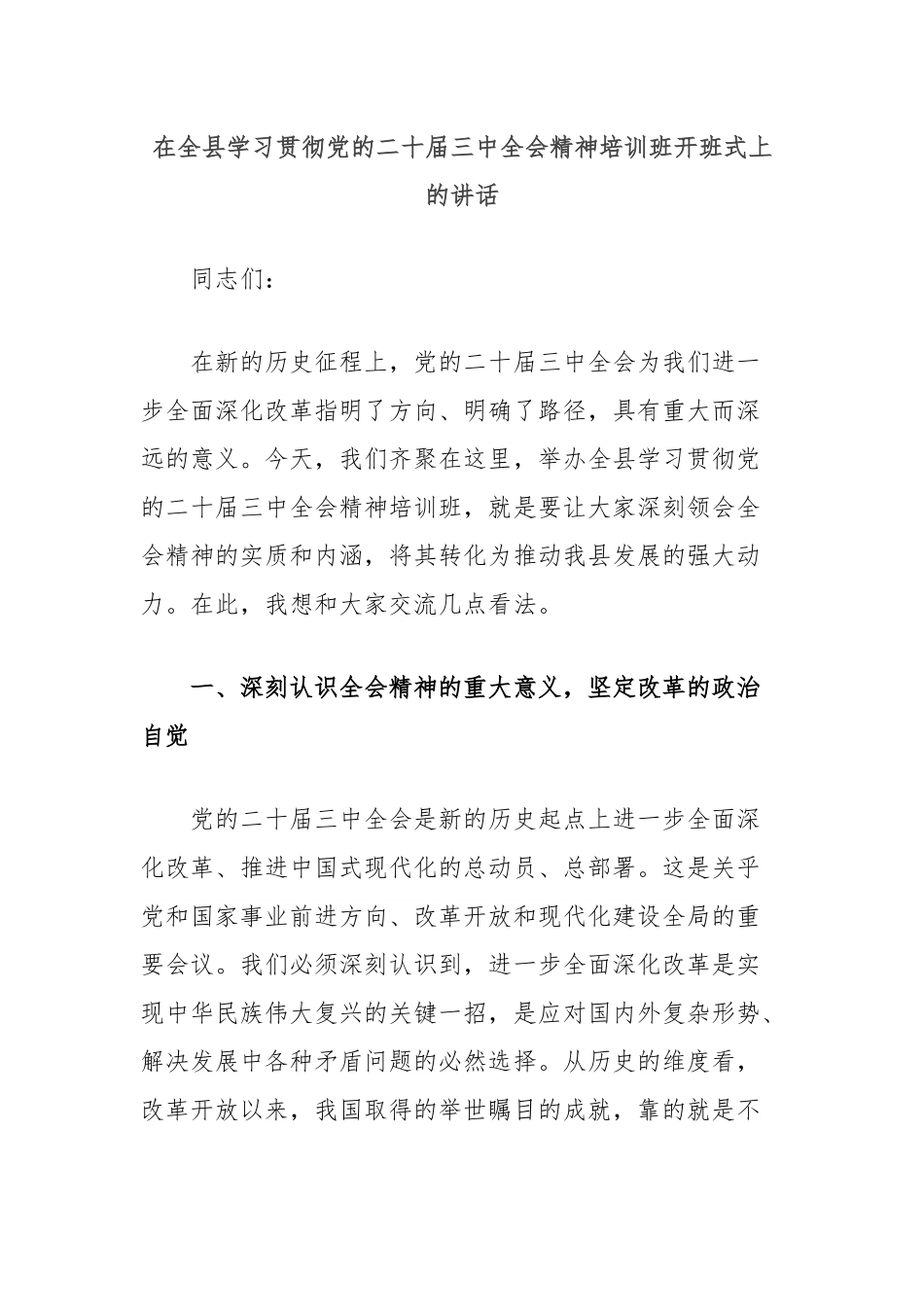 在全县学习贯彻党的二十届三中全会精神培训班开班式上的讲话同志们:在新的历史征程上,党的二十届三中全会为我们进一步全面深化改革指明了方向、明确了路径,具有重大而深远的意义。今天,我们齐聚在这里,举办全县学习贯彻党的二十届三中全会精神培训班,就是要让大家深刻领会全会精神的实质和内涵,将其转化为推动我县发展的强大动力。在此,我想和大家交流几点看法。一、深刻认识全会精神的重大意义,坚定改革的政治自觉党的二十届三中全会是新的历史起点上进一步全面深化改革、推进中国式现代化的总动员、总部署。这是关乎党和国家事业前进方向、改革开放和现代化建设全局的重要会议。我们必须深刻认识到,进一步全面深化改革是实现中华民族伟大复兴的关键一招,是应对国内外复杂形势、解决发展中各种矛盾问题的必然选择。从历史的维度看,改革开放以来,我国取得的举世瞩目的成就,靠的就是不断推进改革。如今,我们站在新的历史起点上,面临着新的机遇和挑战,只有坚定不移地推进全面深化改革,才能不断开辟新的发展境界。从现实的需求看,我县在经济发展、社会治理、民生保障等方面还存在着一些短板和不足,这些问题的解决,迫切需要我们以改革的精神、创新的思维去突破、去解决。我们要深刻领会和把握习近平总书记关于全面深化改革的新思想、新观点、新论断,不断增强“四个意识”、坚定“四个自信”、做到“两个维护”,以高度的政治自觉、思想自觉和行动自觉,坚定地投身到全面深化改革的伟大实践中。二、准确把握全会精神的核心要点,明确改革的目标任务党的二十届三中全会明确了进一步全面深化改革的重大原则、目标任务,为我们提供了根本遵循和行动指南。我们要准确把握这些核心要点,结合我县实际,明确改革的具体目标和任务。一是要在经济领域深化改革,推动经济高质量发展。大抓产业,大抓项目,是我们推动经济发展的重要举措。我们要立足我县的资源优势和产业基础,积极培育新的经济增长点,构建现代化产业体系。要持续优化营商环境,为企业发展提供更好的服务和保障,激发市场主体的活力和创造力。要加强科技创新,推动产业升级,提高经济发展的质量和效益。二是要在民生领域深化改革,增强人民群众的获得感、幸福感、安全感。民生是改革的出发点和落脚点。我们要以“小切口”改革服务“大民生”,持续发展乡村富民产业,让广大农民群众共享改革发展的成果。要加强教育、医疗、养老等公共服务体系建设,提高公共服务的供给质量和水平。要加强就业创业扶持,拓宽就业渠道,提高就业质量。三是要在文化领域深化改革,推动文化繁荣发展。文化是一个国家、一个民族的灵魂。我们要全面推动文化赋能,促进农文旅融合发展,挖掘和弘扬我县的优秀传统文化,打造具有地方特色的文化品牌。要加强文化基础设施建设,丰富群众的文化生活,提高群众的文化素养。四是要在生态领域深化改革,守护好绿水青山。生态环境是人类生存和发展的基础。我们要坚持生态优先、绿色发展理念,压实责任,加强生态环境保护和治理。要推动绿色低碳发展,加快形成绿色生产方式和生活方式,实现经济发展与生态保护的良性互动。五是要在社会治理领域深化改革,建设更高水平的平安县城。维护国家安全、社会安定、人民安宁是我们的重大责任。我们要加强社会治理体系和治理能力现代化建设,完善矛盾纠纷多元化解机制,加强社会治安防控体系建设,打击各类违法犯罪活动,确保社会大局稳定。三、切实抓好全会精神的贯彻落实,确保改革取得实效学习贯彻党的二十届三中全会精神,关键要看行动、靠实干。我们要以钉钉子的精神,抓好全会精神的贯彻落实,确保改革取得扎实成效。一是要加强组织领导。各级领导干部要发挥带头作用,亲自抓、亲自管,确保改革任务落到实处。要建立健全改革工作的领导体制和工作机制,加强部门之间的协调配合,形成改革的强大合力。二是要强化责任担当。改革是一项艰巨的任务,需要我们有强烈的责任担当和奉献精神。我们要敢于担当、善于担当,勇于突破传统思维和体制机制的束缚,积极探索创新改革的方法和路径。要建立健全改革的考核评价机制,对改革任务进行跟踪问效,确保改...