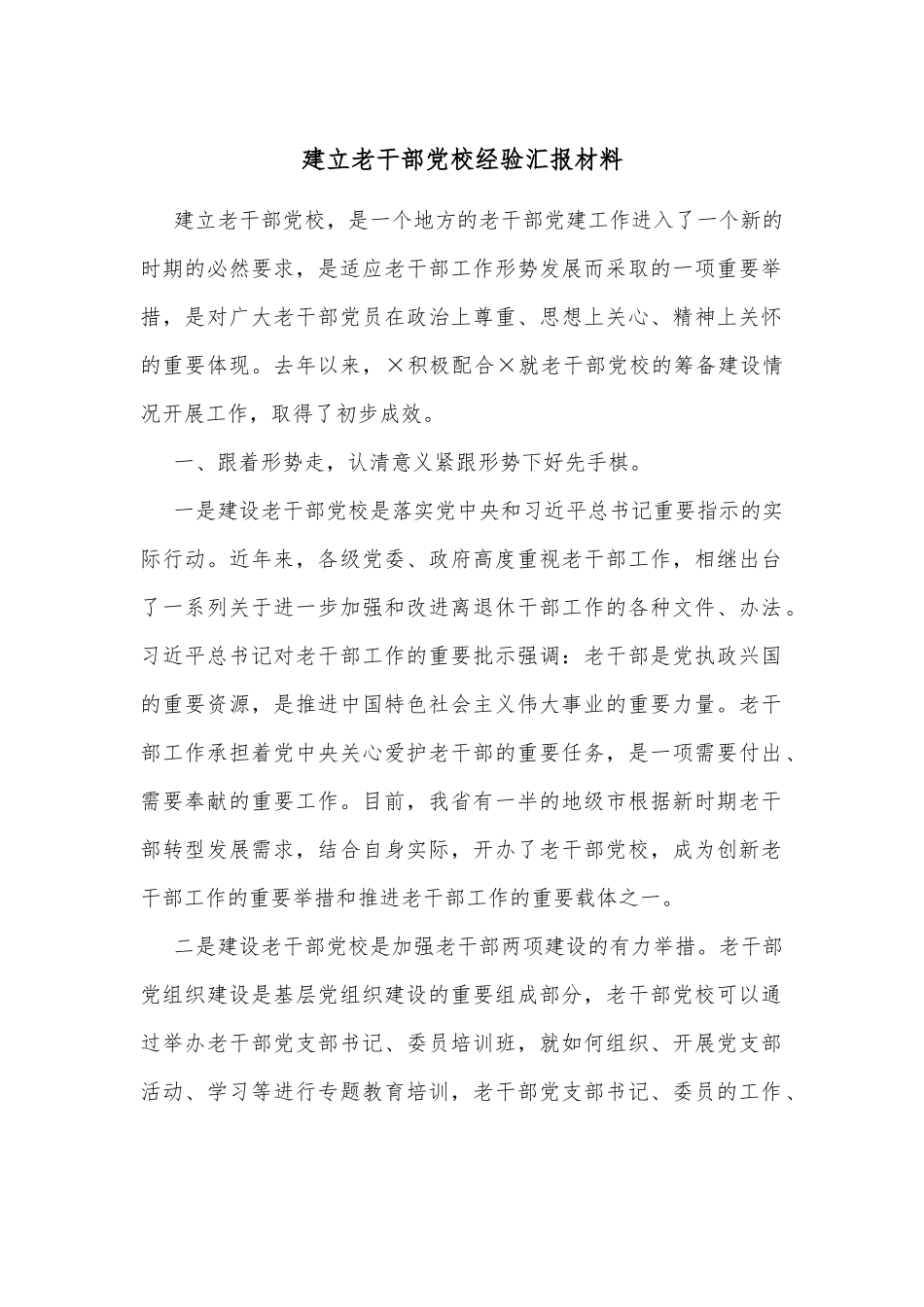 建立老干部党校经验汇报材料建立老干部党校,是一个地方的老干部党建工作进入了一个新的时期的必然要求,是适应老干部工作形势发展而采取的一项重要举措,是对广大老干部党员在政治上尊重、思想上关心、精神上关怀的重要体现。去年以来,×积极配合×就老干部党校的筹备建设情况开展工作,取得了初步成效。一、跟着形势走,认清意义紧跟形势下好先手棋。一是建设老干部党校是落实党中央和习近平总书记重要指示的实际行动。近年来,各级党委、政府高度重视老干部工作,相继出台了一系列关于进一步加强和改进离退休干部工作的各种文件、办法。习近平总书记对老干部工作的重要批示强调:老干部是党执政兴国的重要资源,是推进中国特色社会主义伟大事业的重要力量。老干部工作承担着党中央关心爱护老干部的重要任务,是一项需要付出、需要奉献的重要工作。目前,我省有一半的地级市根据新时期老干部转型发展需求,结合自身实际,开办了老干部党校,成为创新老干部工作的重要举措和推进老干部工作的重要载体之一。二是建设老干部党校是加强老干部两项建设的有力举措。老干部党组织建设是基层党组织建设的重要组成部分,老干部党校可以通过举办老干部党支部书记、委员培训班,就如何组织、开展党支部活动、学习等进行专题教育培训,老干部党支部书记、委员的工作、理论水平有提高,使老干部党支部的建设水平、管理水平和全体老干部党员队伍素质得到提升,从而更好的加强基层党组织建设,有效地发挥共产党员的先进性与基层党支部的战斗堡垒作用。三是建设老干部党校是加强老干部学习、锻炼老干部党性的重要平台。老干部党校高举中国特色社会主义伟大旗帜,深入学习习近平总书记系列重要讲话,学习哲学社会科学发展的最新理论成果,通过聘请有理论水平、有实践经验的师资队伍任教,结合新时期新要求开设政治理论、党的建设、形势教育、法制知识、老年心理等课程。同时系统地组织全市县处级以上离退休干部、老干部党支部书记、离退休干部党员骨干的政治理论学习和培训工作。可有效提高老干部的理论水平,增强老干部的党性修养、强化老干部的政治意识与政治觉悟。二、围绕中心转,上下同欲搞好调研绘制路线图。一是老领导重视,联合提交建校建议。为适应老干部工作形势发展的需要,结合我市老干部工作的实际情况,2022年新年伊始,我市部分地市级老领导向市委市政府提交了《关于加强老年教育工作的建议信》,建议成立老干部党校和老年大学,原市委×书记、×市长高度重视,及时做出批示。体现出对广大老干部党员在政治上的尊重、思想上的关心、精神上的关怀。二是多部门联合,外出考察取回真经。2022年2月×日,×副书记主持召开了老年教育工作调研会,提听取意见建议,提出具体要求。根据会议精神,3月1日—3月3日,市委老干部局联合教育、民政、财政、规划等相关部门,对×、×、×、×和×五市的老干部党校和老干部大学建设情况进行了实地考察,学习借鉴先进经验,形成《关于积极应对老龄化需求,办好老年大学,促进我市老年教育事业全面发展的报告》。三市领导带头,实地选址专题研究。3月23日,根据×书记对《报告》的批示精神,市委常委、组织部长×带领市委老干部局、机关事务管理局、老年大学相关负责人,就报告中改造扩建老年大学涉及的相关场所,进行了实地调研,并考察了市城管局原办公大楼。3月29日,市专门召开有关部门座谈会,就市老年大学、老干部党校、老干部大学建设,以及民政部门提出的老年活动中心建设等问题,集中听取意见,进行了研究,并初步选定了老干部党校的校址。三、瞄准目标干,同向发力申编筹备画好同心圆。一是筹备工作不务虚功,硬件建设提档升级。党校的建设,需要雄厚的师资力量,但硬件建设是最基础的建设。为此,2021年中心积极配合第二老年大学,就活动中心的改扩建进行实地的研究,并联系多家电梯公司就新安装电梯进行询价,整个施工过程,中心人员做到全时在位,高标准完成了改扩建任务。同时,中心还调整了老干部的活动室,为老干部党校提供了教师。二是申编工作多方协调,两块牌子批复及时。在老干部大学和老干部党校申报挂牌过程中,中心会同老年...