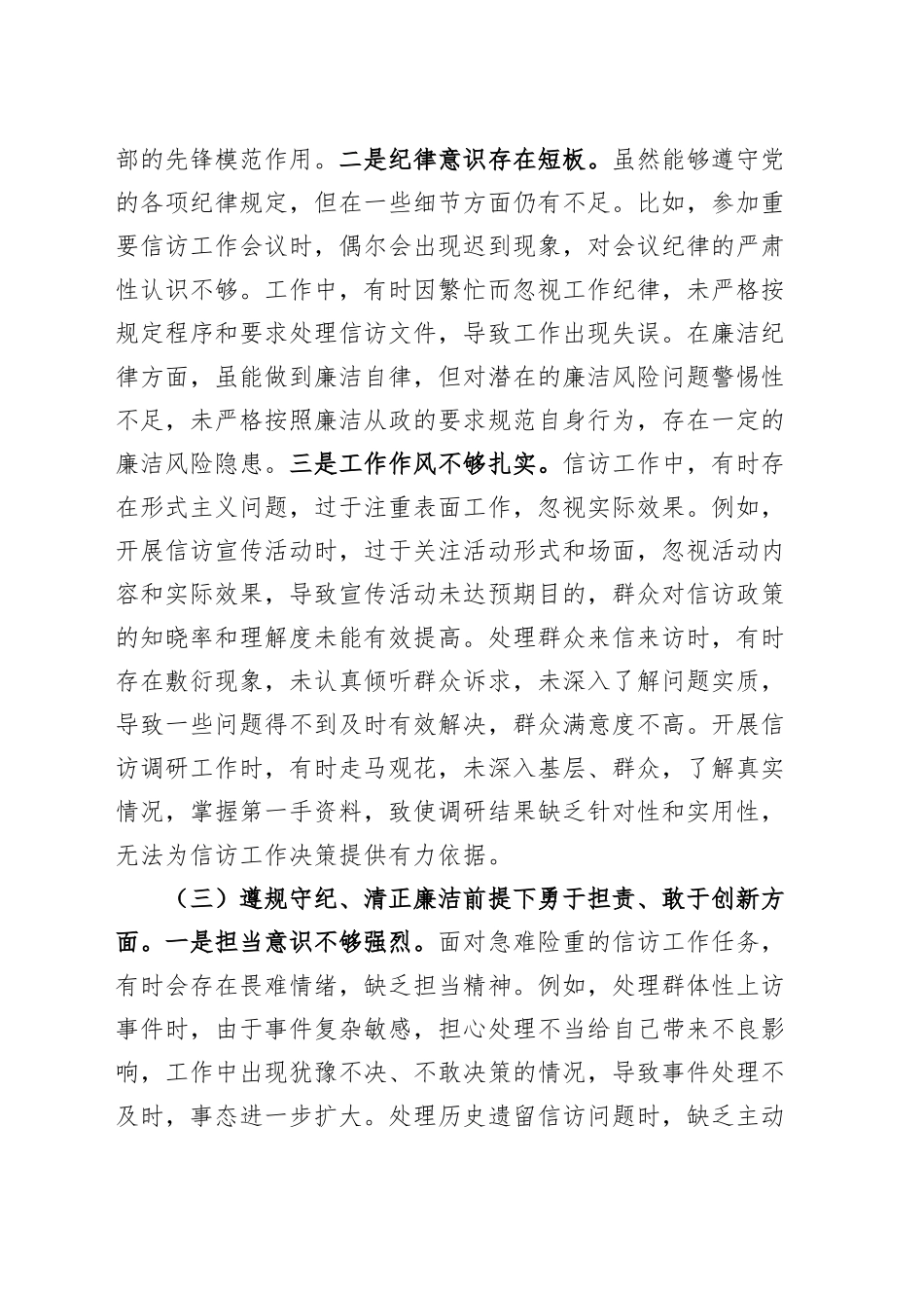 市信访局局长2024年度组织生活会、民主生活会个人对照检查材料根据党支部关于召开2024年度组织生活会的相关要求,我深入研习了党的二十届三中全会精神,全面学习党内法规,包括《中国共产党章程》《条例》以及《中国共产党支部工作条例(试行)》等。同时,我与支部党员展开深入交流,虚心接受批评建议。经全面自查,我深刻反思在“四个带头”方面的不足,明确了改进方向,制定了整改举措。现将个人对照检查情况汇报如下。一、存在的主要问题及表现(一)严守政治纪律和政治规矩,维护党的团结统一方面。一是政治洞察力欠缺。在日常信访工作实践中,我对信访问题背后潜藏的政治风险和意识形态隐患敏感度不足。例如,处理涉及敏感社会议题的信访案件时,仅聚焦于表面诉求的解决,未能深入剖析其可能引发的政治影响和社会舆论导向。对于别有用心之人利用信访渠道传播不实信息、煽动群众情绪的行为,未能及时察觉并妥善应对,未能充分认识到这类行为对社会稳定和党的团结统一的潜在威胁。面对复杂的国际形势和国内热点事件对信访工作的冲击,难以迅速精准把握其中的政治因素,缺乏从政治高度分析和解决问题的意识,致使在处理信访突发事件时,反应迟缓,应对措施不够得力。二是决策部署执行偏差。在落实上级关于信访工作的决策部署过程中,有时存在理解不透彻、执行不到位的状况。比如,在推进信访积案化解专项行动时,虽依要求制定了工作计划,但实际执行中,由于对部分积案的复杂性预估不足,工作推进力度不够,导致部分积案化解进度滞后,未能按时完成任务。对于需结合本地实际细化落实的信访政策,缺乏主动探索和创新精神,习惯于按部就班,未能充分发挥主观能动性,致使政策落地效果未达预期,影响了信访工作的整体推进。三是党内政治生活虚化。参与党内政治生活时,偶尔存在走过场的现象,批评与自我批评不够深刻。在组织生活会和民主生活会上,对其他同志的批评多避重就轻,常以建议代替批评,未能真正达到红脸出汗、触及灵魂的效果。对自身问题的剖析也不够深入,存在遮遮掩掩、避实就虚的问题,未从思想根源查找问题、分析原因。开展党内政治学习时,有时存在敷衍心态,未能真正将学习内容内化于心,导致学习效果不佳,无法将所学知识有效运用到实际信访工作中,难以指导工作实践。(二)增强党性、严守纪律,砥砺作风方面。一是党性修养有待提升。面对复杂的信访工作任务和利益诱惑,偶尔会出现思想波动,缺乏坚定的党性原则。例如,处理涉及多部门利益的信访问题时,不能始终站在党和人民的立场思考问题,过多考虑本部门利益和个人得失,在协调处理过程中出现本位主义和个人主义倾向,影响了问题的有效解决。面对困难和挫折时,缺乏坚定信念和顽强意志,容易产生消极情绪,甚至对工作产生怀疑,影响工作积极性和主动性,未能充分发挥党员干部的先锋模范作用。二是纪律意识存在短板。虽然能够遵守党的各项纪律规定,但在一些细节方面仍有不足。比如,参加重要信访工作会议时,偶尔会出现迟到现象,对会议纪律的严肃性认识不够。工作中,有时因繁忙而忽视工作纪律,未严格按规定程序和要求处理信访文件,导致工作出现失误。在廉洁纪律方面,虽能做到廉洁自律,但对潜在的廉洁风险问题警惕性不足,未严格按照廉洁从政的要求规范自身行为,存在一定的廉洁风险隐患。三是工作作风不够扎实。信访工作中,有时存在形式主义问题,过于注重表面工作,忽视实际效果。例如,开展信访宣传活动时,过于关注活动形式和场面,忽视活动内容和实际效果,导致宣传活动未达预期目的,群众对信访政策的知晓率和理解度未能有效提高。处理群众来信来访时,有时存在敷衍现象,未认真倾听群众诉求,未深入了解问题实质,导致一些问题得不到及时有效解决,群众满意度不高。开展信访调研工作时,有时走马观花,未深入基层、群众,了解真实情况,掌握第一手资料,致使调研结果缺乏针对性和实用性,无法为信访工作决策提供有力依据。(三)遵规守纪、清正廉洁前提下勇于担责、敢于创新方面。一是担当意识不够强烈。面对急难险重的信访工作任务,有时会存在畏难情绪,缺乏担当精神。例如,处理群体性上访...