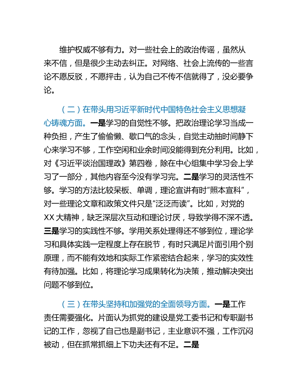 2022年度民主生活会对照检查材料按照有关要求,我在会前认真学习的基础上,对照党的XX大精神和D章党规党纪,结合工作实际,对照六个方面深入查摆自身存在的问题,深刻剖析原因,现将个人对照检查材料汇报如下:一、检视反思查摆存在的主要问题我紧扣此次民主生活会主题,结合个人实际,通过检视反思,主要查摆出以下具体问题。(一)在带头深刻领悟“两个确立”的决定性意义,增强“四个意识”、坚定“四个自信”、做到“两个维护”方面。一是理想信念不够坚定。因为日常工作繁忙放松了对世界观、人生观、价值观的改造,存在抓思想不如抓工作具体、抓修养不如抓行动直接的主观思维,没有把强化理想信念贯穿到日常工作中。比如,工作中偶尔会忽视继承和发扬党的艰苦奋斗、求真务实等优良传统的必要性和紧迫性,对自己党员身份荣誉感、自豪感、责任感有所下降,大局意识、服务意识和群众观念有所减退等现象。二是执行决策不够坚决。在贯彻落实党的路线方针政策,特别是落实区委、区政府重大决策部署方面,存在措施不够精准、成效不够显著等问题,缺少体现特色的创新性招法和举措。三是维护权威不够有力。对一些社会上的政治传谣,虽然从来不信,但是很少主动去纠正。对网络、社会上流传的一些言论不愿反驳,不愿抨击,认为自己不传不信就得了,没必要争论。(二)在带头用习近平新时代中国特色社会主义思想凝心铸魂方面。一是学习的自觉性不够。把政治理论学习当成一种负担,产生了偷偷懒、歇口气的念头,自觉主动抽时间静下心来学习不够,工作空闲和业余时间没能得到充分利用。比如,对《习近平谈治国理政》第四卷,除在中心组集中学习会上学习了一部分,其他内容至今没有学习完。二是学习的灵活性不够。学习的方法比较呆板、单调,理论宣讲有时“照本宣科”,对一些理论文章和政策文件只是“泛泛而读”。比如,对党的XX大精神,缺乏深层次互动和理论讨厌,导致学得不深不透。三是学习的实践性不够。学用关系处理得还不够到位,理论学习和具体实践一定程度上存在脱节,有时只满足片面引用个别原理,而不能有效地和实际工作紧密结合起来,学习的实效性有待加强。比如,将理论学习成果转化为决策,推动解决突出问题不够到位。(三)在带头坚持和加强党的全面领导方面。一是工作责任需要强化。片面认为抓党的建设是党工委书记和专职副书记的工作,忽视了自己也是副书记,主业意识不强,工作沉闷被动,但在抓常抓细上下功夫还有不足。二是党建工作缺乏特色亮点。对新时代下加强街道党的建设思考不够,工作没有出特色、出亮点、出实效,没有争取很多省市基层治理的试点示范项目。三是落实民主集中制质量不高。与干部之间谈心交心少、互相批评就更少,到社区了解工作不敢触及敏感问题,有时甚至回避矛盾问题,存在“只求不出事,宁愿不做事”的错误思想和偏激行为。比如,工作中不敢担当,一些小事都要层层上报,自己不表态或模糊表态,依靠“一把手”和党工委拍板决定,影响了工作效率。(四)在带头坚持以人民为中心的发展思想,推动改革发展稳定方面。一是联系服务群众不紧密。到社区开展工作,多数时候,也是浮光掠影地看看,针对基层提出的实际困难和问题,轻描淡写地做要求,做表面文章多,解决实际问题少。比如,除陪同区级领导到社区调研外,主动到社区开展工作较少,作深入系统的专题调研就更少。二是破解民生难题缺方法。在抓民生工作落实上,工作要求都是“一个标准”“一刀切”,导致民生任务难落实、难完成。三是化解遗留问题有差距。针对历史遗留问题,缺乏系统深入的研究,没有拿出形式有效的解决办法。(五)在带头发扬斗争精神,防范化解风险挑战方面。一是争先意识有所减弱。工作中缺少干就干到极致、做就做到最好的精神,有时候只求过得去、不求过得硬,没有牢固树立好每项工作都要争第一、创唯一的对标赶超精神。二是担当精神有待加强。在工作中有“软怕躲退”的现象,对矛盾不敢触及、怕担责任,特别是城市管理中涉及部门、属地合力推动的问题,有推诿思想和懈怠情绪。三是开拓进取精神有所松懈。对一些重点工作能常抓不懈,对一些常规性的日常工作,年初安排后疏于...