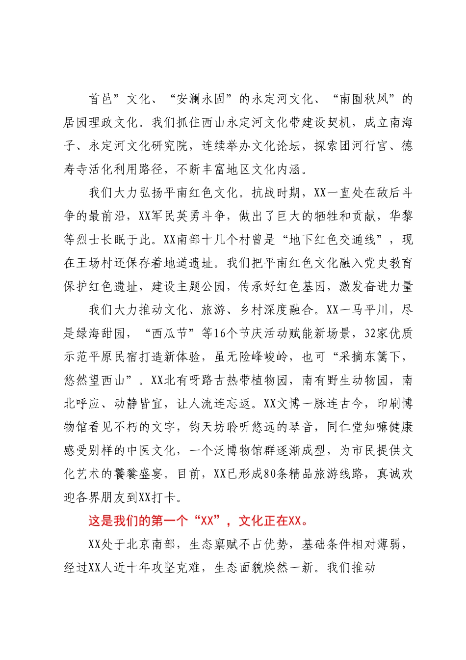在“一把手”谈贯彻落实党的XX大精神系列主题新闻发布会X区专场上的发言党的XX大以来,XX区深入学习宣传贯彻党的XX大精神,与学习贯彻习近平新时代中国特色社会主义思想相结合,与学习贯彻习近平总书记对北京一系列重要讲话精神相结合,特别是,深情感恩习近平总书记五次亲临XX的关怀厚爱,深刻认识“要把XX建设好”和“国家发展新动力源”的重大责任,切实把思想和行动统一到党中央的大政方针和市委的战略部署上来,努力谱写好全面建设社会主义现代化的XX篇章。“XX”一词寓意美好,是名词,也是动词,还是形容词。XX贯彻党的XX大精神,落实到具体工作中,就是坚持首善标准,XX调查研究,求真务实、埋头苦干,推动各项事业XX起来,保持“风生水起看XX”的良好态势,全面建设宜居宜业新XX、繁荣开放新国门,为实现中华民族伟大复兴贡献XX力量。今天,重点向大家介绍我们推动文化、生态、民生、产业、城市、乡村“六个XX”的情况。今年是北京建都870周年,也是XX得名870年。XX文脉源远、地位特殊,史称“天下首邑”。我们推动文化XX,就是立足北京文化中心建设,深入挖掘和大力弘扬XX历史文化,增进文化自信自强,增强新征程上的精神力量。我们大力传承中华优秀传统文化。XX有源远流长的“天下首邑”文化、“安澜永固”的永定河文化、“南囿秋风”的居园理政文化。我们抓住西山永定河文化带建设契机,成立南海子、永定河文化研究院,连续举办文化论坛,探索团河行宫、德寿寺活化利用路径,不断丰富地区文化内涵。我们大力弘扬平南红色文化。抗战时期,XX一直处在敌后斗争的最前沿,XX军民英勇斗争,做出了巨大的牺牲和贡献,华黎等烈士长眠于此。XX南部十几个村曾是“地下红色交通线”,现在王场村还保存着地道遗址。我们把平南红色文化融入党史教育保护红色遗址,建设主题公园,传承好红色基因,激发奋进力量我们大力推动文化、旅游、乡村深度融合。XX一马平川,尽是绿海甜园,“西瓜节”等16个节庆活动赋能新场景,32家优质示范平原民宿打造新体验,虽无险峰峻岭,也可“采摘东篱下,悠然望西山”。XX北有呀路古热带植物园,南有野生动物园,南北呼应、动静皆宜,让人流连忘返。XX文博一脉连古今,印刷博物馆看见不朽的文字,钧天坊聆听悠远的琴音,同仁堂知嘛健康感受别样的中医文化,一个泛博物馆群逐渐成型,为市民提供文化艺术的饕餮盛宴。目前,XX已形成80条精品旅游线路,真诚欢迎各界朋友到XX打卡。这是我们的第一个“XX”,文化正在XX。XX处于北京南部,生态禀赋不占优势,基础条件相对薄弱,经过XX人近十年攻坚克难,生态面貌焕然一新。我们推动生态XX,就是大力践行绿水青山就是金山银山的理念,深入推进环境污染防治,打造蓝天白云、河清岸绿、土净花香的良好生态。我们巩固拓展大气污染治理成果。坚持一微克一微克地抠,采取首推全域禁放等硬措施,空气质量每年刷新纪录,改善幅度全市第1,去年重污染天数首次清零。未来我们还将保持治理不松劲,加大精细化治理力度,推动大气质量持续改善。我们加快改善全域水生态。XX全区为永定河冲积平原。历史上,永定河改道留下的故道就成为今天遍布XX的河流,名字也非常吉祥如意,叫新凤河、老凤河、小龙河、大龙河。目前,全区骨干河道21条,总长421公里。我们统筹水资源、水环境、水生态治理,做好做足水文章。伴随永定河全线通水,百里画廊正徐徐展开。我们积极创建森林城市。大力实施平原造林、临时绿化,森林覆盖率提升至35.37%,在南部形成“森林环抱中的机场”生态国门印象。累计建成公园73个,南五环沿线狼垡、五福堂等公园串珠成链。近两三年,对环境极为挑剔的震旦鸦雀、黄胸、白鹀尾海雕等珍稀鸟类纷纷落户。这是我们的第二个“XX”,生态正在XX。XX一切工作的最终目的,都是为了让群众幸福,为身在XX而自豪(让XX人感到自豪,就得生活一天比一天好,有良好生态环境,有好的房住,有好的教育医疗,充分的就业,便利的交通)。我们推进民生XX,就是坚持人民至上,聚焦“七有”“五性”,不断提高群众的获得感、幸福感、安全感。我们用心办好民生实事。坚持党委政府过紧日子、群众过好日子,将每年一半以上的公共预算...